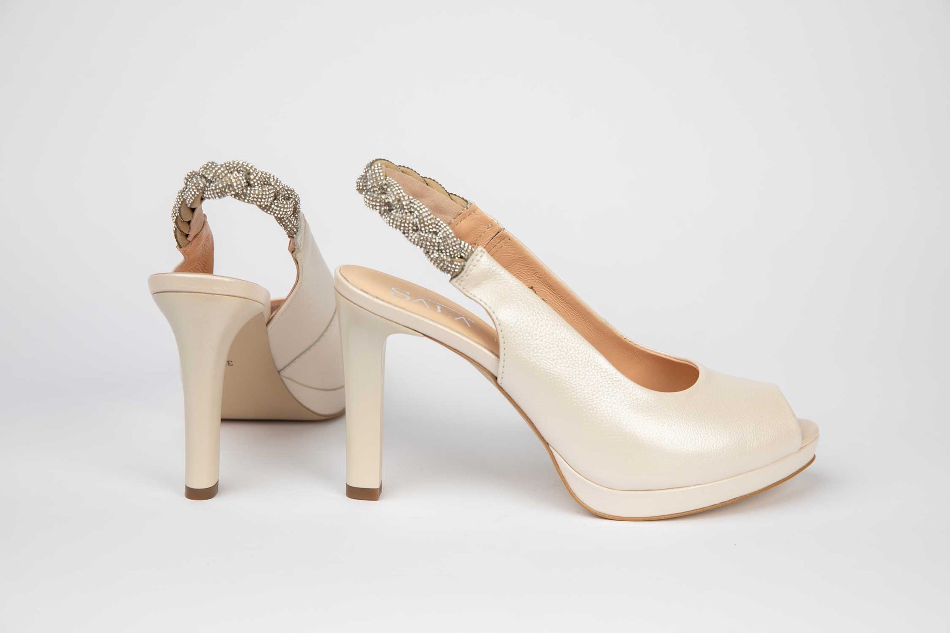 The SALA creative line correctly combines elegant design with appropriate comfort thanks to the last, the inclination and a high quality natural leather used for simple models in a multitude of colors, textures and variations to which is added the medium heel tested to suit any woman. The fastening is made with a crystal strap with elastic above the heel, and in the front it has a 1 cm platform.