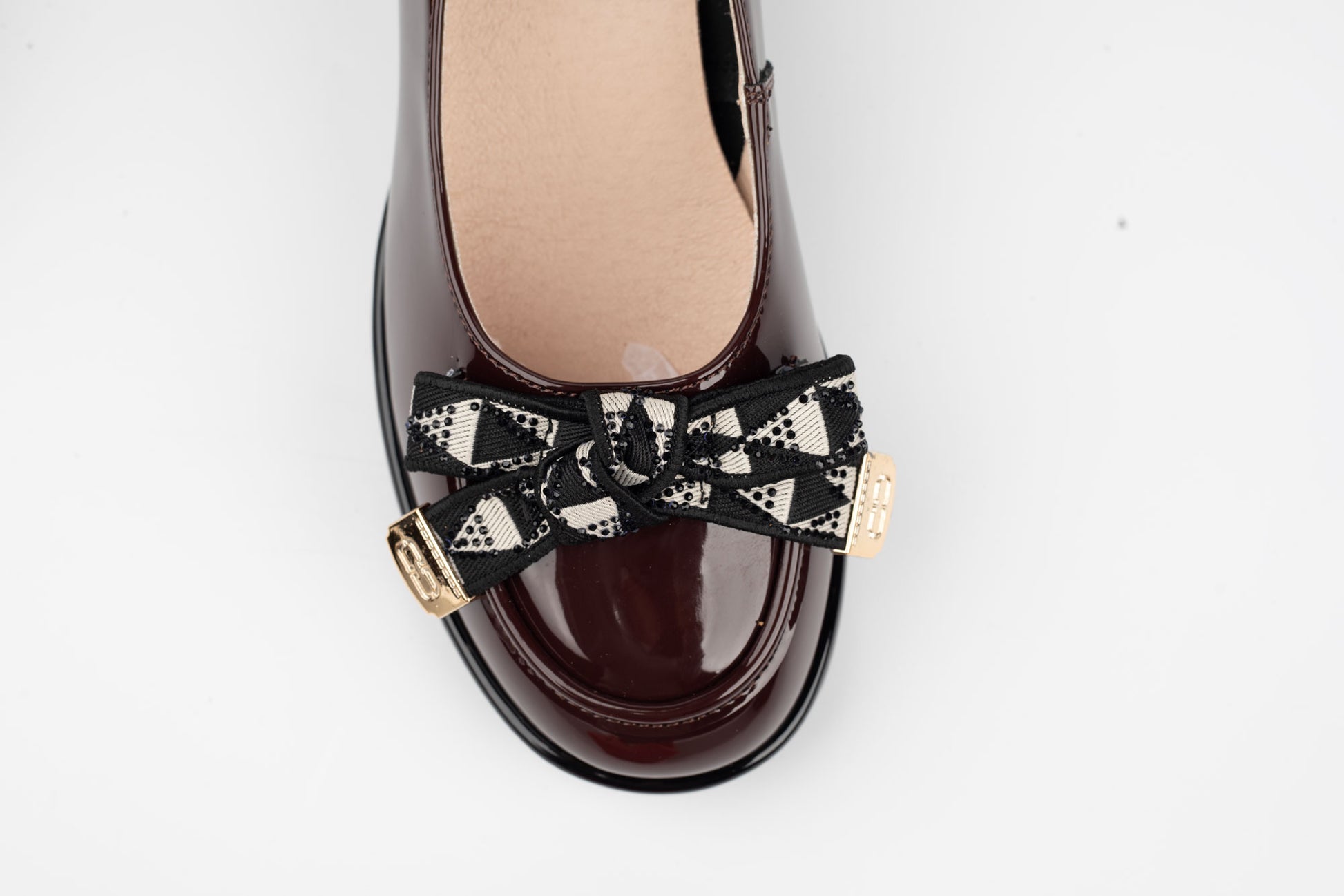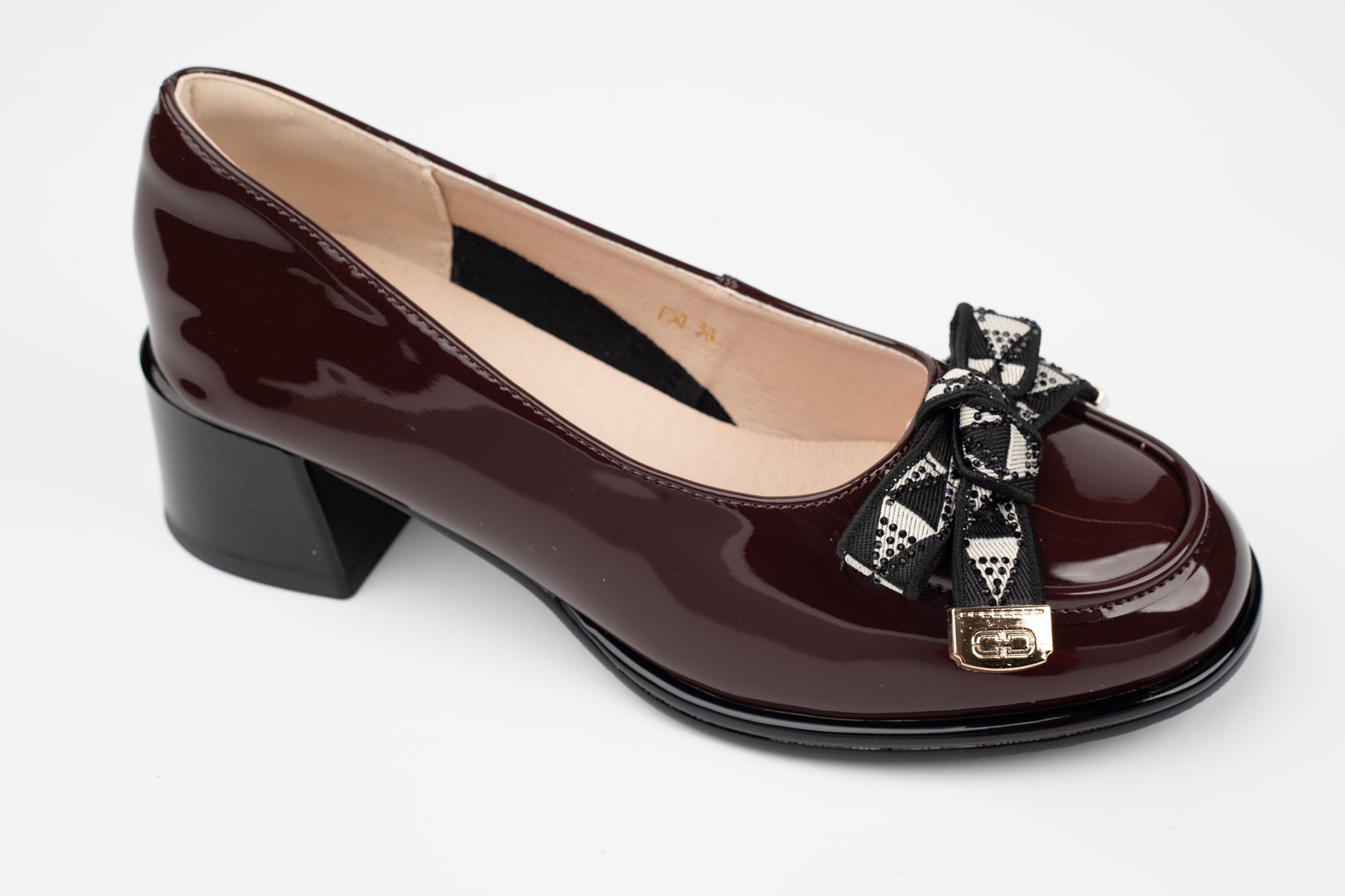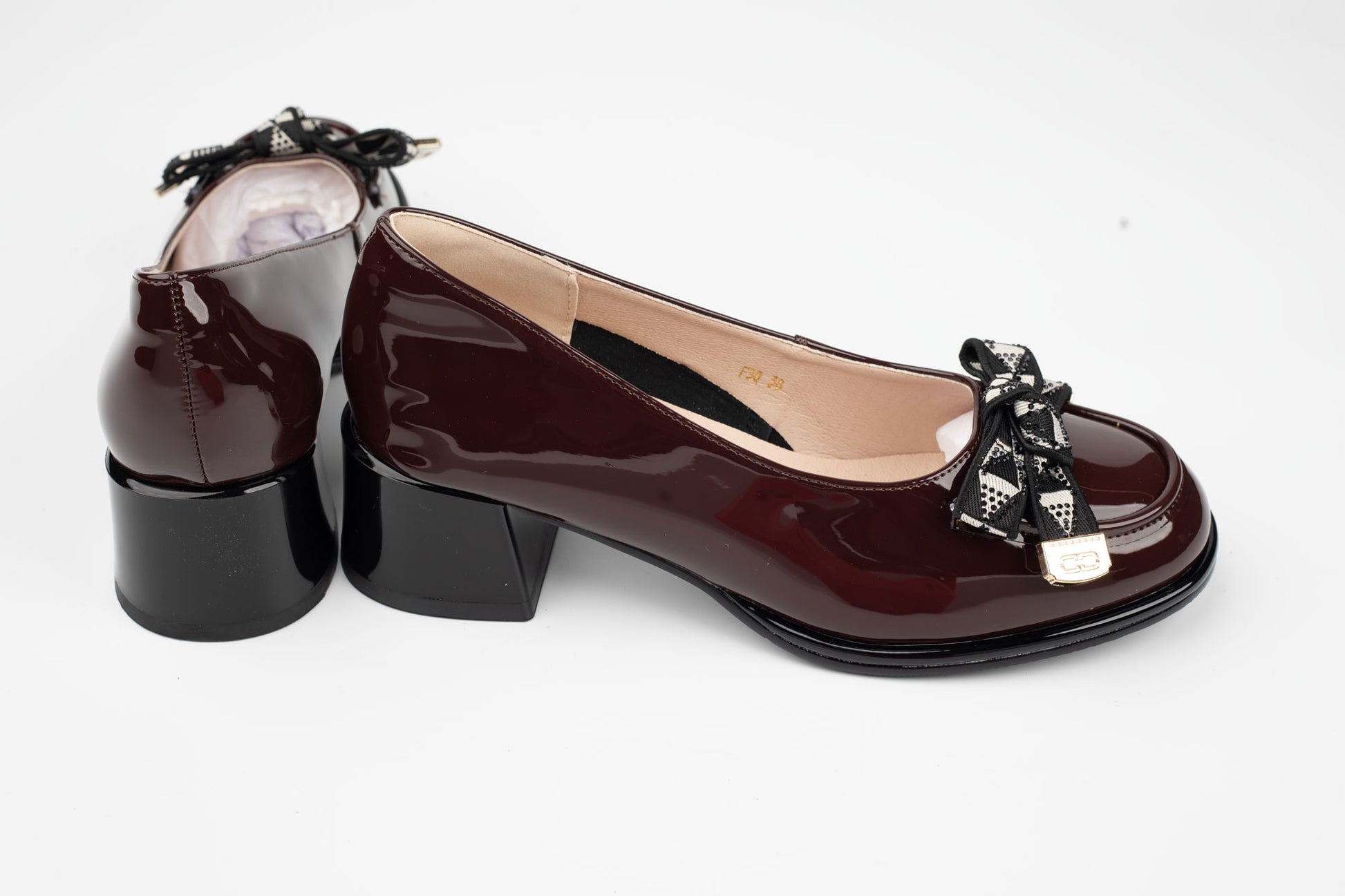 Pantofi FORMAZIONE de dama din piele naturala lacuita cu toc patrat lucios, accesorizat cu o fundita.Pielea este foarte moale si ofera maximum de confort la purtare indelungata, Talpa este usoara, flexibila iar pe interior detine un brant cu memory.
