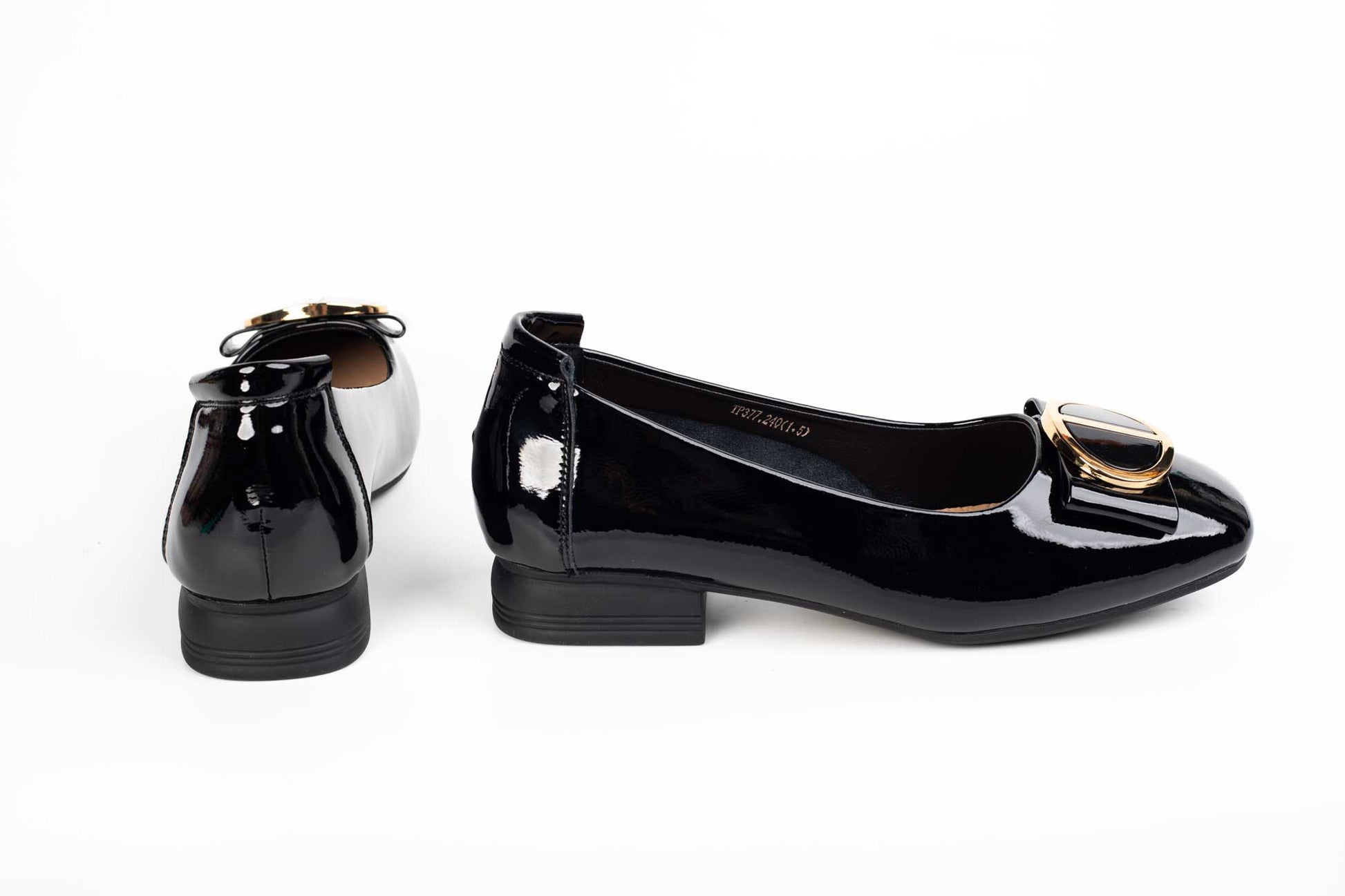 FORMAZIONE women's shoes made of natural patent leather with a low ballerina-type sole, accessorized with a special metal accessory. The leather is very soft and offers maximum comfort for long wear. The sole is light, flexible and has a memory insole on the inside. The weight of a single foot is 197 grams.
