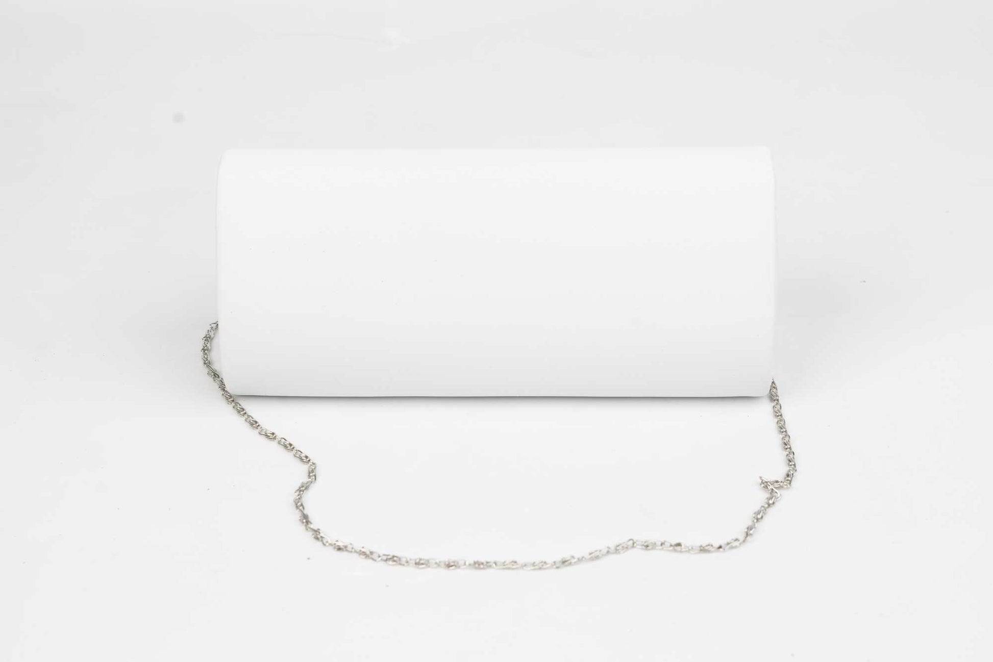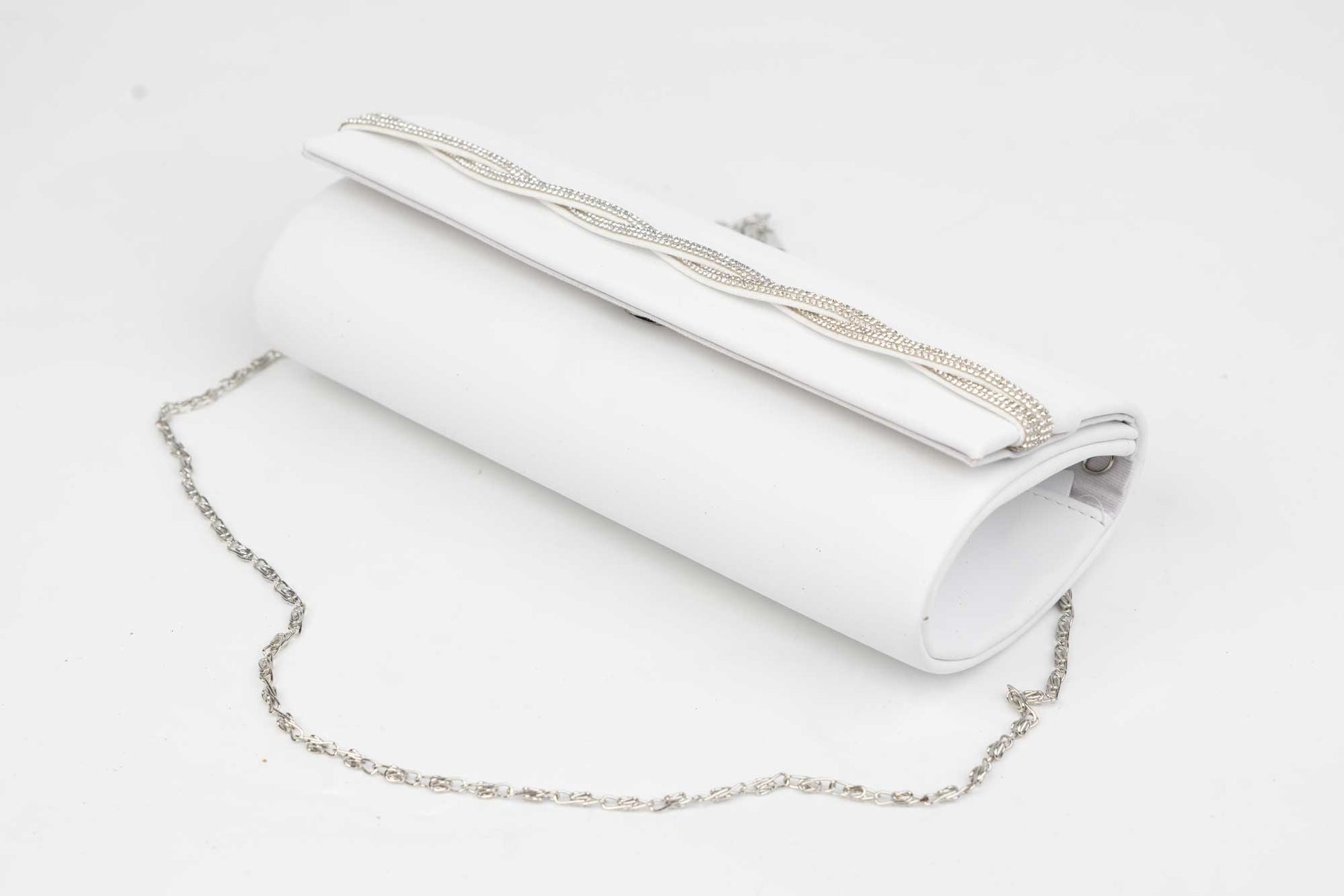 A ladies' envelope measuring 23-11 cm with silver glitter elements and featuring a detachable metal chain strap. The interior is single-chamber (1 compartment) and is suitable and roomy for a phone or cosmetics. The closure is made with a metal flap with a magnet on the side of the envelope.