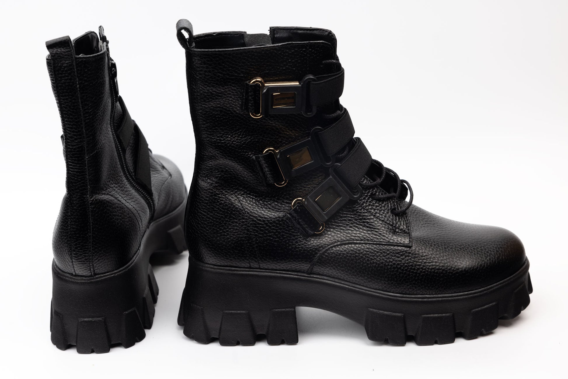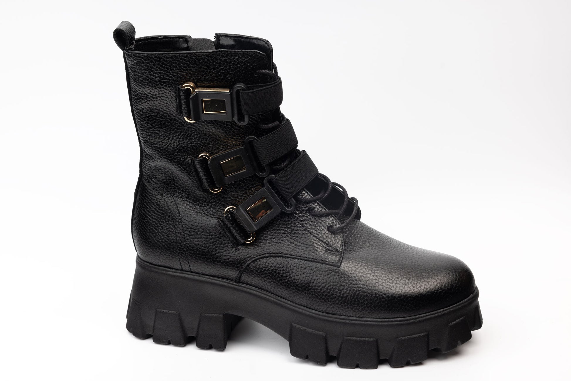 PERLA women's boots made of moisture-resistant natural leather with laces and side zipper, thick non-slip serrated heel sole with round toe, comfortable and lightweight. The weight of a single leg is 370 grams. On the front it has accessories attached to elastic bands that are just for design.