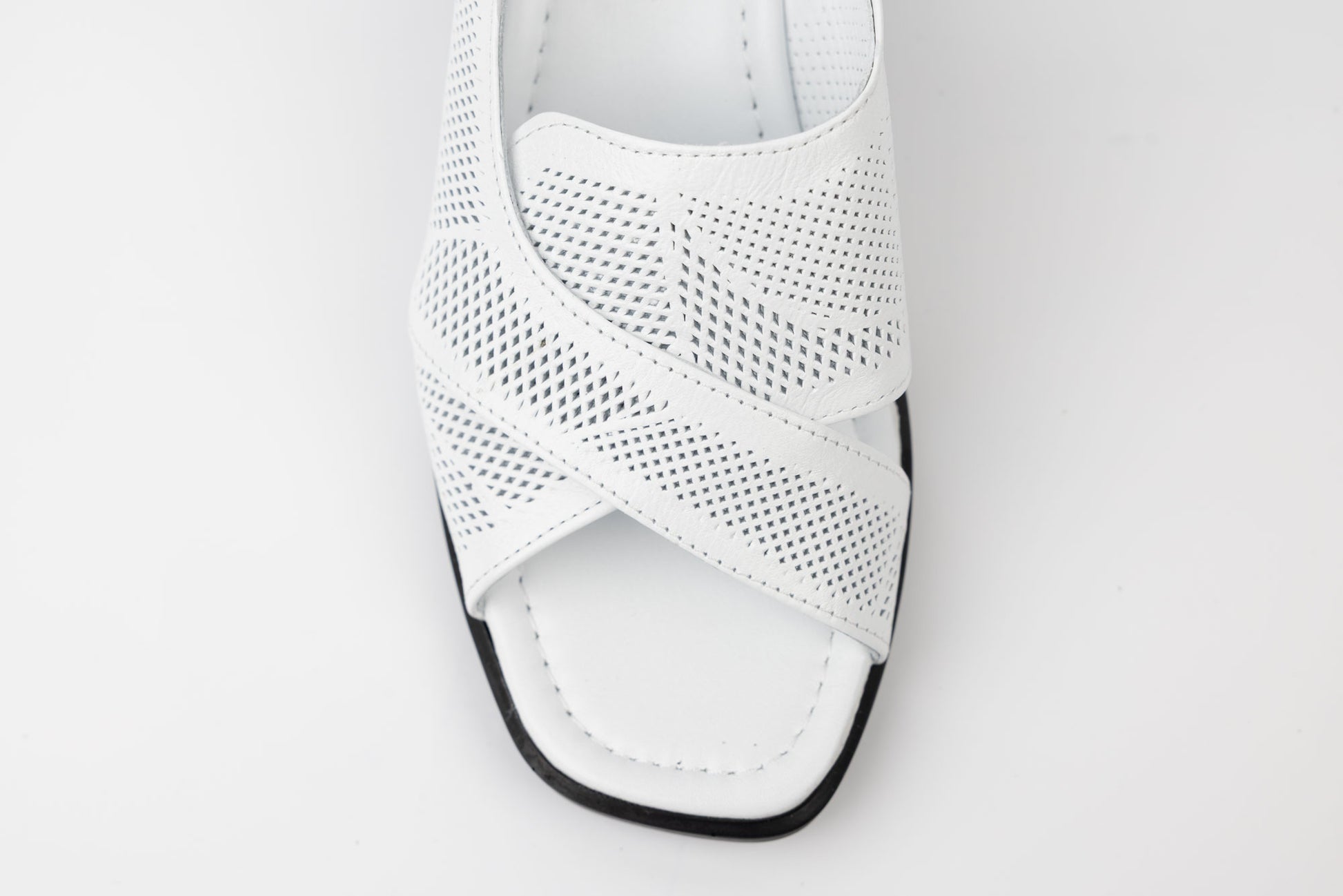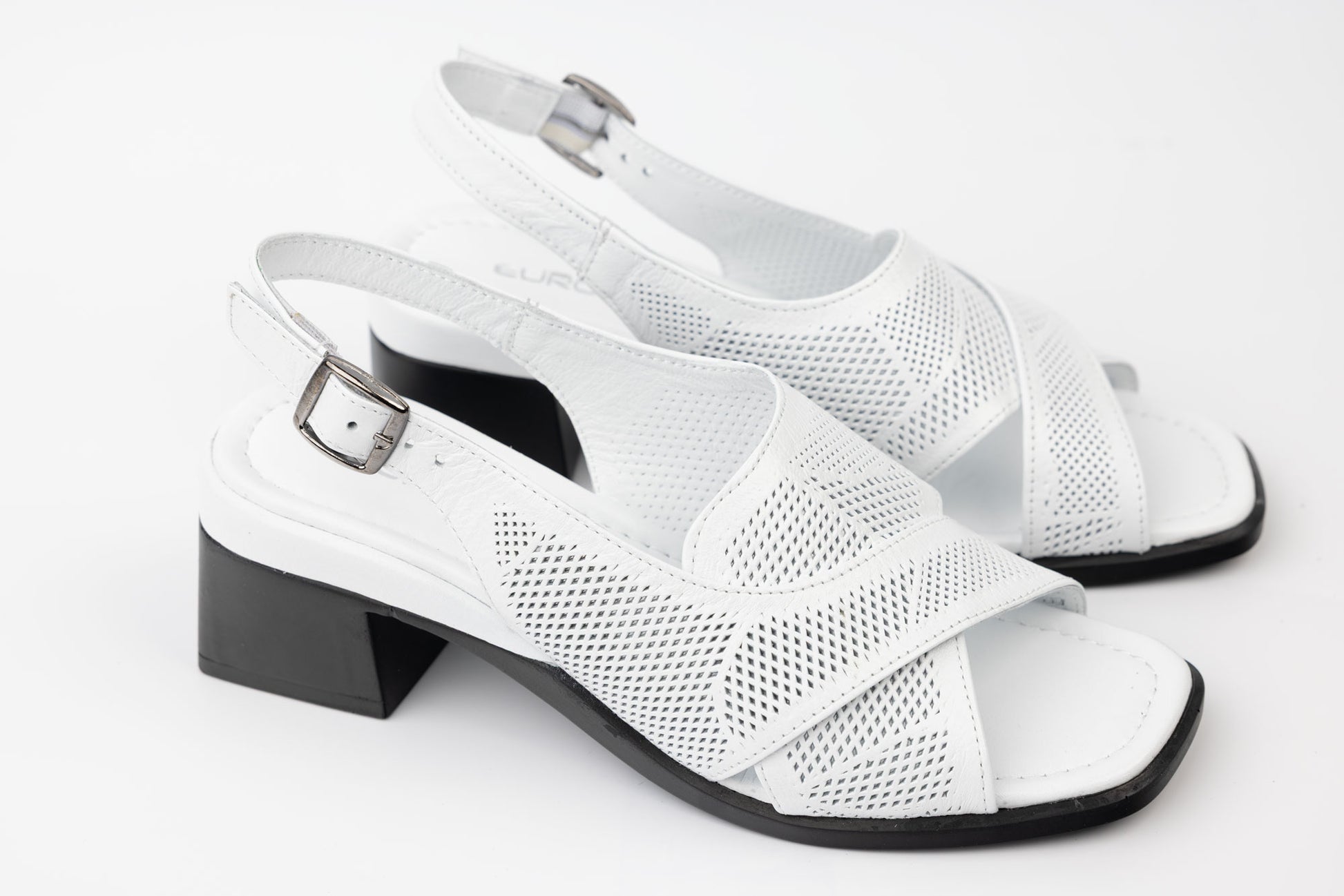 LSD women's sandals made of natural leather with a molded sole with a thick square heel, lined on the inside with natural leather and fastened with a buckle on a strap behind the foot. The smooth inclination of the foot in these sandals makes them much more comfortable to wear for a long time, being recommended even for feet with bunions because they cover them completely. The weight of a single foot is 250 grams.