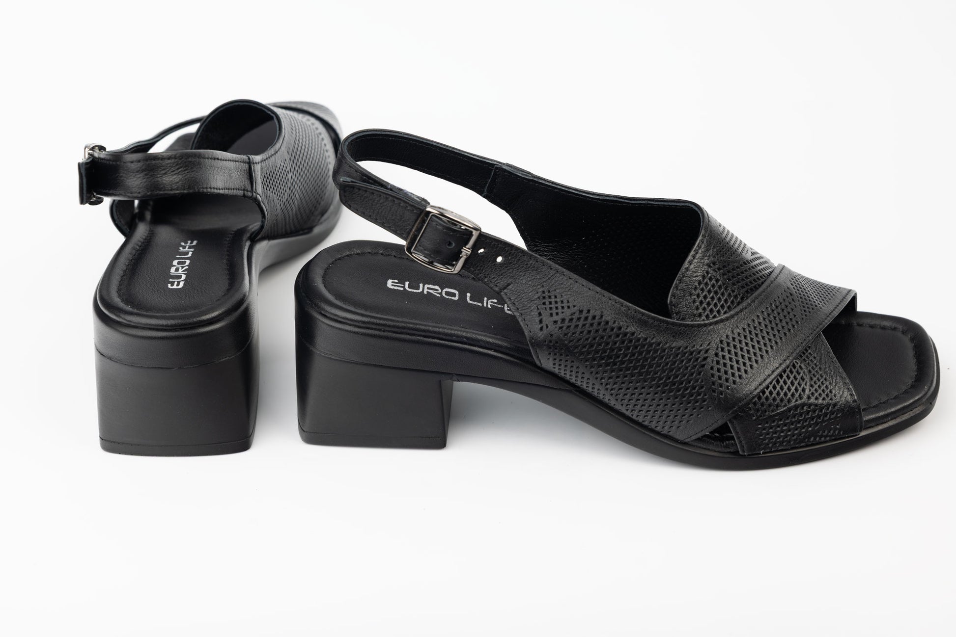 LSD women's sandals made of natural leather with a molded sole with a thick square heel, lined on the inside with natural leather and fastened with a buckle on a strap behind the foot. The smooth inclination of the foot in these sandals makes them much more comfortable to wear for a long time, being recommended even for feet with bunions because they cover them completely. The weight of a single foot is 250 grams.