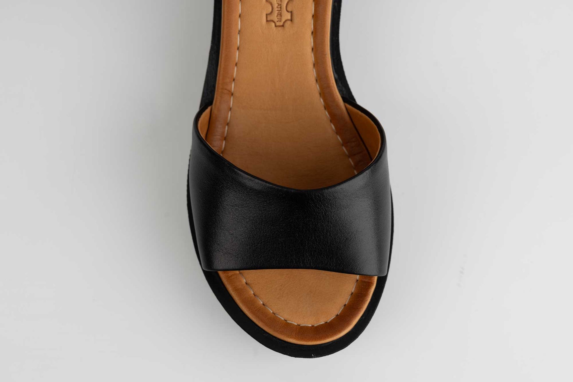 DOGATI women's sandals made of natural leather with a thick orthopedic sole, lined with natural leather on the inside and fastened with a buckle on a strap behind the foot. The smooth inclination of the foot in these sandals makes them much more comfortable to wear for a long time, being recommended even for feet with bunions because they cover them completely. The weight of a single foot is 250 grams.