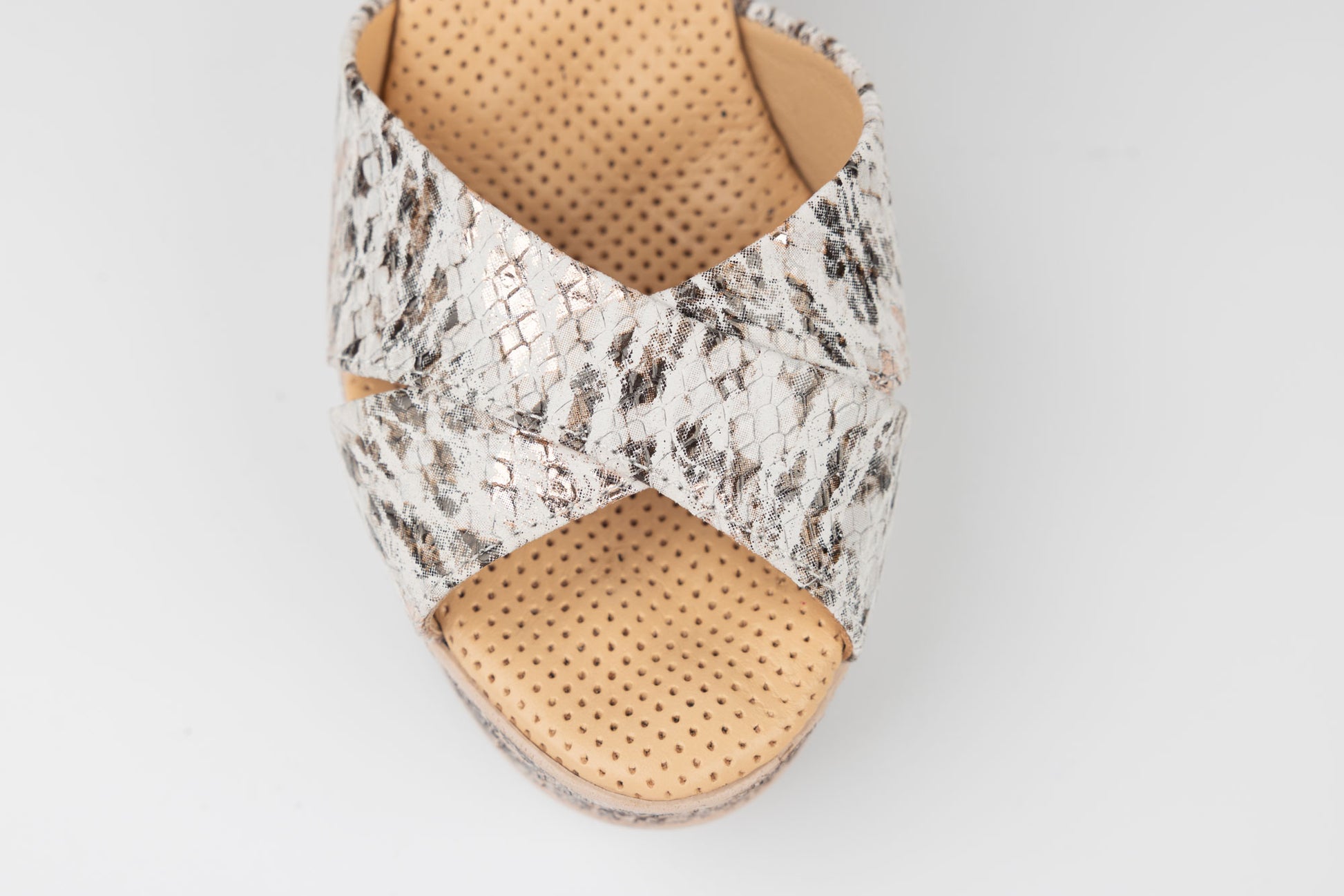 LSD women's sandals made of natural leather with a thick orthopedic sole, lined with natural leather on the inside, fastened with a buckle on a strap behind the foot. The smooth inclination of the foot in these sandals makes them much more comfortable to wear for a long time, being recommended even for feet with bunions because they cover them completely. The weight of a single foot is 250 grams.