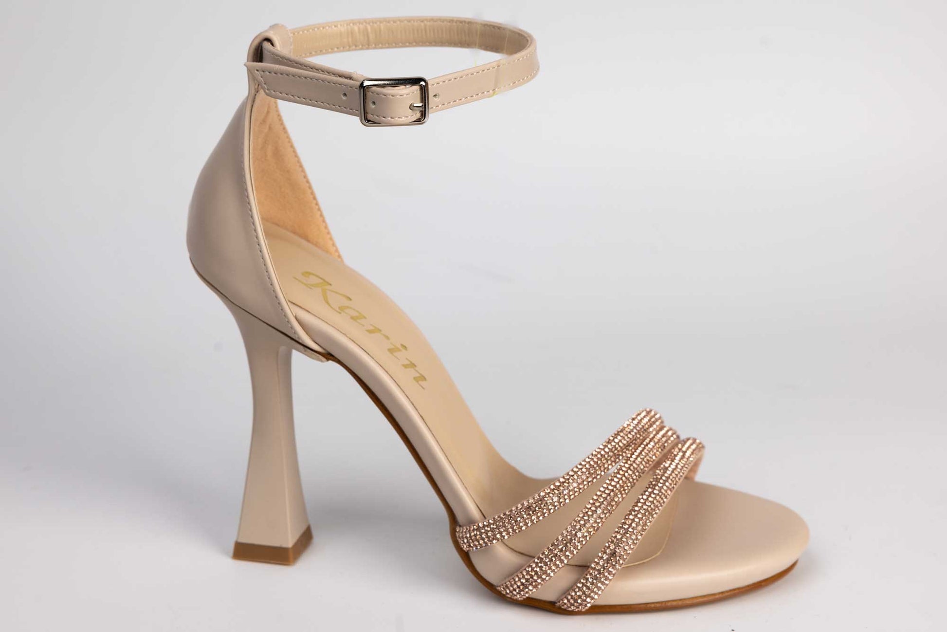 KARIN women's sandals made of quality eco-leather with a 10 cm high flared heel. The weight of a single foot is 218 grams. The fastening is done with a strap above the ankle for better fixation of the foot. The front part is made of 3 straps with crystals which makes this sandal very elegant and comfortable.
