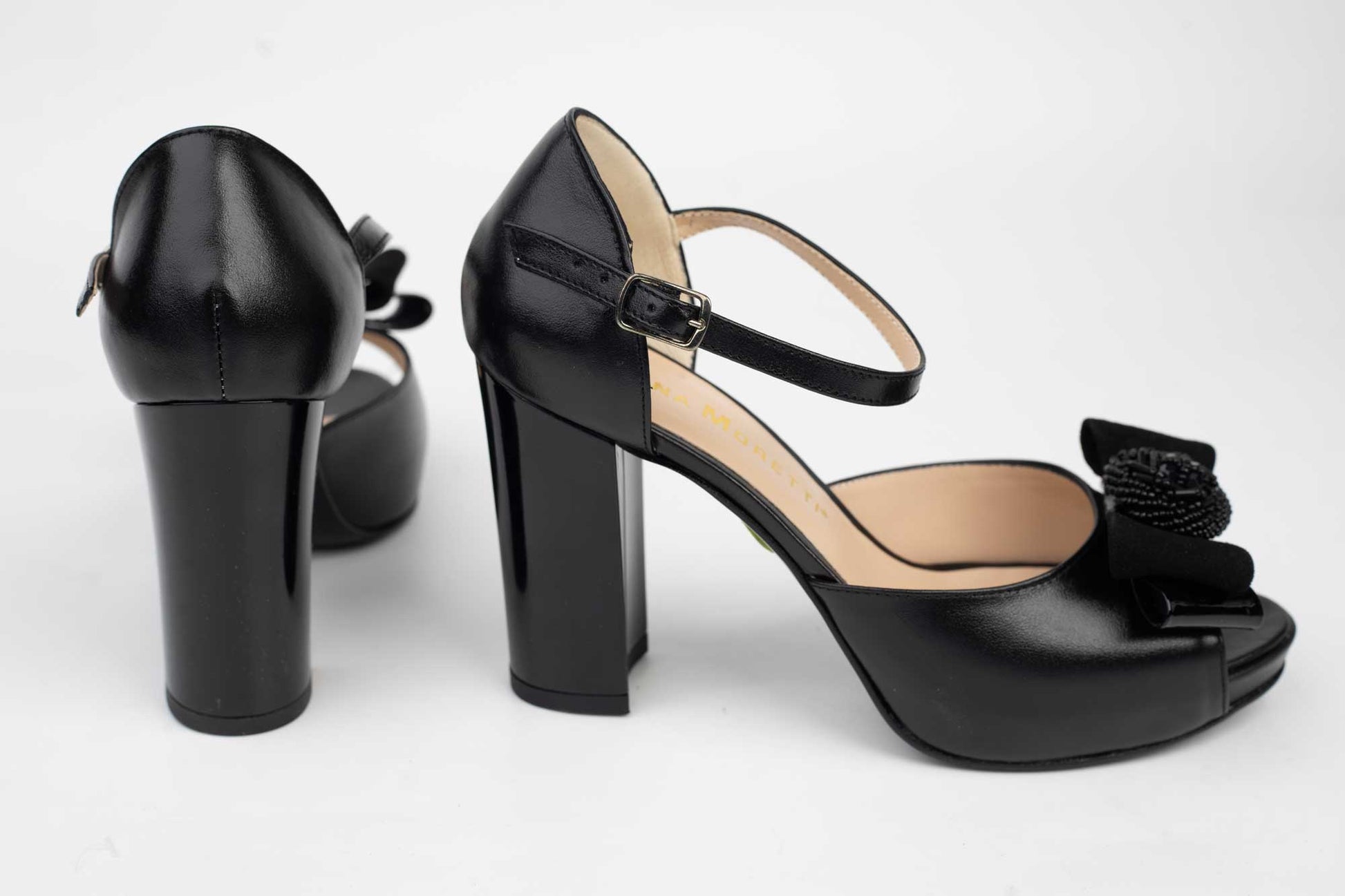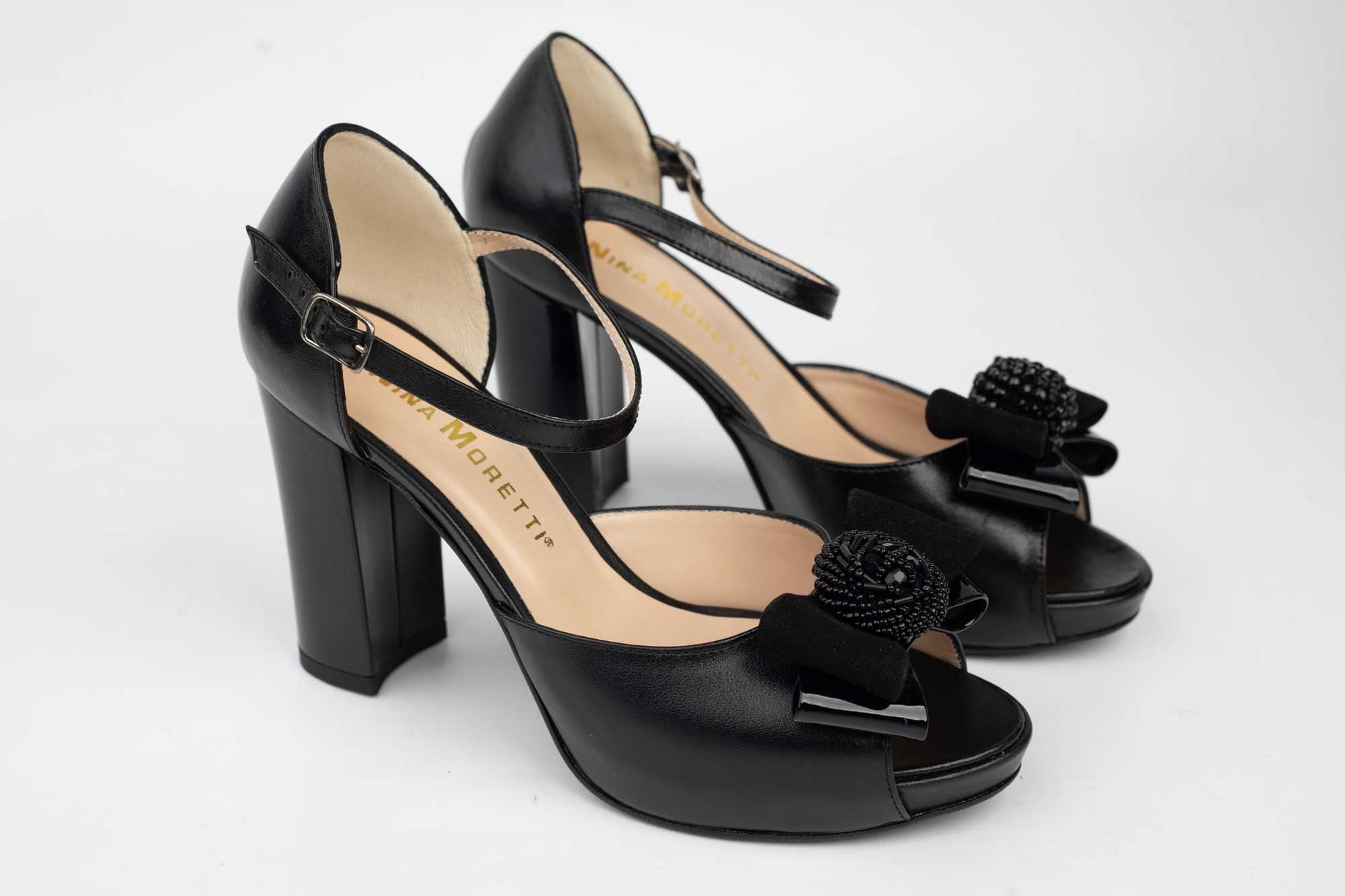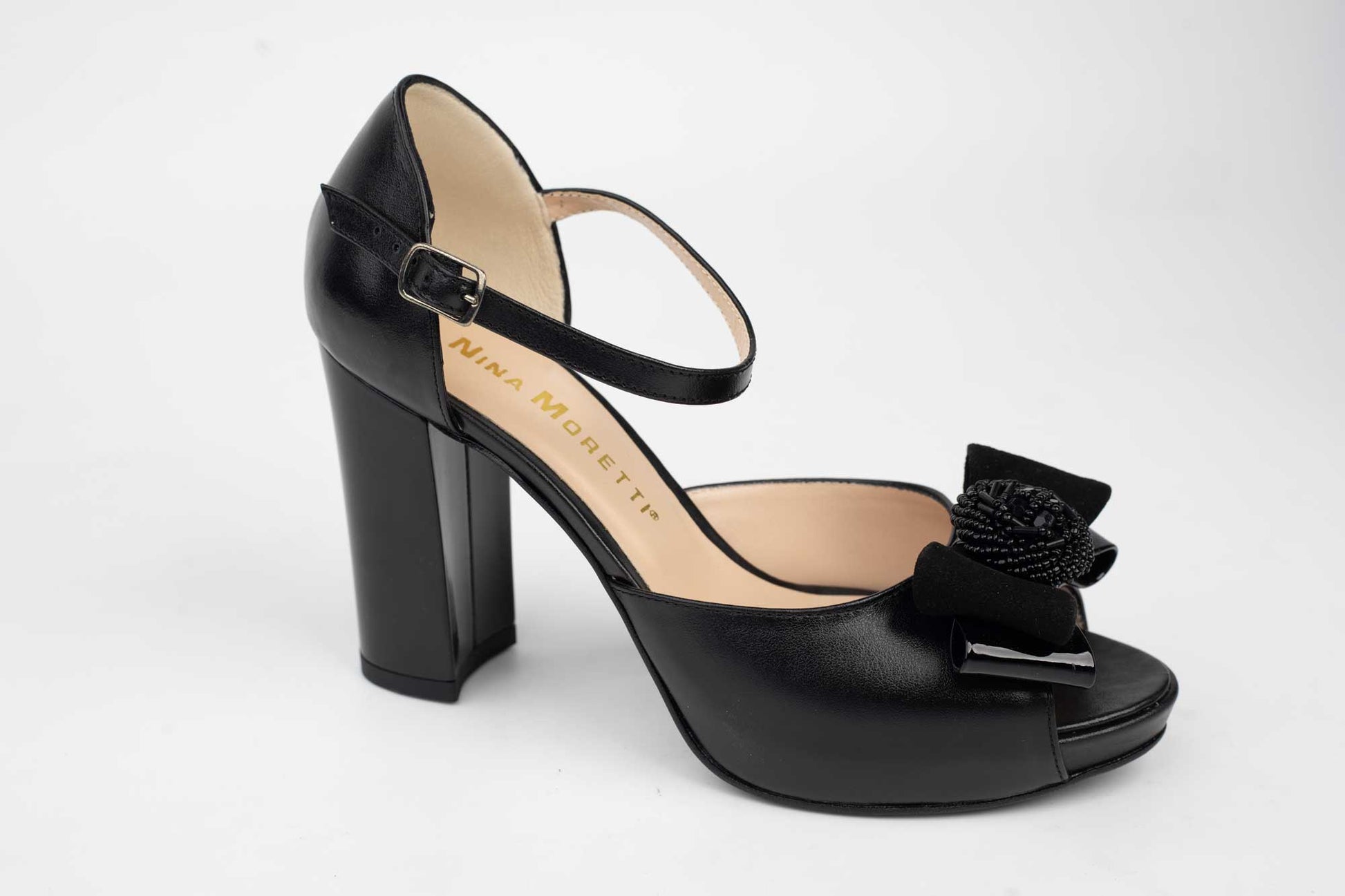 NINA OCHINNI women's sandals made of natural leather with a thick 10 cm high heel, very stable when walking, with a 1 cm high platform at the front that gives a smooth and comfortable inclination to the foot. The ankle is fastened with a thin strap in a fine buckle. On the top it has a leather accessory and a beautiful black pearl flower. The sandal is sold both with and without the accessory attached. Sizes from 34 to 41.