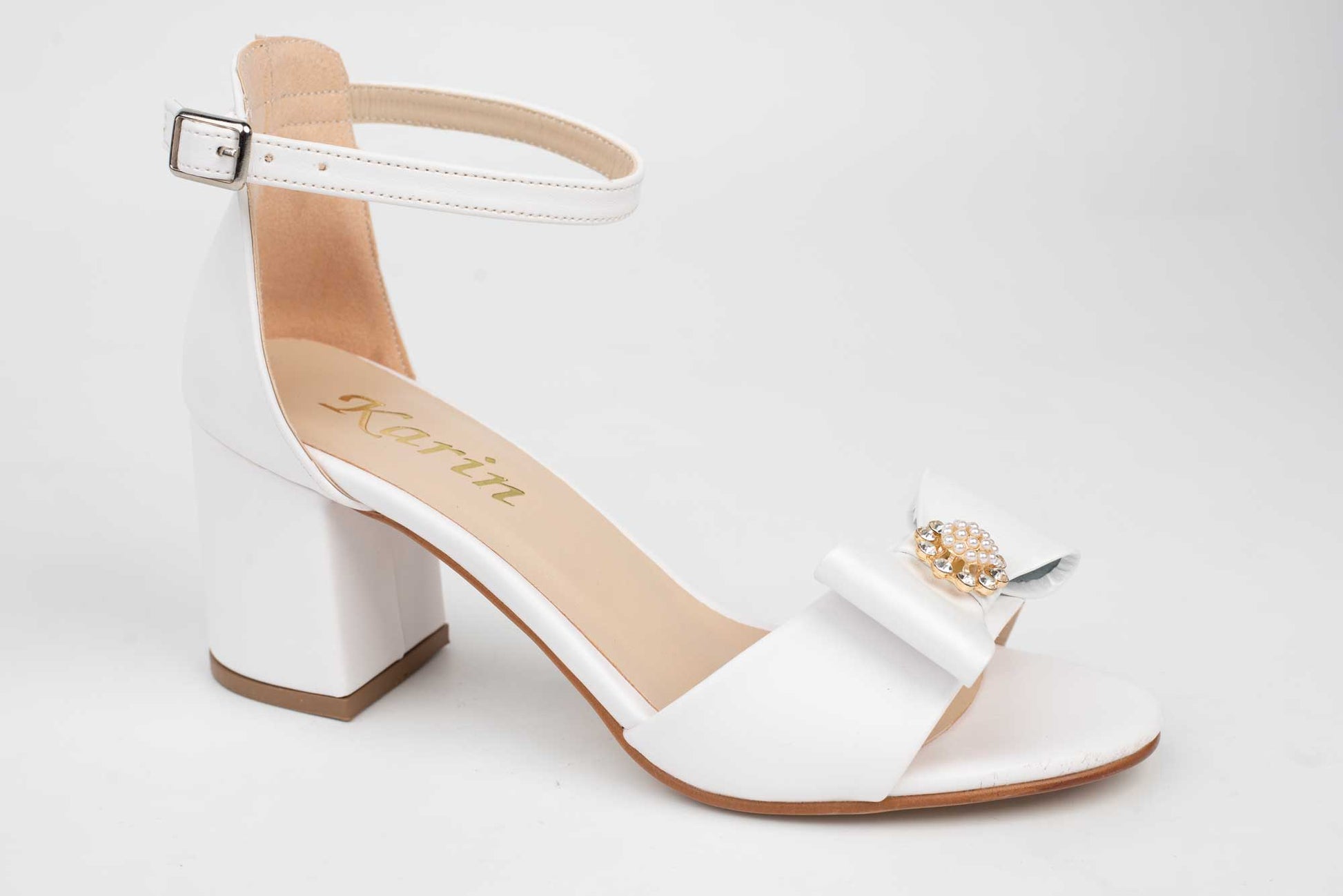 KARIN women's sandals made of quality eco-leather with a thick square heel of 6 cm dressed in the same color, having as an accessory mounted in front a natural leather bow with a metal flower with pearls. The weight of a single foot is 175 grams. The fastening is made with a thin strap that is fastened above the ankle for better fixation of the foot.