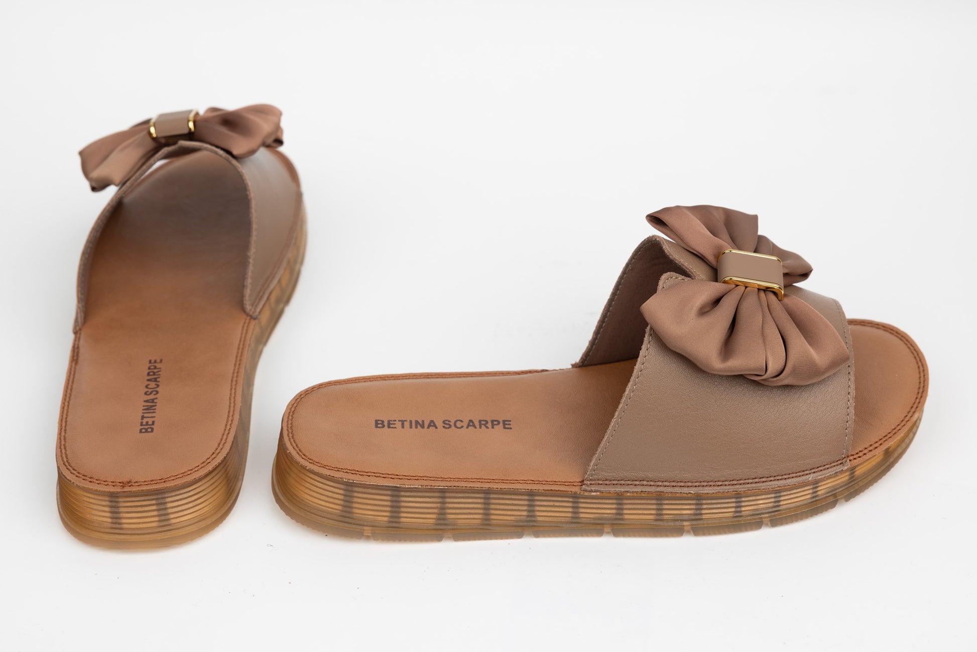 Women's BETINA flip-flops made of natural leather with a created bow accessorized with a bow, with a 1 cm thick sole, very soft and elastic, with a memory foam insole, making this model a very appreciated and comfortable model for long-term wear. The weight of a single flip-flop is 235 grams.