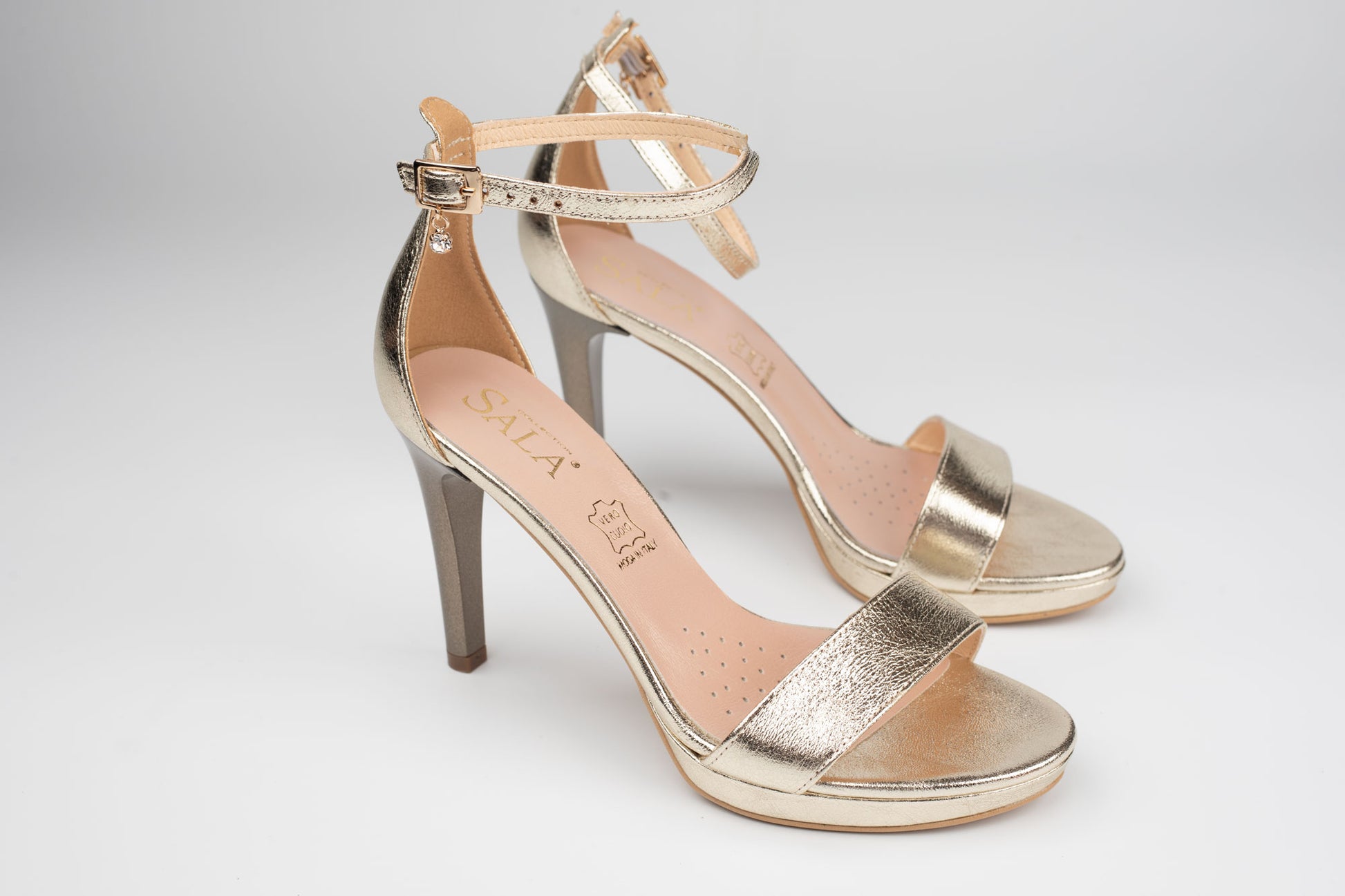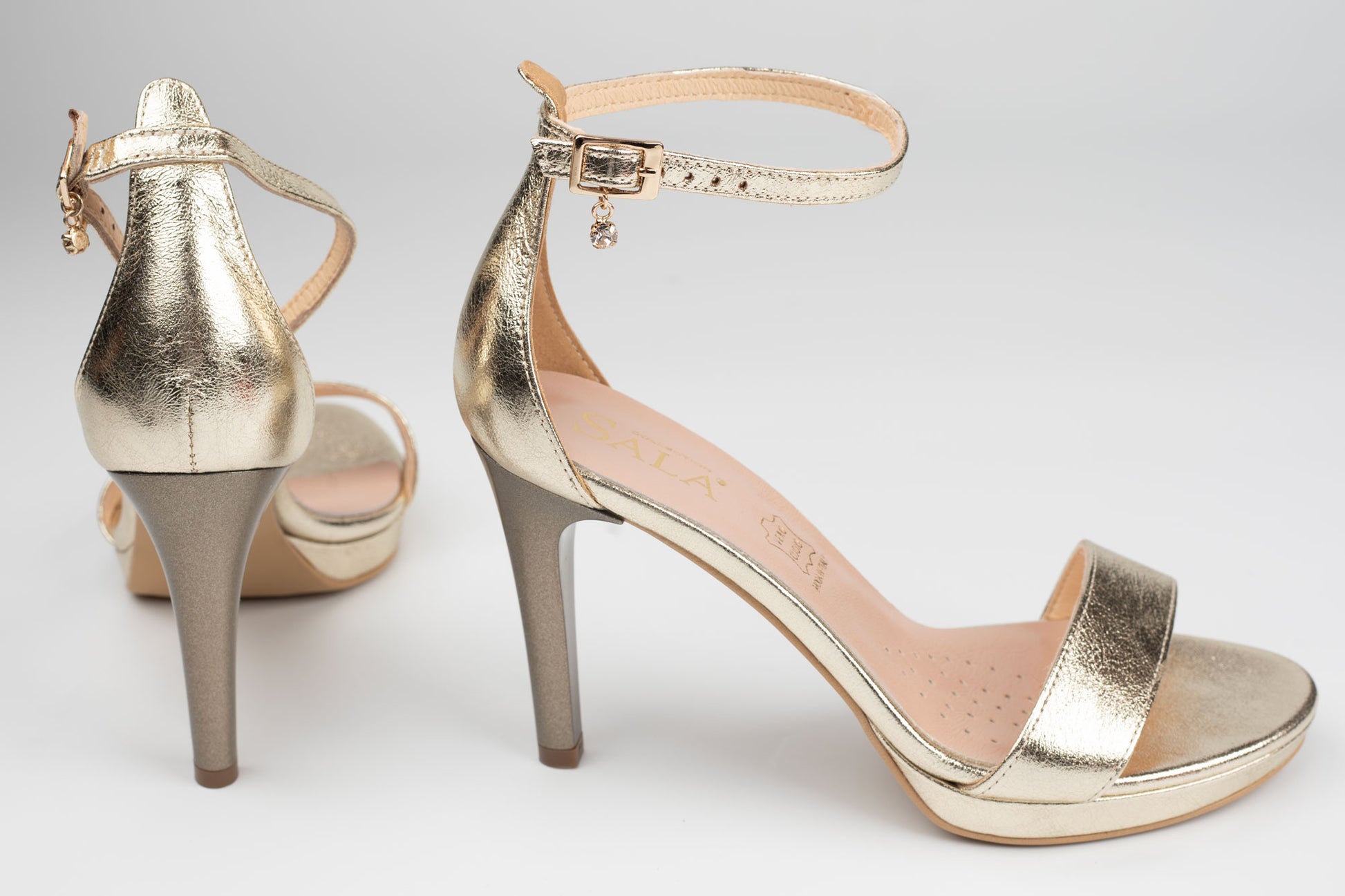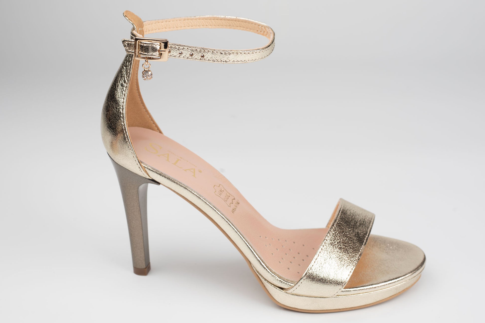Sandale SALA de dama din piele naturala de calitate avand un toc stiletto de 8 cm inaltime. Greutatea unui singur picior este 245 grame. Prinderea se face cu o bareta subtire deasupra gleznei pentru o fixare mai buna a piciorului. Partea din fata este alcatuita din 2 barete care face aceasta sandala sa fie una foarte eleganta si comoda. Platforma frontala are 1 cm grosime.
