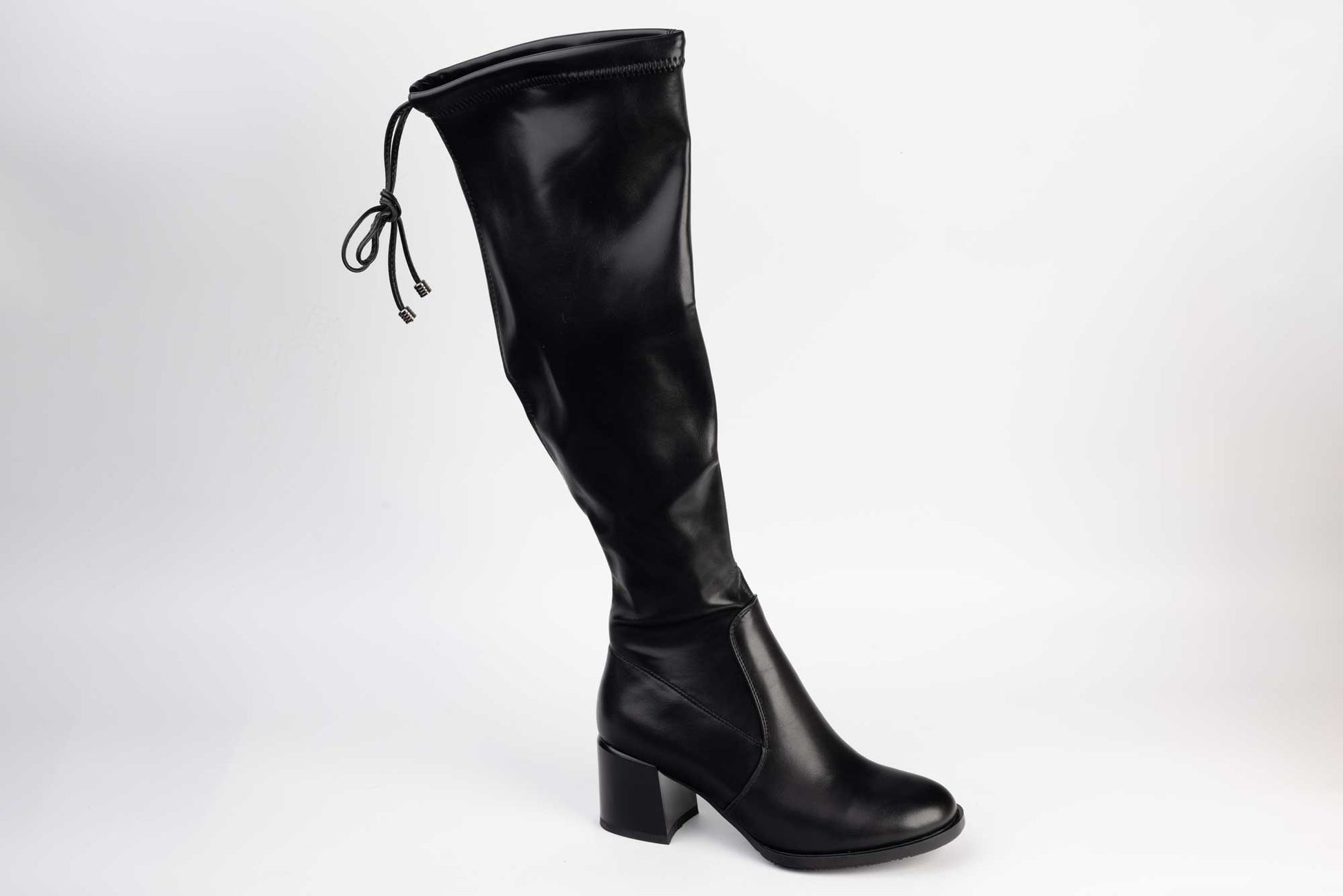 MYU women's boots made of elastic stretch with a 6 cm square heel and a side zipper allowing it to reach the knee level, arranged with a cord that can be tied as needed for fastening. Measured weight 359 grams for a single boot.
