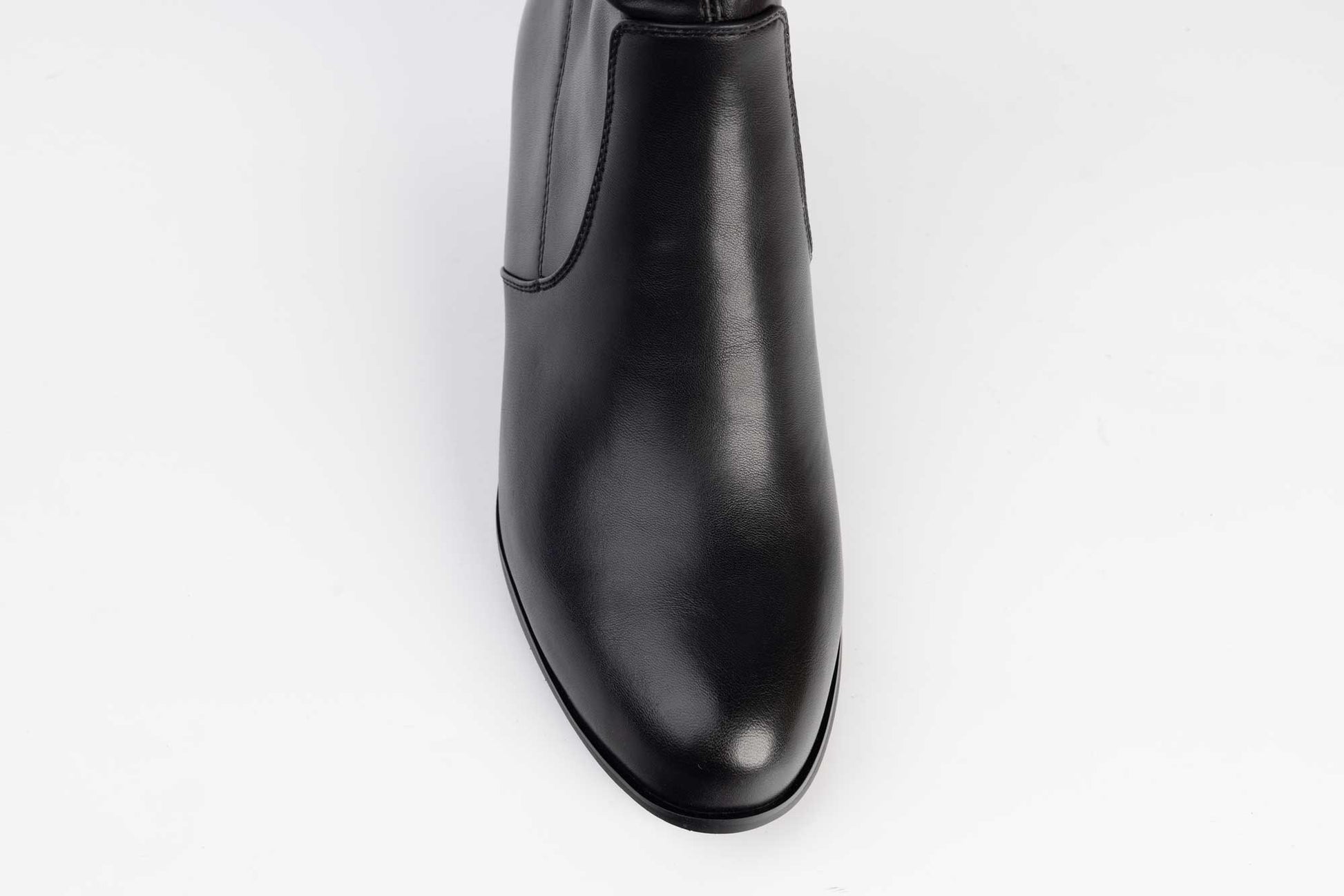 MYU women's boots made of elastic stretch with a 6 cm square heel and a side zipper allowing it to reach the knee level, arranged with a cord that can be tied as needed for fastening. Measured weight 359 grams for a single boot.