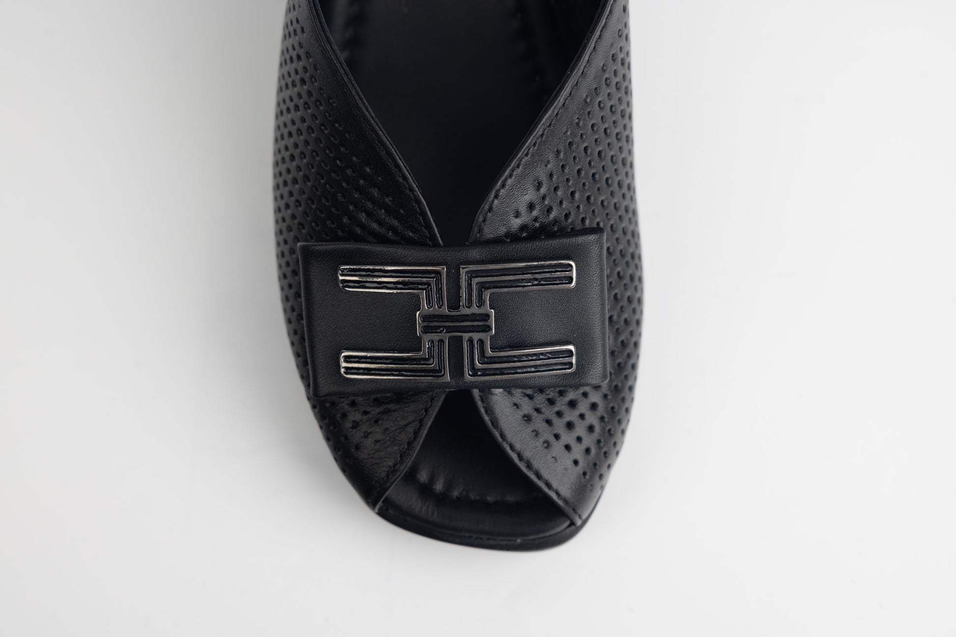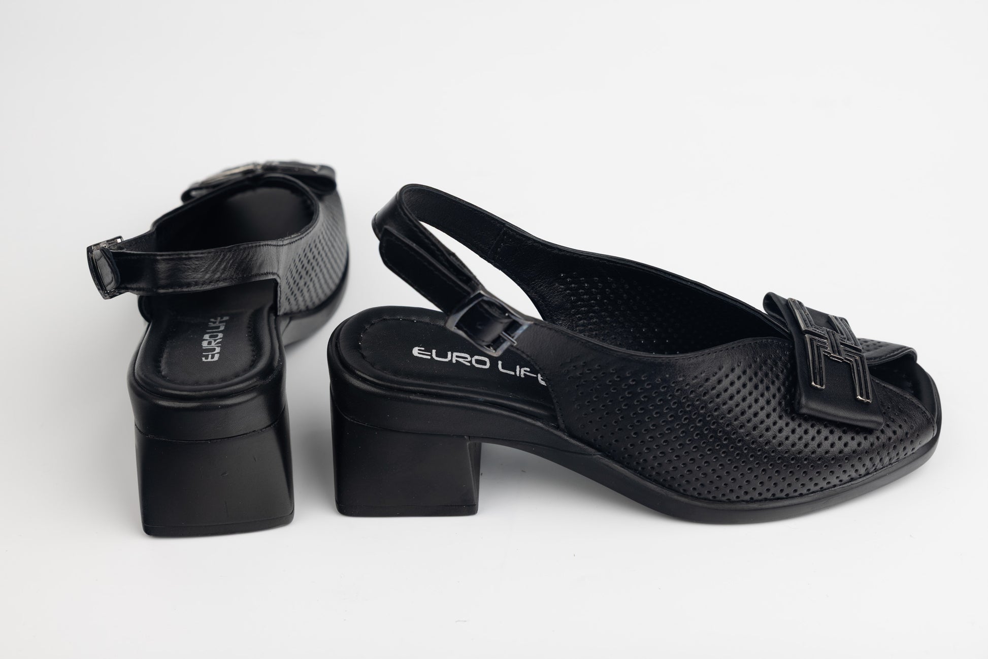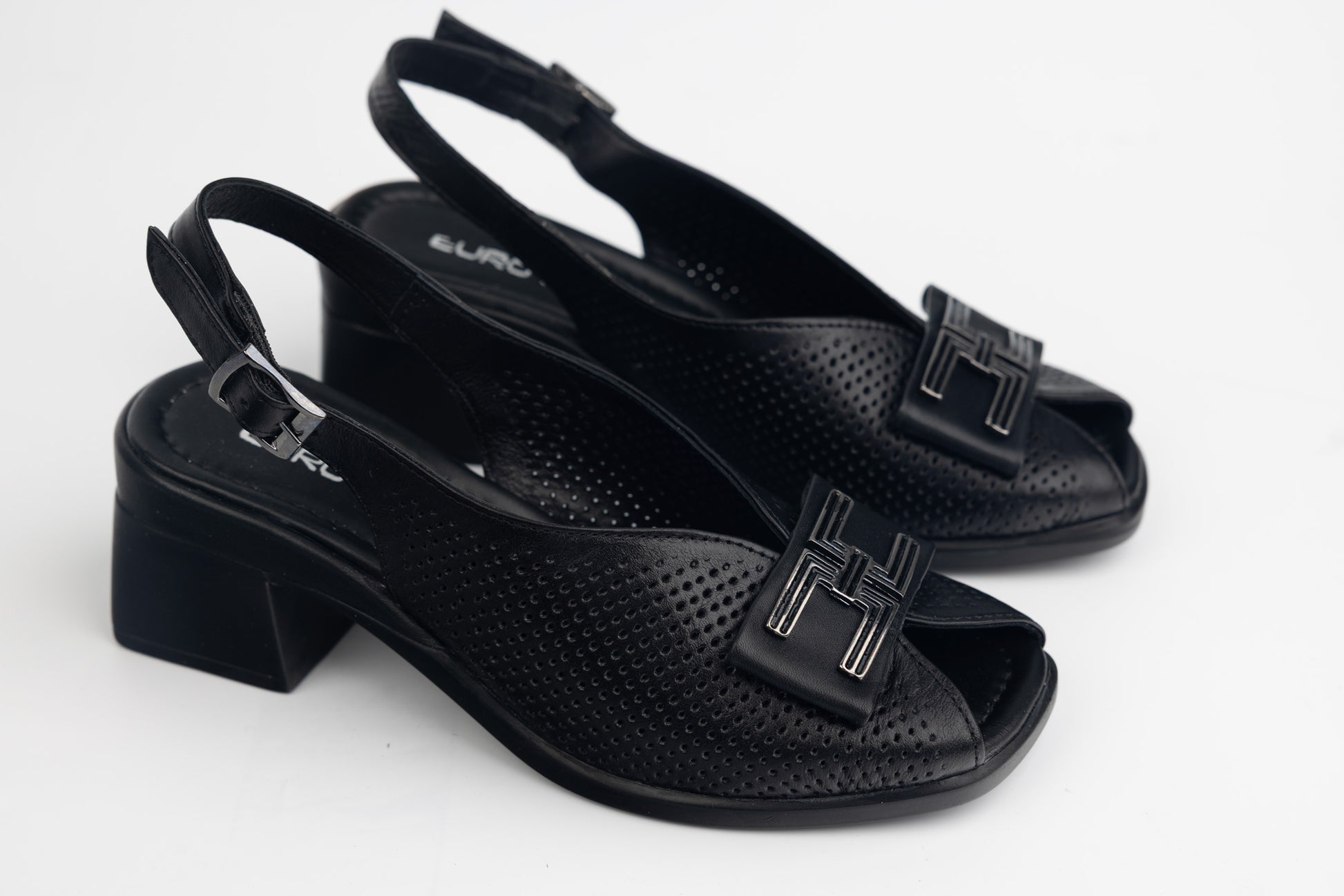 LSD women's sandals made of natural leather with a molded sole with a thick square heel, lined on the inside with natural leather and fastened with a buckle on a strap behind the foot. The smooth inclination of the foot in these sandals makes them much more comfortable to wear for a long time, being recommended even for feet with bunions because they cover them completely. The weight of a single foot is 250 grams.