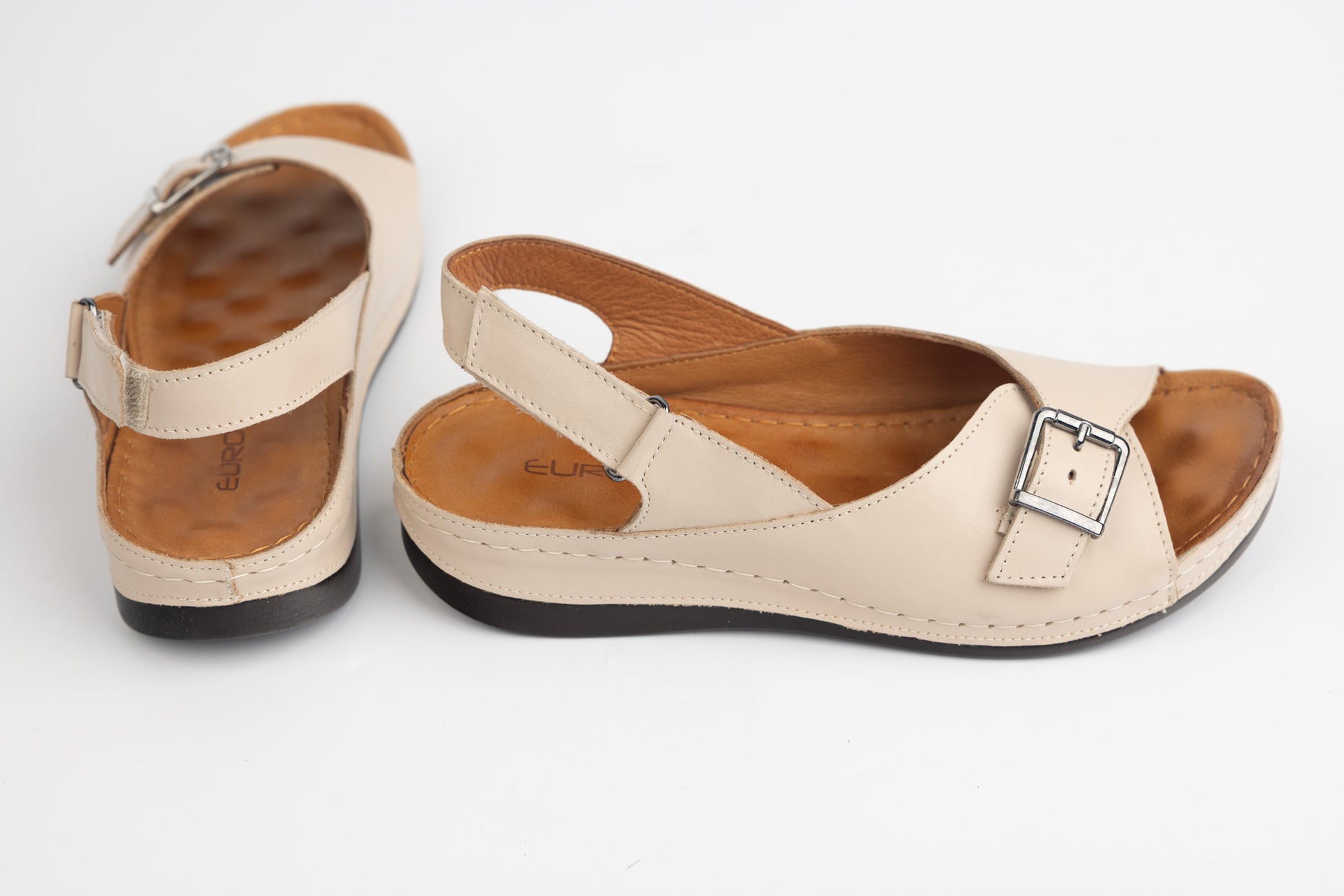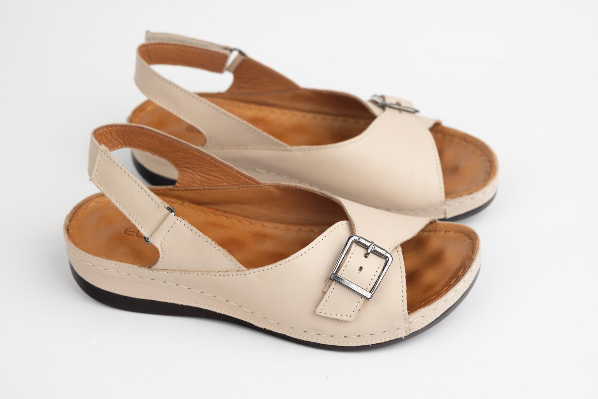 LSD women's sandals made of natural leather with a 3 cm thick orthopedic sole, lined on the inside with natural leather and fastened with a Velcro strap on the side of the foot. The smooth inclination of the foot in these sandals makes them much more comfortable to wear for a long time, being recommended even for feet with bunions because they cover them completely. The weight of a single foot is 250 grams.