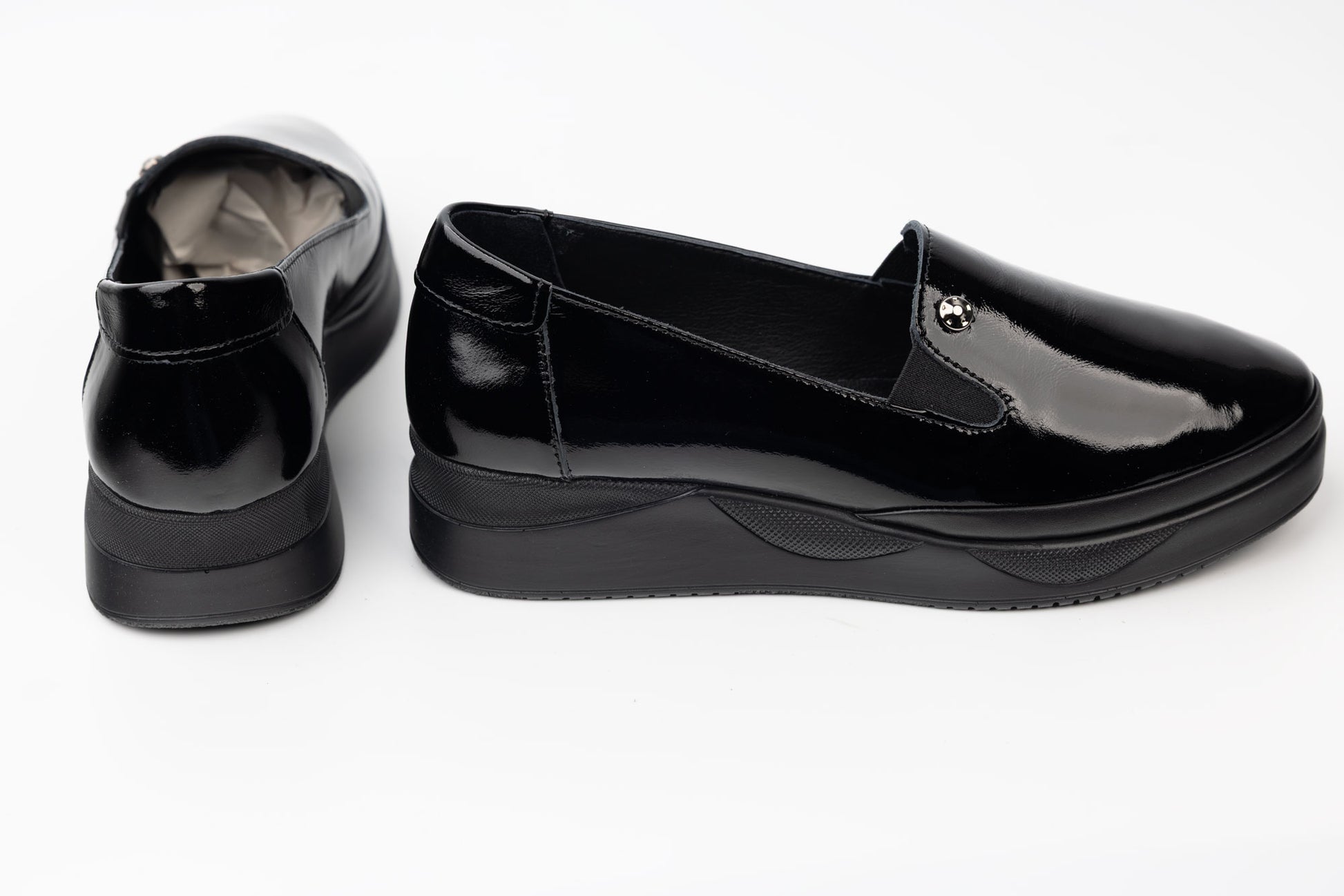 LSD women's shoes made of natural patent leather with a metal accessory on the front, very soft leather that offers maximum comfort for long wear. The sole is light, flexible and on the inside has a memory insole. The weight of a single foot is 280 grams. Recommended for wide feet or with a mount. - sizes from 36 to 42.