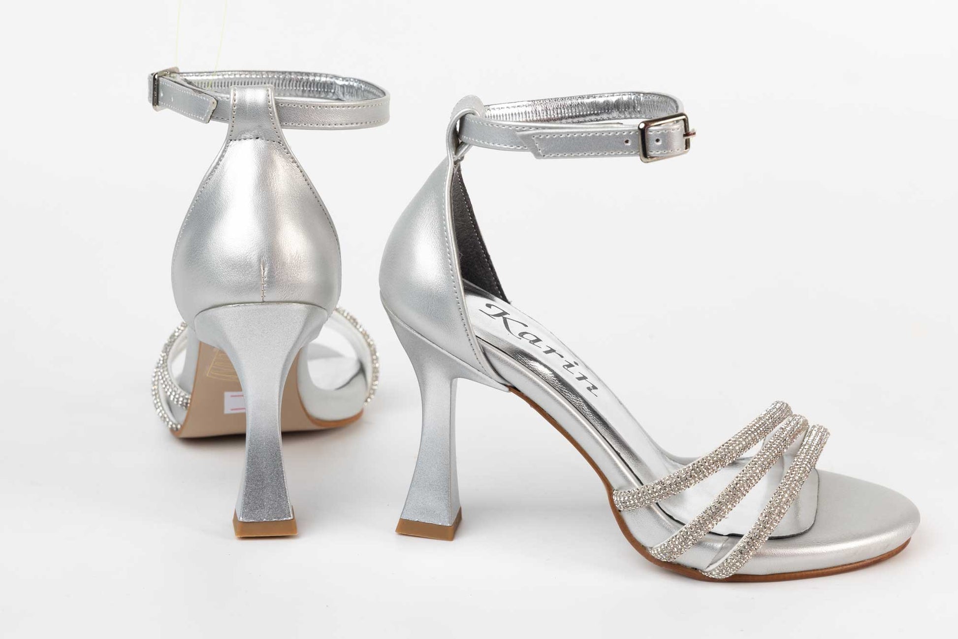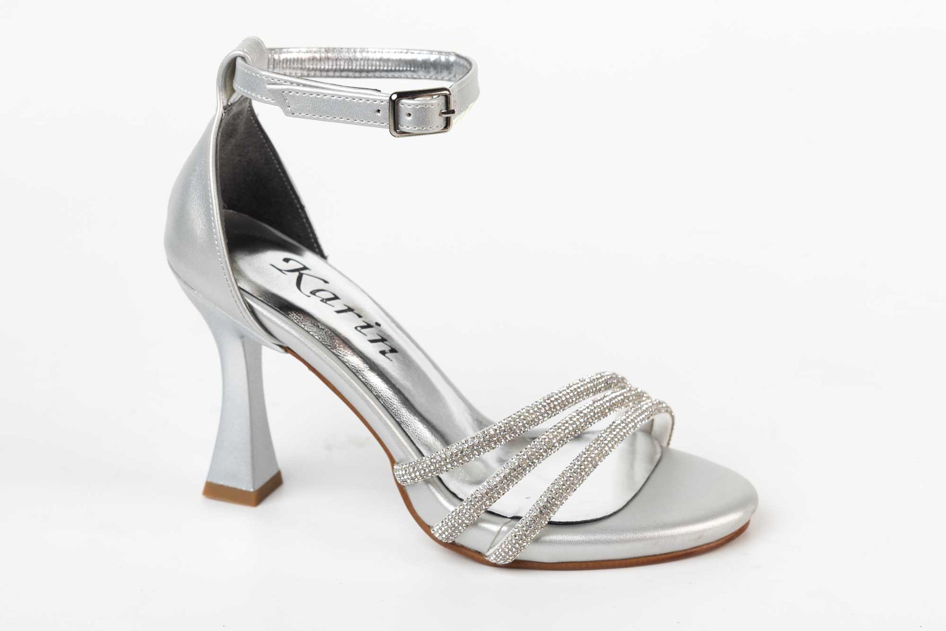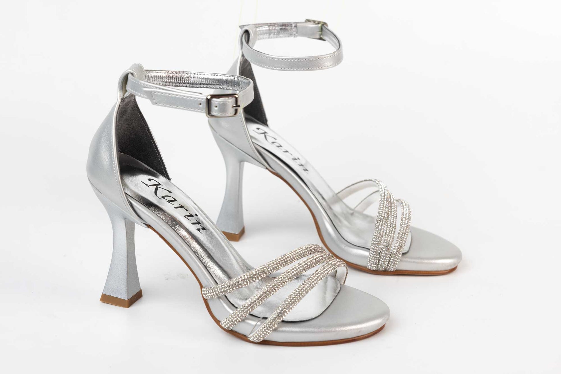 KARIN women's sandals made of quality eco-leather with a 9 cm high flared heel. The weight of a single foot is 218 grams. The fastening is done with a strap above the ankle for better fixation of the foot. The front part is made of 3 straps with crystals which makes this sandal very elegant and comfortable.