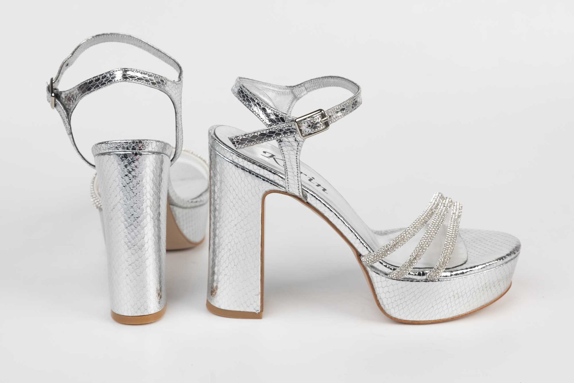 KARIN women's sandals made of quality eco-leather with a thick heel of 11 cm. The weight of a single foot is 264 grams. The fastening is made with a thin strap above the ankle for better fixation of the foot. The front part is made of 3 straps with crystals which makes this sandal very elegant and comfortable.