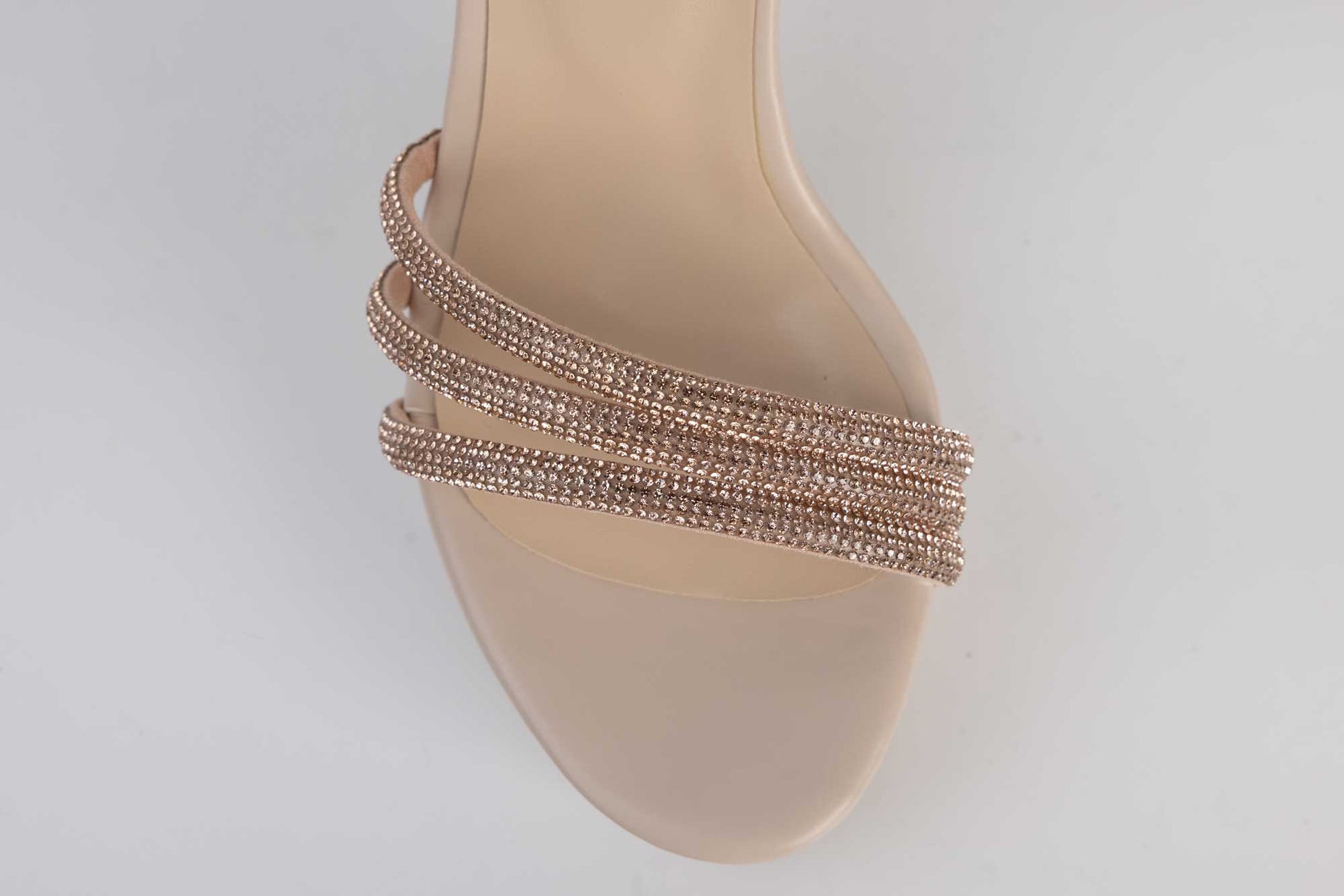 KARIN women's sandals made of quality eco-leather with a thick heel of 11 cm. The weight of a single foot is 264 grams. The fastening is made with a thin strap above the ankle for better fixation of the foot. The front part is made of 3 straps with crystals which makes this sandal very elegant and comfortable.