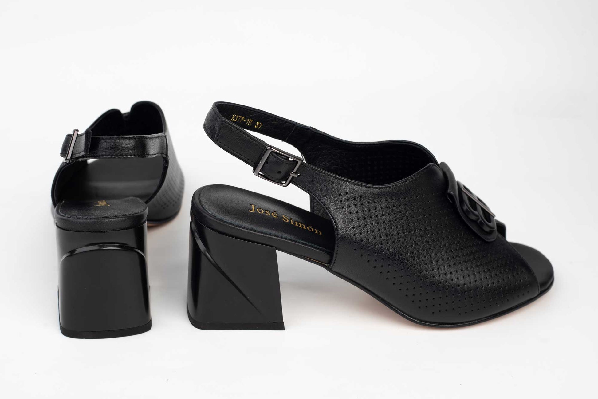 JOSE SIMON women's sandals made of genuine leather, cut at the top and back, and the heel is square, 6 cm high, with a round toe. The weight of a single foot is 225 grams. On the toe of the shoe is a genuine leather accessory with a black metal logo in tone with a fastening buckle.