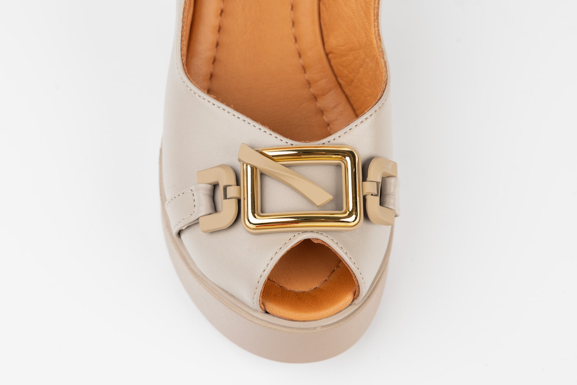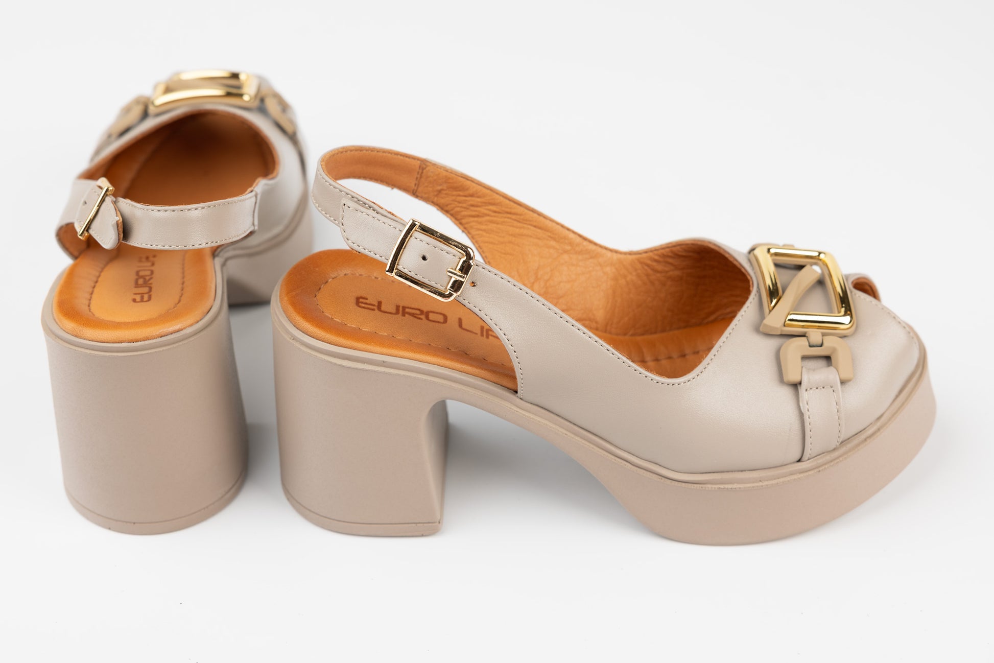LSD women's sandals made of natural leather with a thick molded sole with a thick square heel, lined on the inside with natural leather and fastened with a buckle on a strap behind the foot. The smooth inclination of the foot in these sandals makes them much more comfortable to wear for a long time, being recommended even for feet with bunions because they cover them completely. The weight of a single foot is 250 grams. Sizes from 34 to 40.