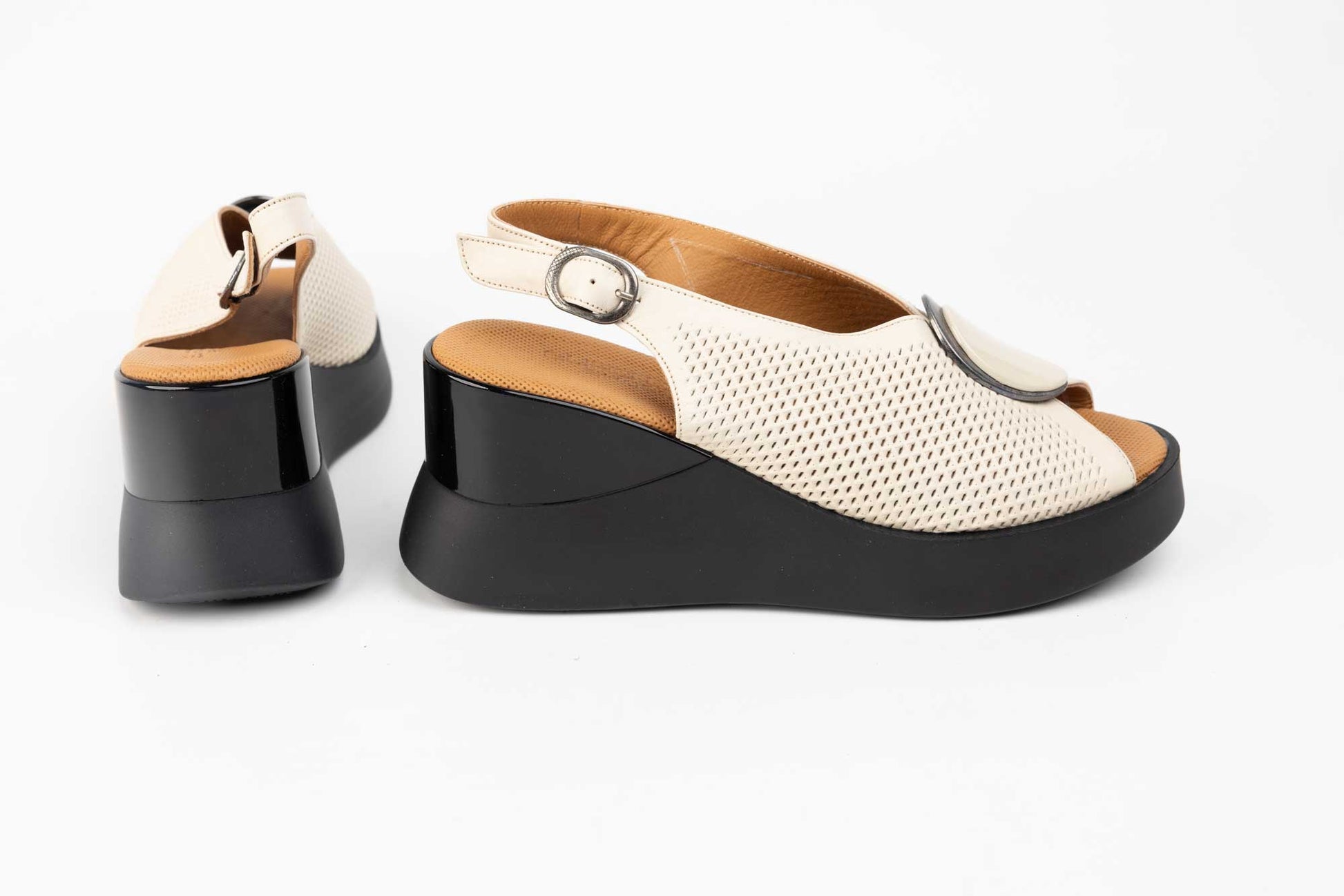 LSD women's sandals made of natural leather with a thick orthopedic sole, lined with natural leather on the inside and fastened with a buckle on a strap behind the foot. The smooth inclination of the foot in these sandals makes them much more comfortable to wear for a long time, being recommended even for feet with bunions because they cover them completely. The weight of a single foot is 350 grams.