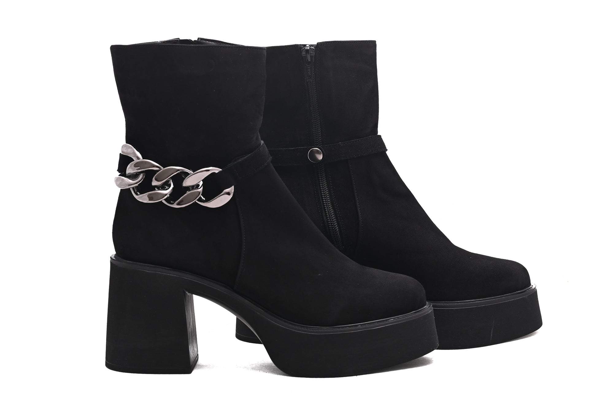 PERLA women's fur-lined boots made of moisture-resistant natural suede with a side zipper, a removable ankle strap and a thick, non-slip serrated heel sole with a round toe, comfortable and lightweight. The weight of a single leg is 340 grams.