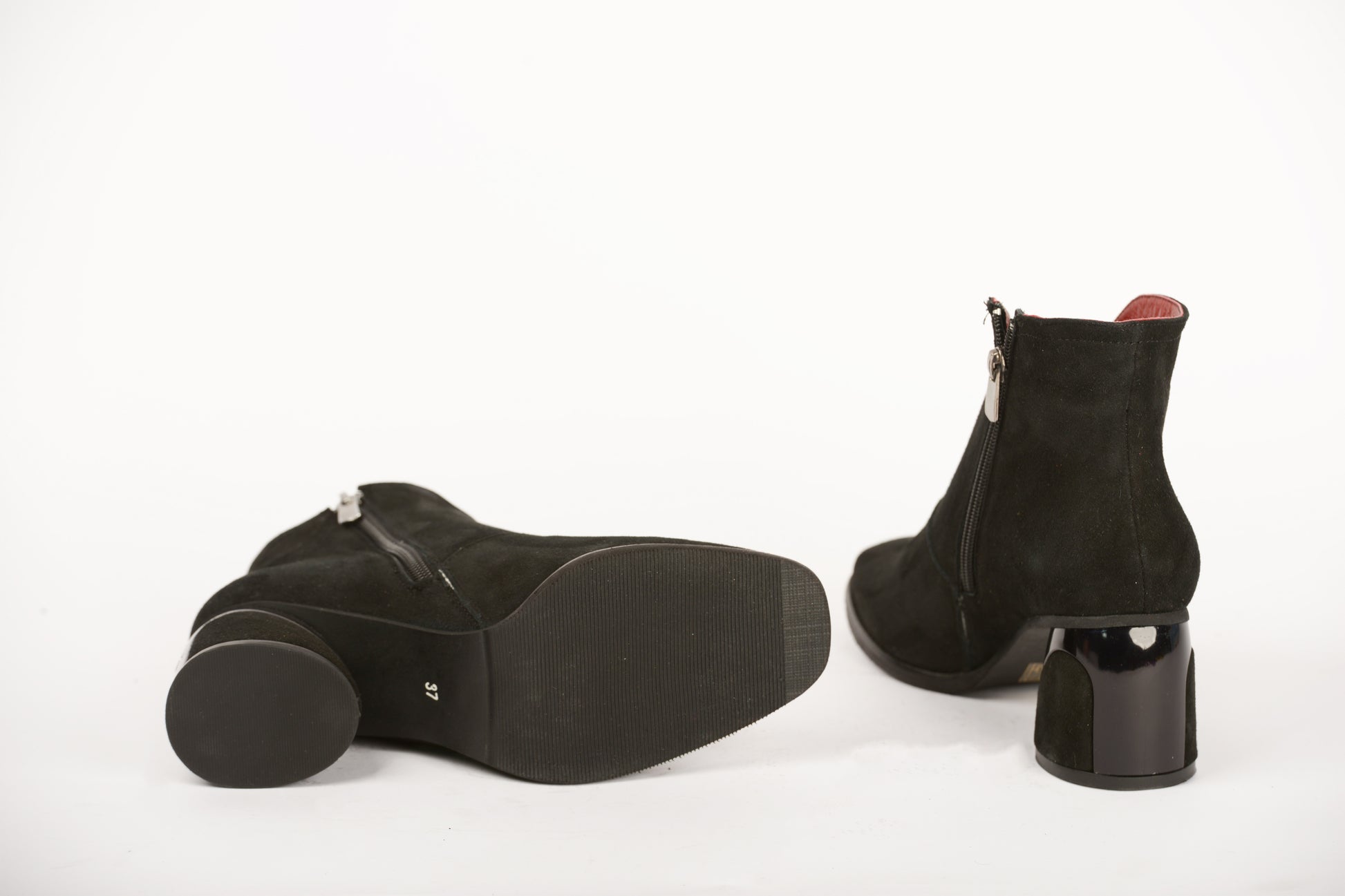 JOHAN women's boots made of natural suede with a round heel partially covered in suede, lined with fur, fastened with a side zipper. The front has an elastic band for easier putting on and the weight of a single leg is 348 grams.