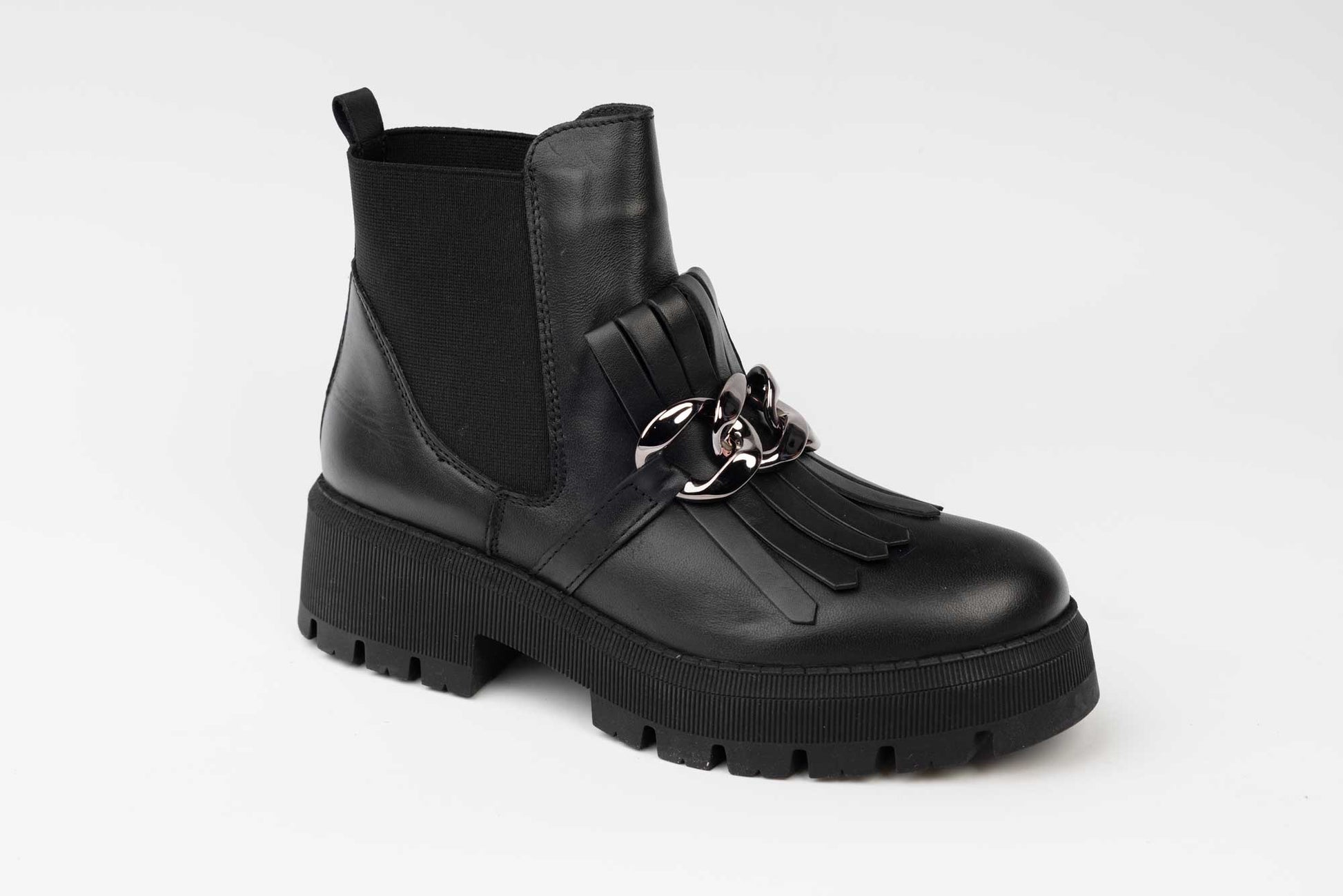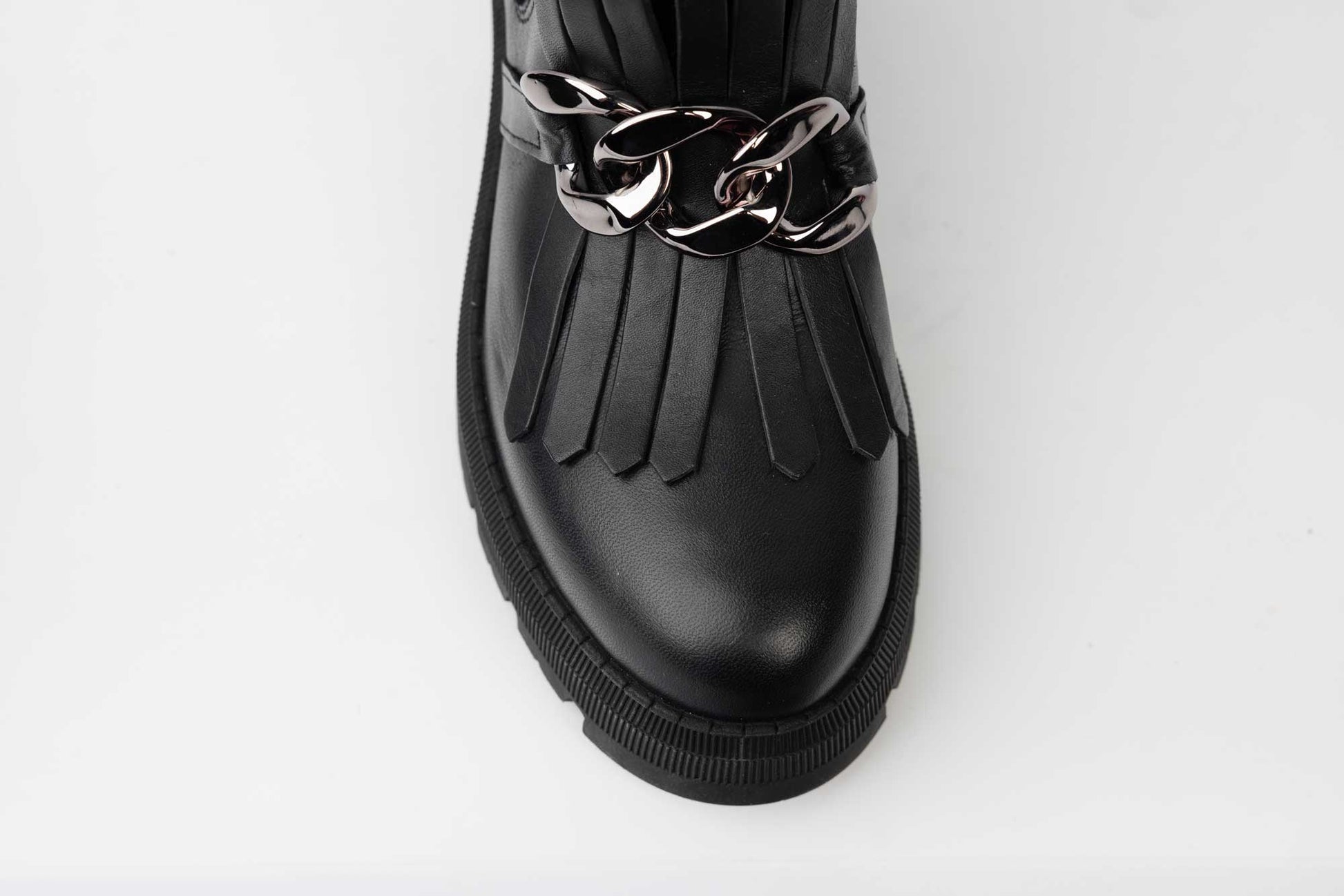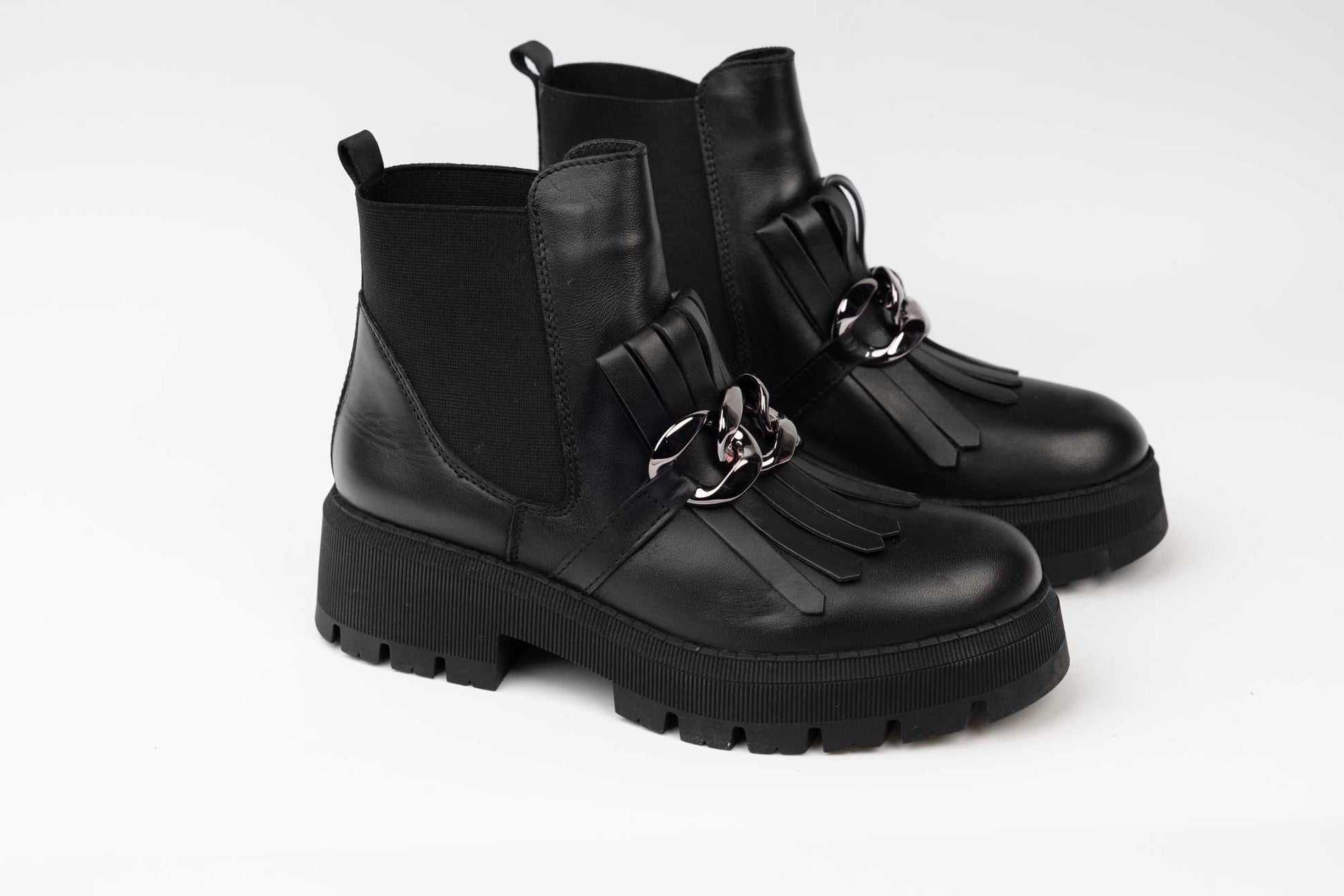 FASCINO women's boots made of natural leather, with a 5 cm thick sole with lateral elastic and lined with thin fur on the inside. On the front of the boot there is a chain accessory mounted over the leather strands. - The weight of a single boot is 310 grams.