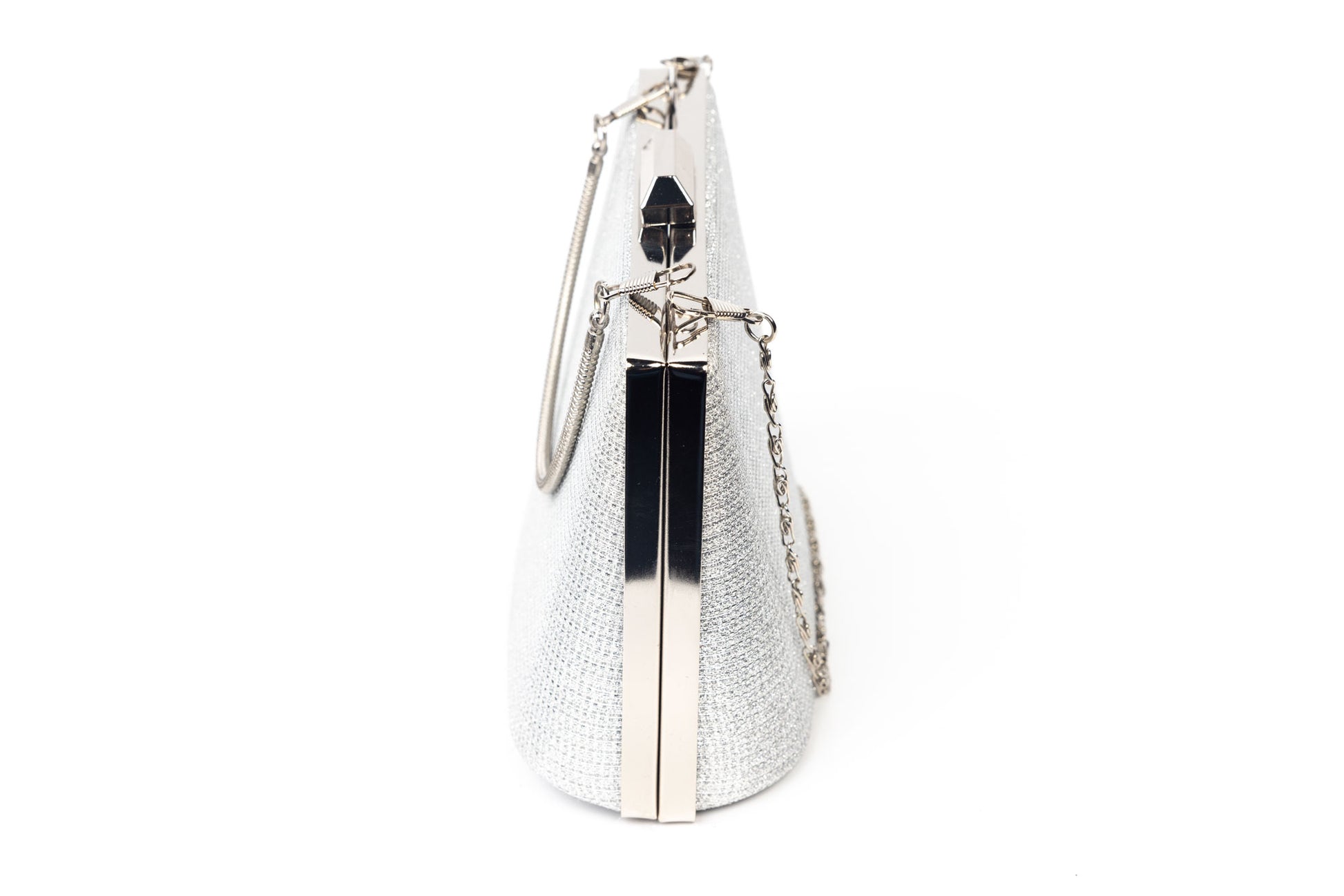 A ladies' envelope measuring 18-13 cm with silver glitter effects, featuring a handle and a detachable metal chain strap. The interior is single-chamber and is suitable and roomy for a phone or cosmetics. The closure is made with a metal flap at the top of the envelope.
