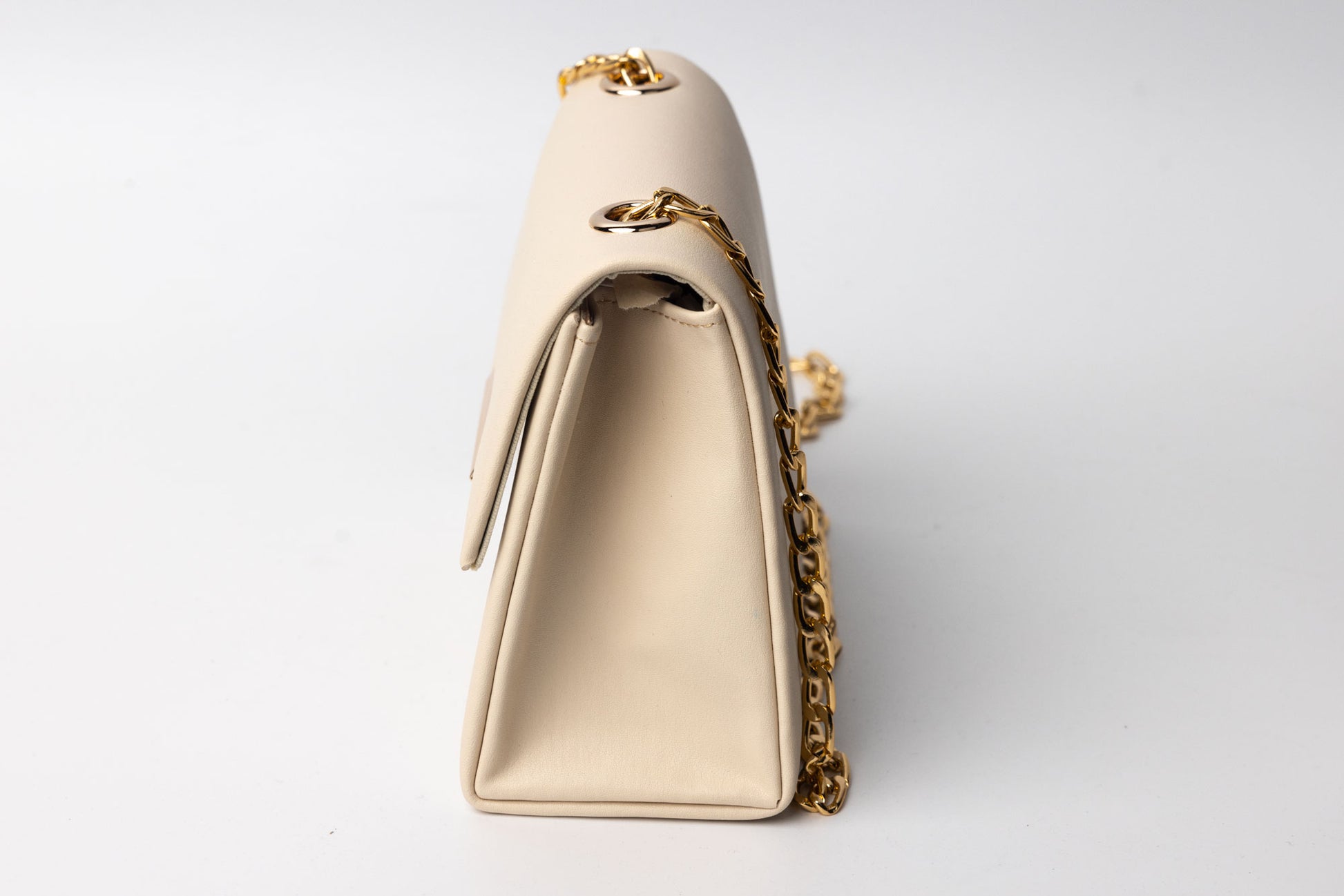 Women's purse size 21 -13 cm with a handle. The interior is single-chamber and is suitable and roomy for a phone and cosmetics. The closure is made with a metal flap on the front of the purse.