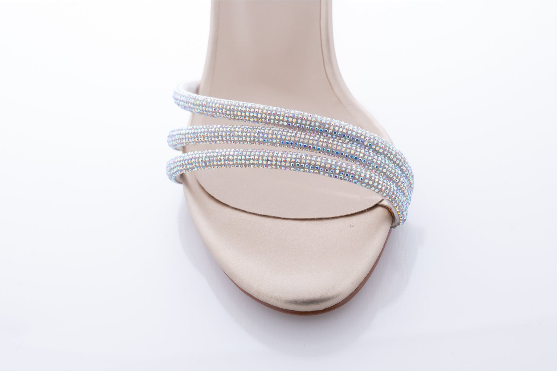 KARIN women's sandals made of quality eco-leather with a thin, flared heel of 8 cm. The weight of a single foot is 185 grams. The fastening is made with a thin strap above the ankle for better fixation of the foot. The front part is made of 3 straps with crystals which makes this sandal very elegant, simple and comfortable.