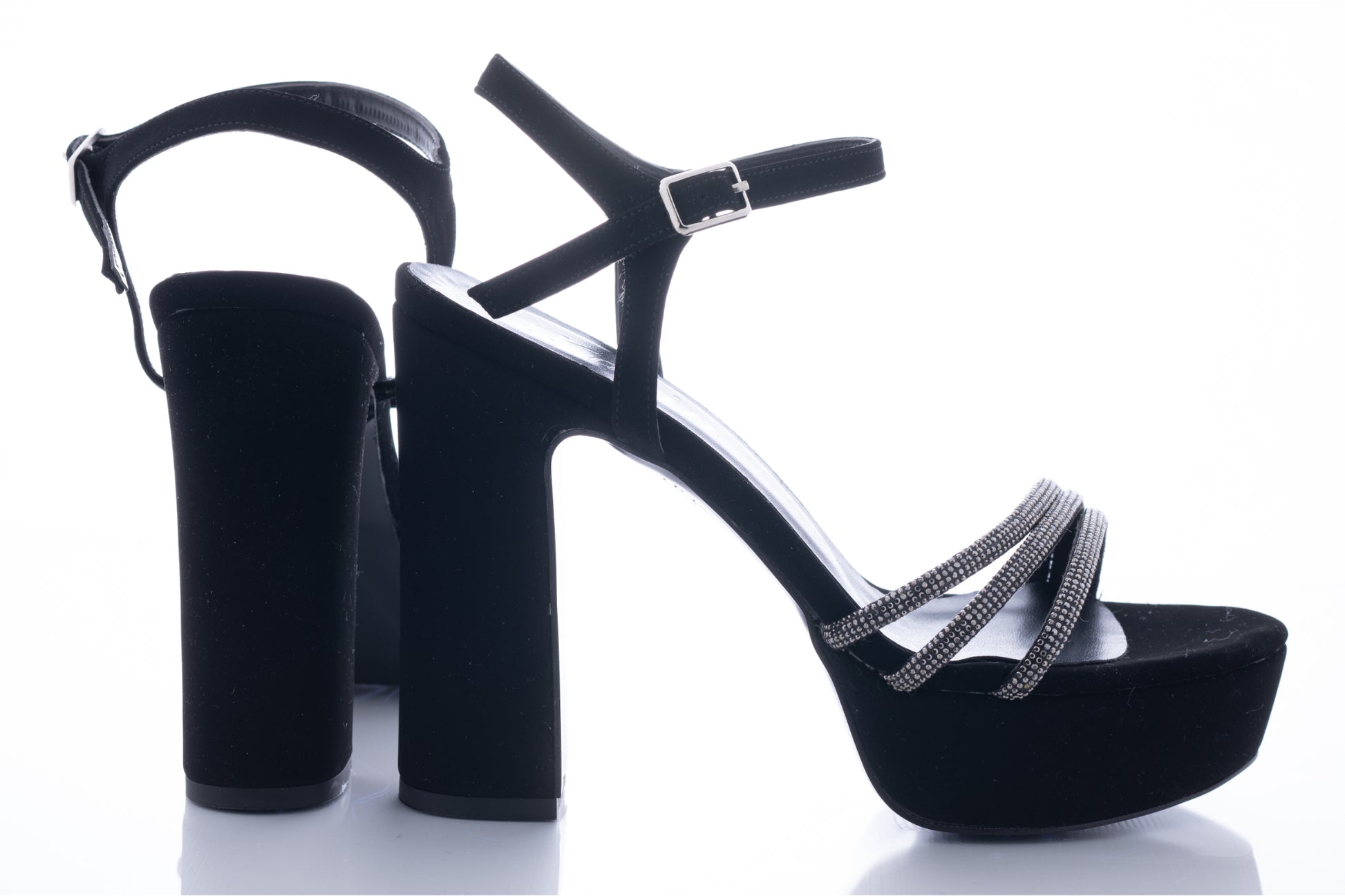 KARIN women's sandals made of quality eco-leather with a thick heel of 11 cm. The weight of a single foot is 264 grams. The fastening is made with a thin strap above the ankle for better fixation of the foot. The front part is made of 3 straps with crystals which makes this sandal very elegant and comfortable.