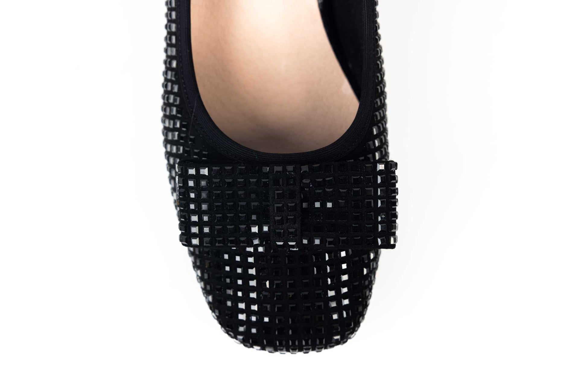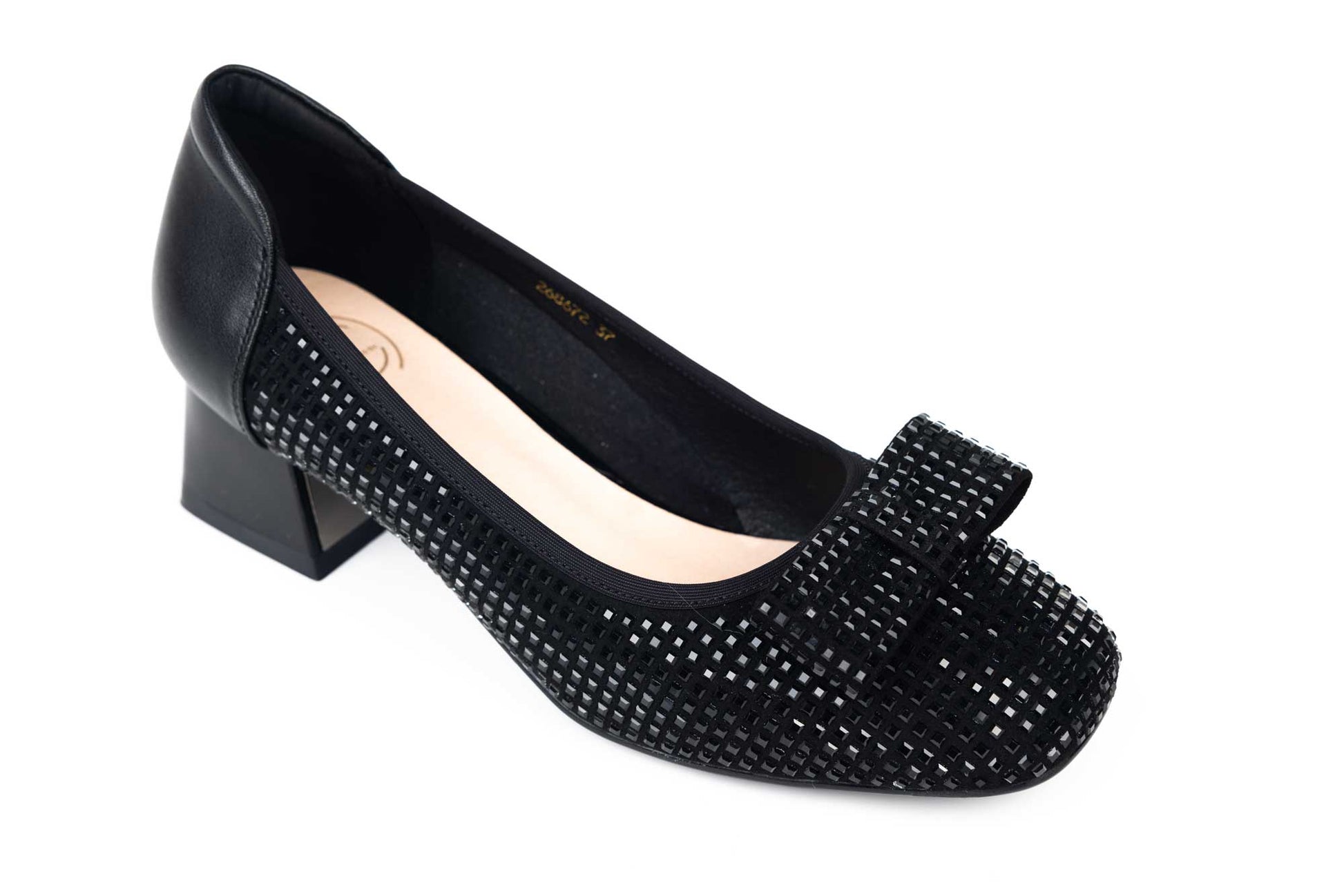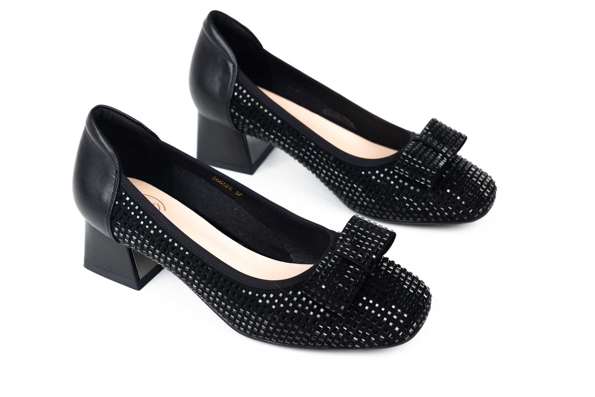 Pantofi FORMAZIONE de dama din piele naturala intoarsa pe care sunt aplicate cristale avand toc patrat de 5 cm inaltime. Pielea este foarte moale si ofera maximum de confort la purtare indelungata, Talpa este usoara, flexibila iar pe interior detine un brant cu memory. Greutatea unui singur picior este de 190 grame.