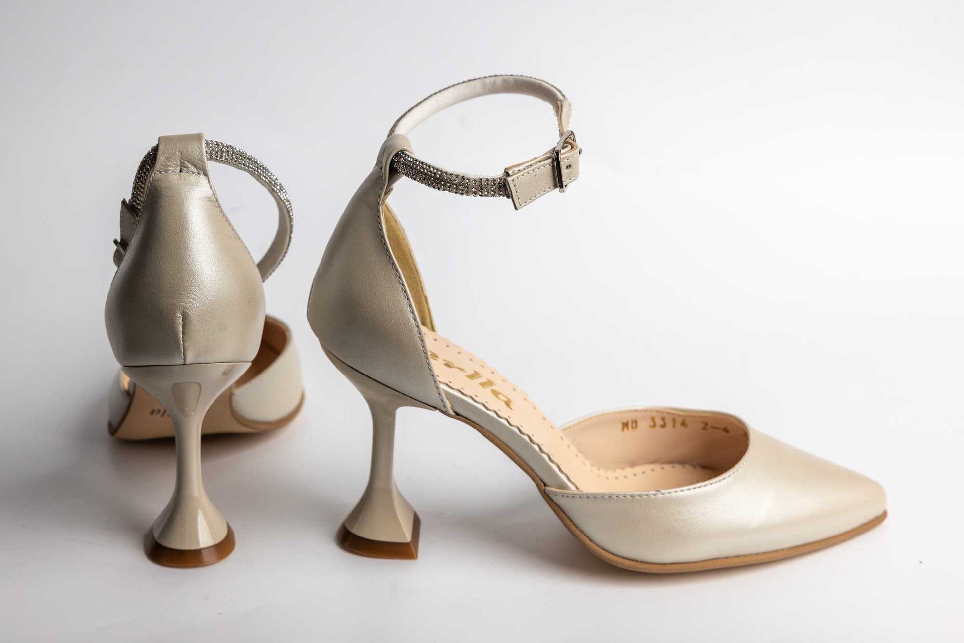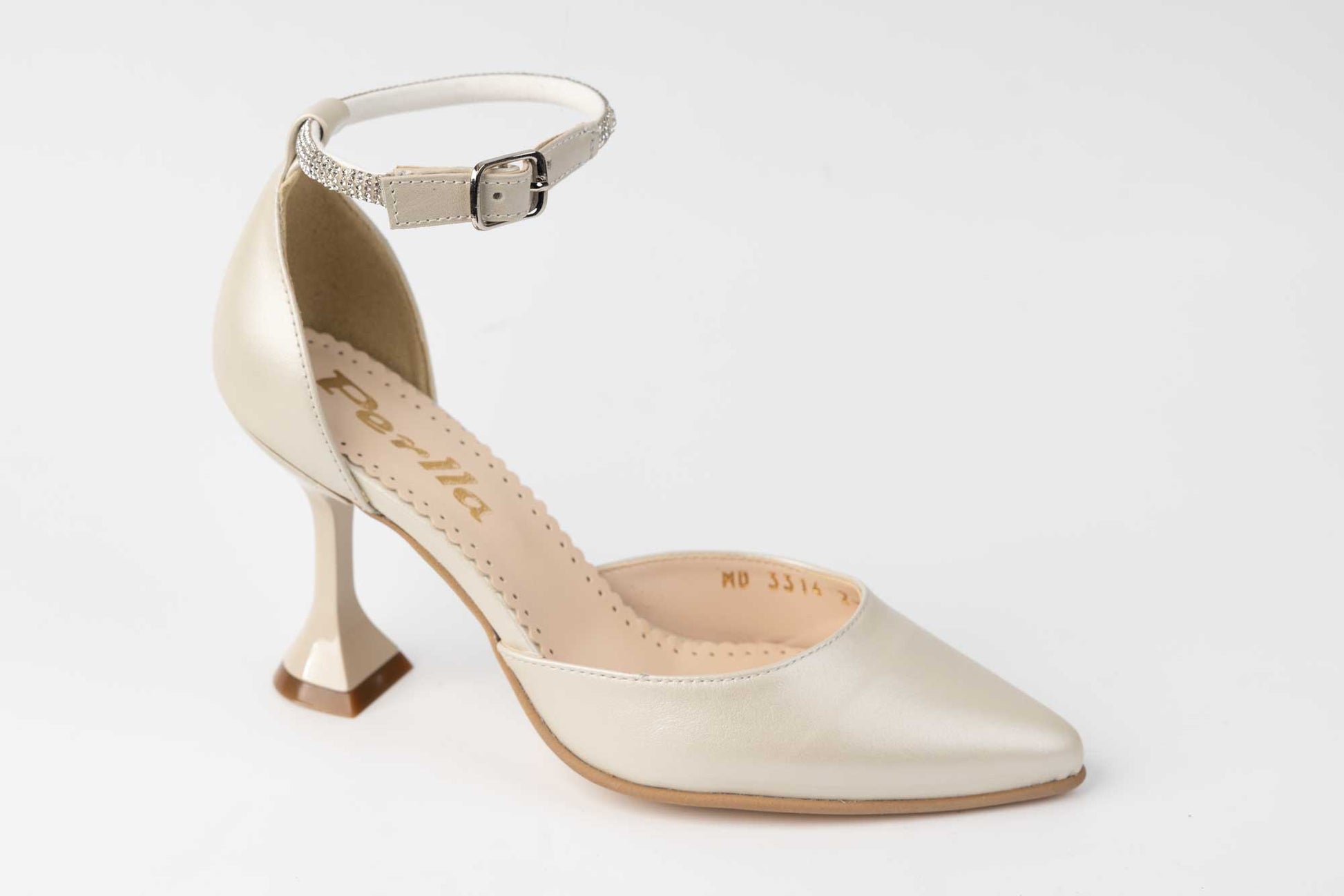 Pantofi PERLA de dama din piele naturală decupați la mijloc cu prindere cu bareta de cristale intr-o catarama finuța, având un toc subtire evazat cu înălțimea de 8 cm oferind piciorului înclinația potrivită pentru mers și stabilitate. Greutatea unui singur picior este de 230 grame.