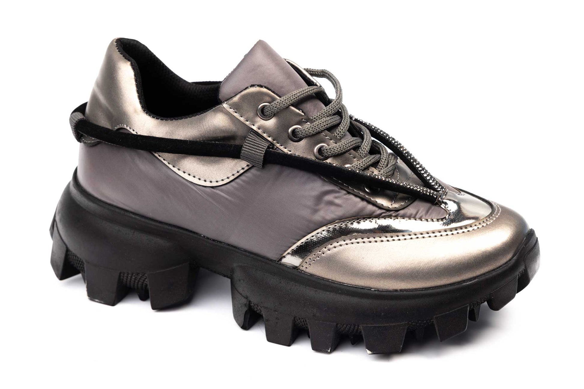 Adidasi dama MESHURE din piele ecologică combinat cu panza cu talpa groasa de 4 cm înălțime care se leagă cu siret având vârful rotunjit. Greutatea unui singur picior este de 240 grame.
