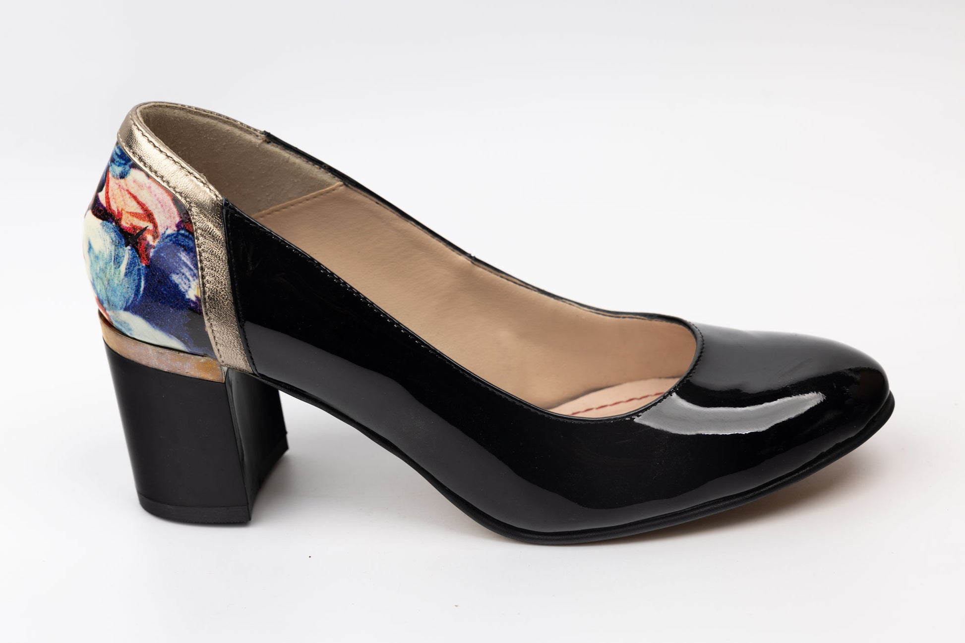 Pantofi GIULIO de dama din piele naturala lac si cu toc gros de 6,5 cm inaltime cu varful rotunjit având in zona călcâiului piele naturală lac cu inserție color si margini aurii. Greutatea unui singur picior este de 295 grame.