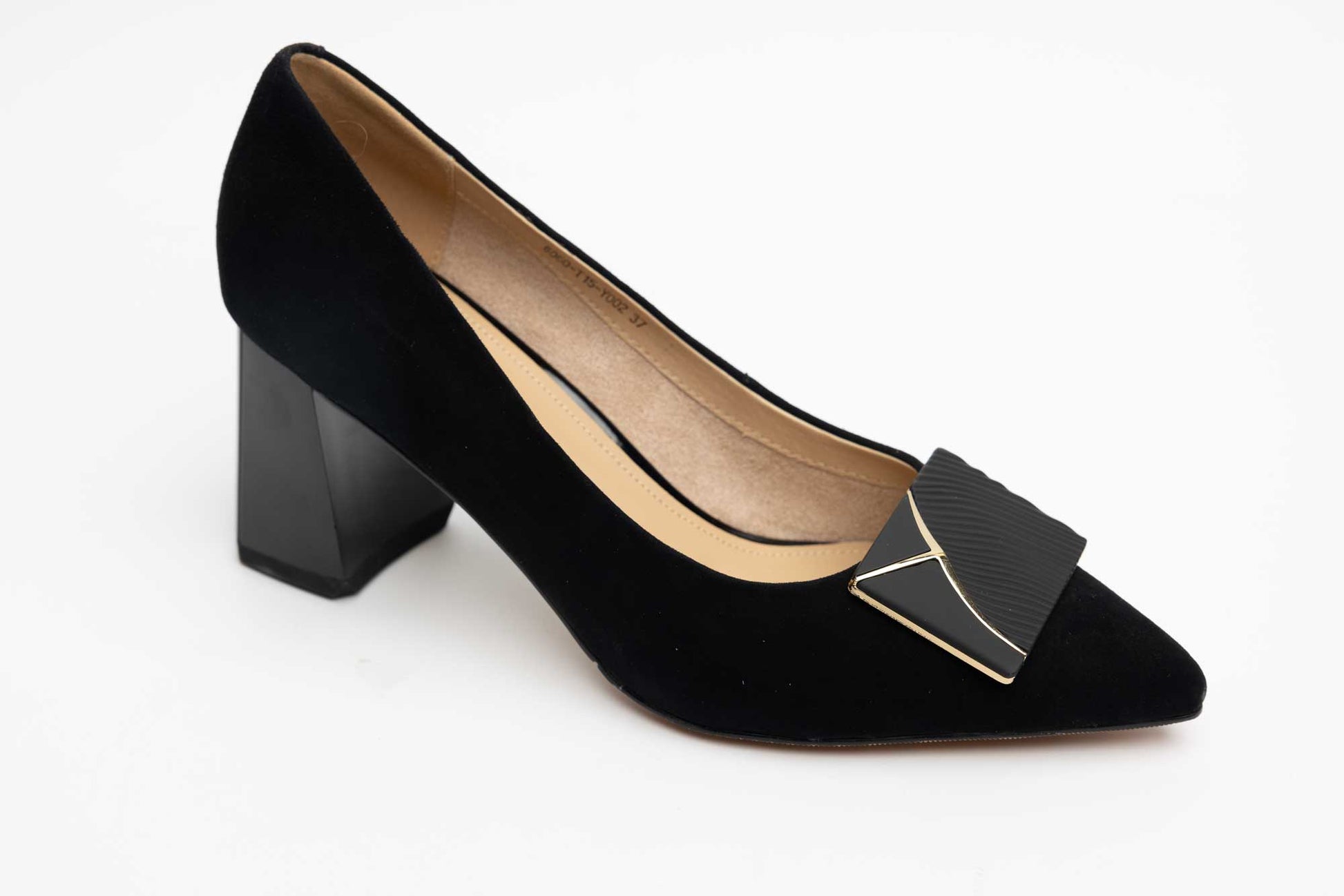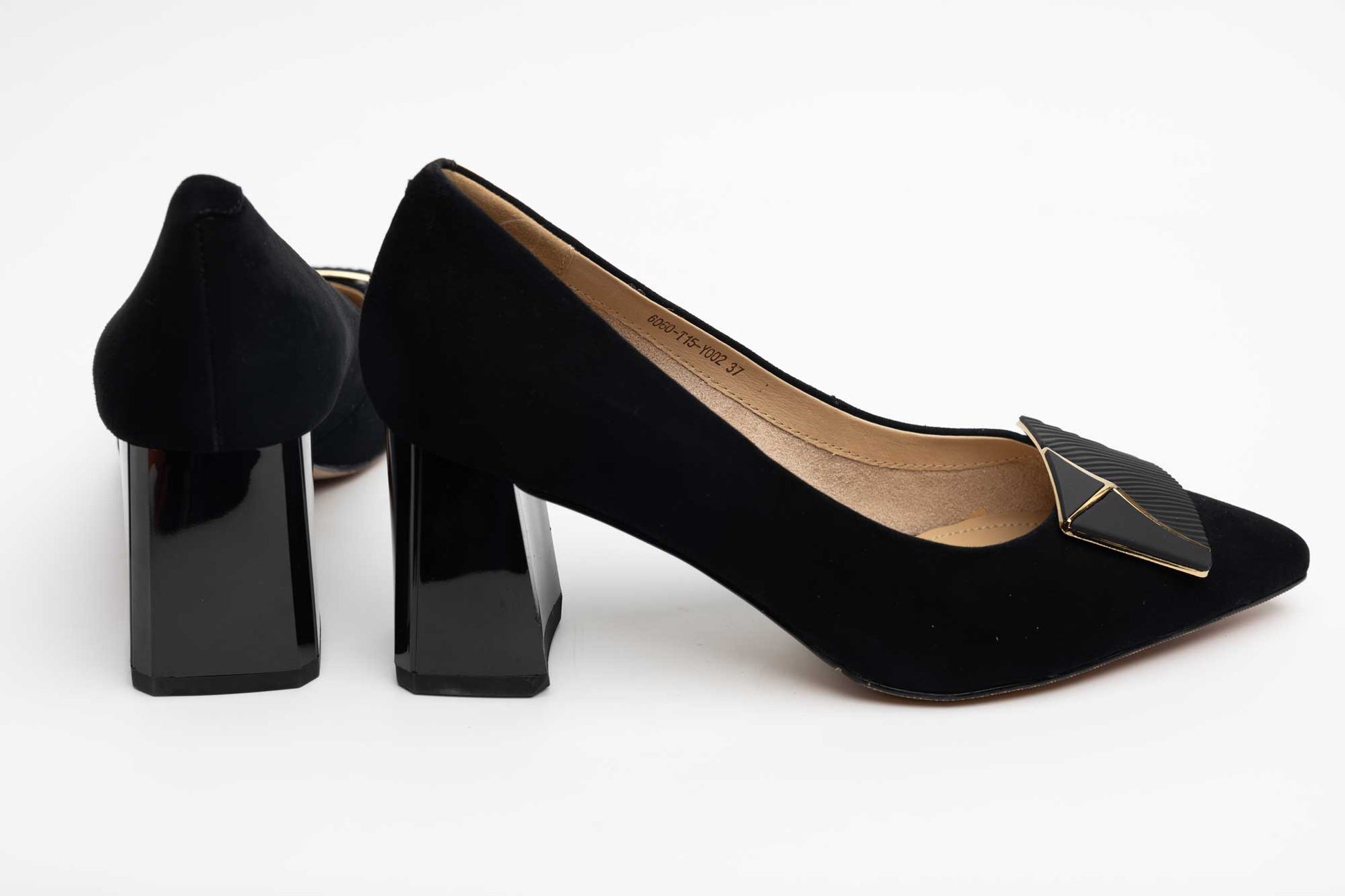 Pantofi BETINA de dama din piele naturală intoarsa cu toc pătrat de 7 cm cu interior căptușeala de piele, model cu vârful ascuțit având un accesoriu deosebit pe vârf. Greutatea unui singur picior este de 230 grame.