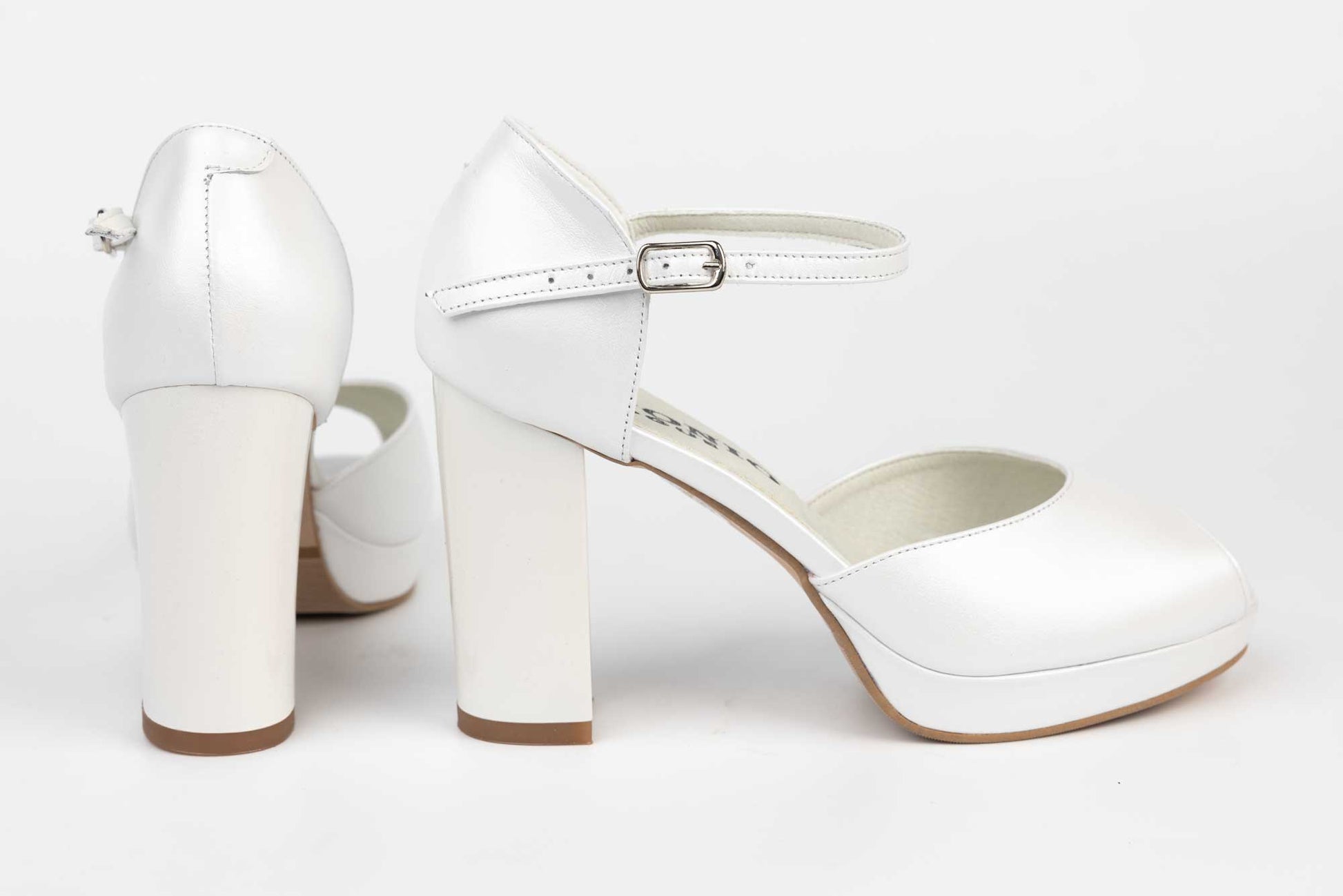 Sandale mireasa ANTONIO din piele naturală cu toc gros de 10 cm înălțime foarte stabil la mers având la partea din fata o platforma de 1 cm înălțime care conferă o înclinație lina și confortabila piciorului. Prinderea baretei se face cu o catarama fina.