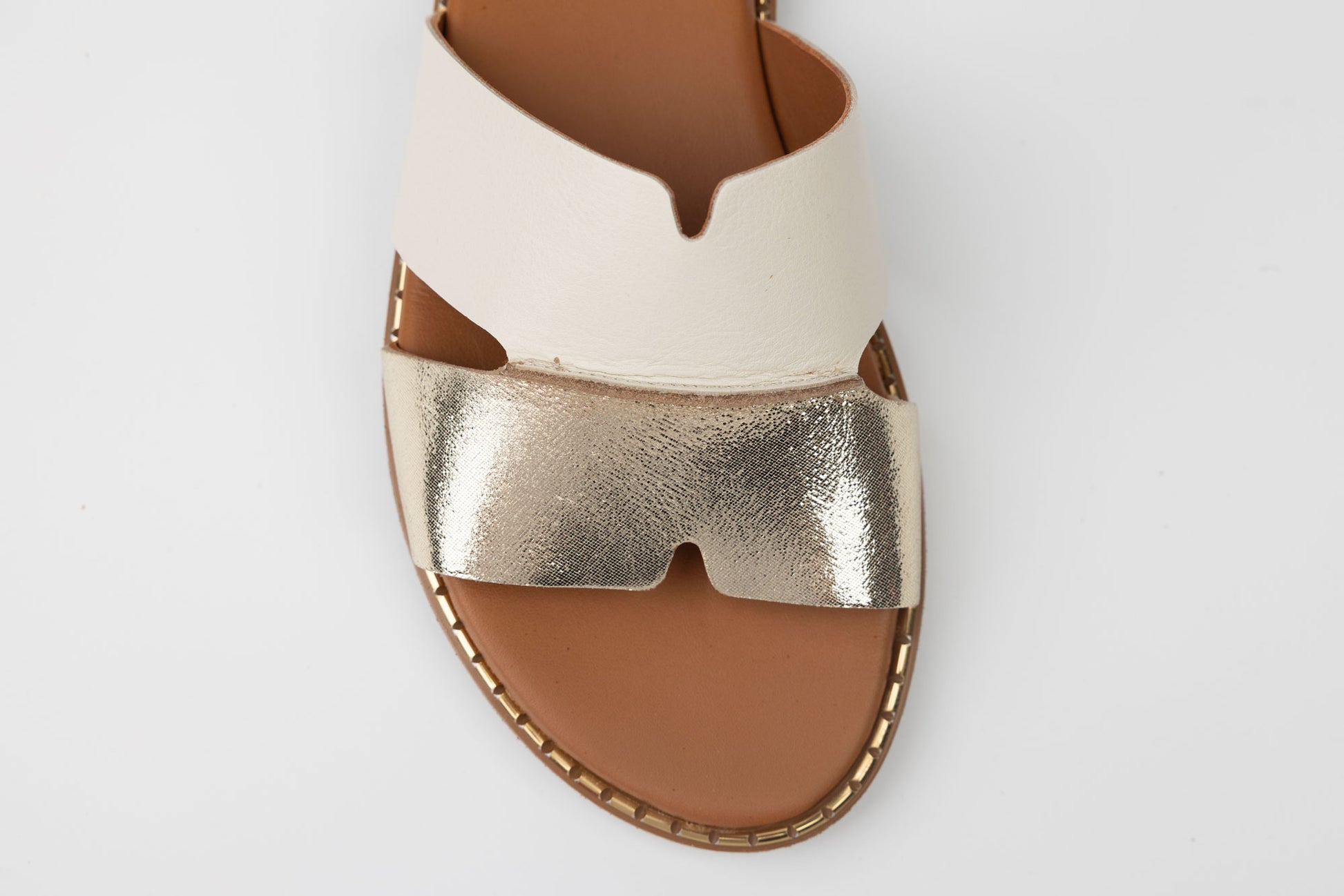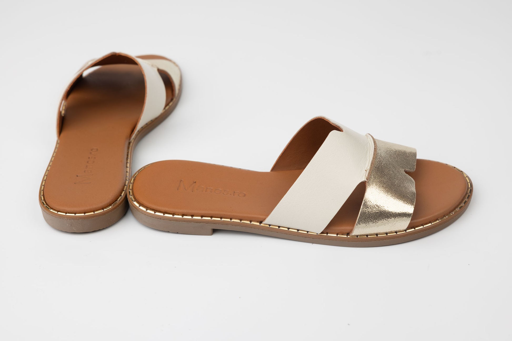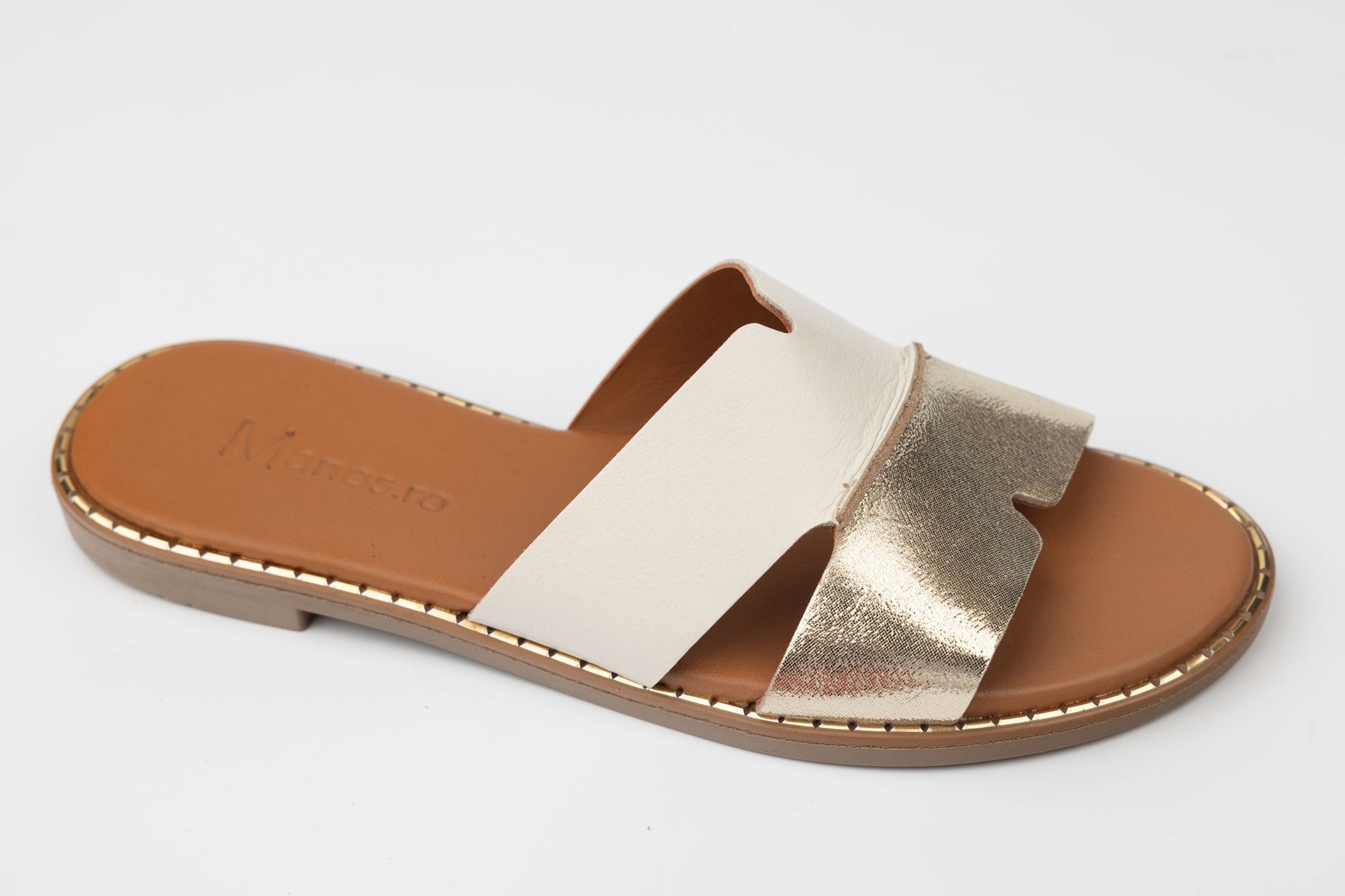 Șlapi GOLD DEER de dama din piele naturala cu talpa joasă de 0,5 cm cu 2 barete din piele naturală peste picior . Greutatea unui singur picior este de 180 grame. Marimi de la 36 pana la 40.