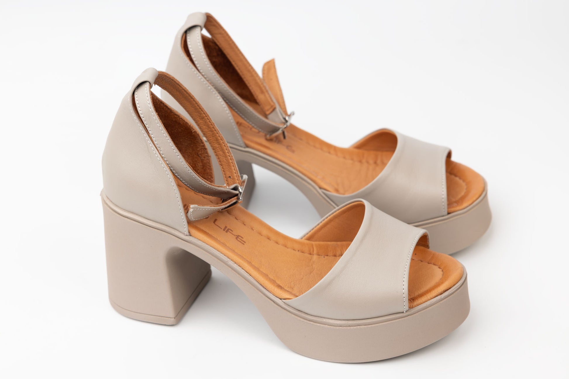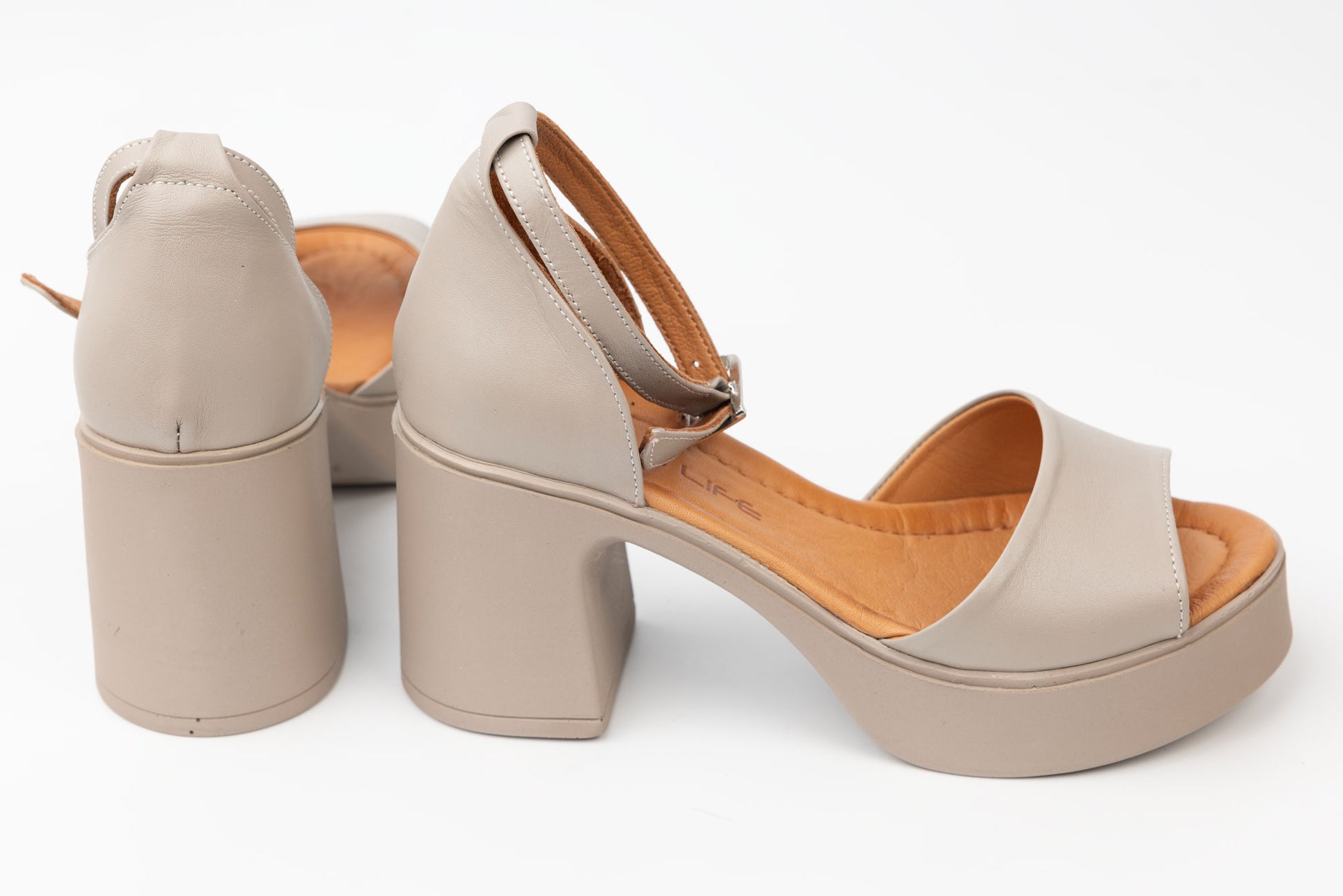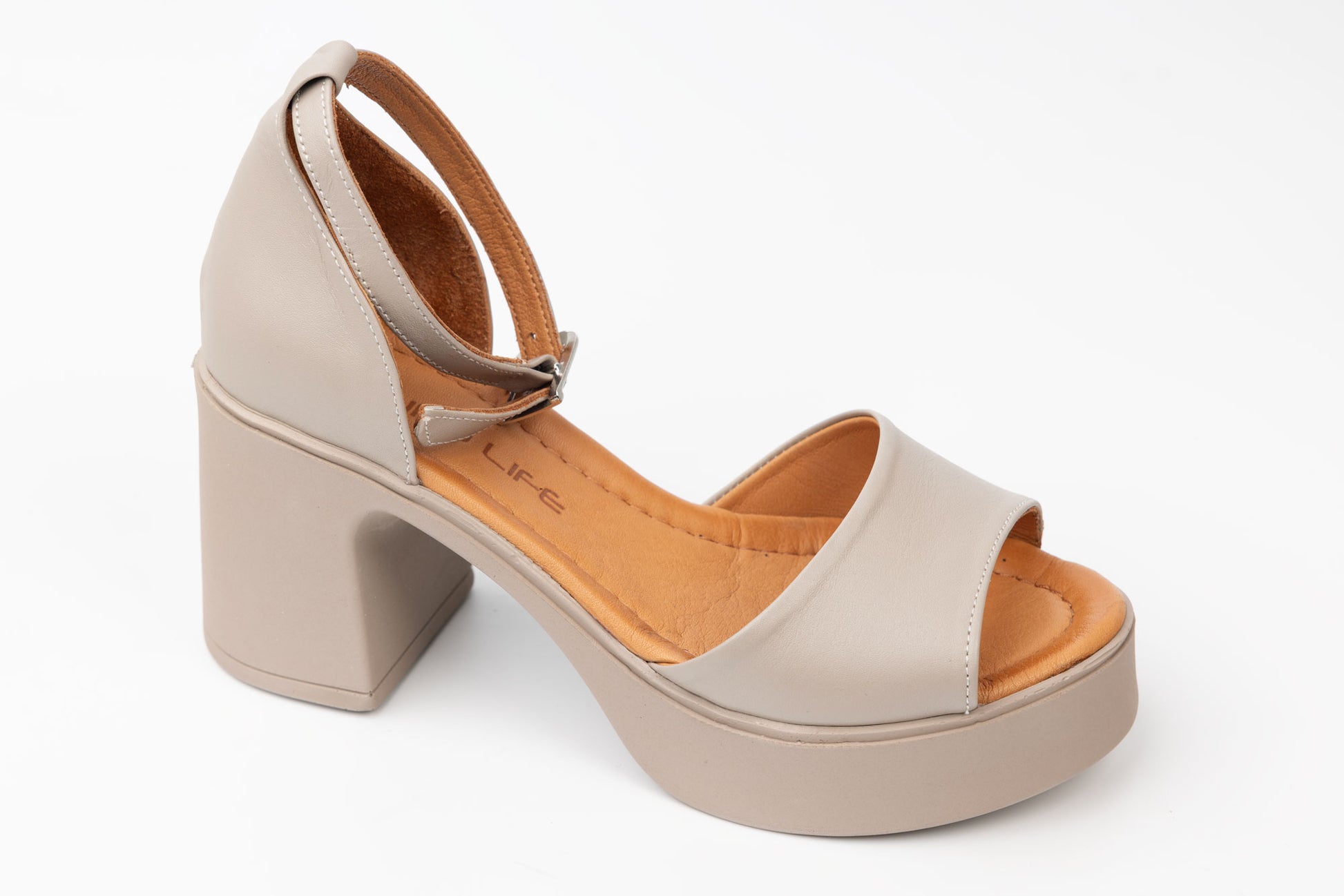 Sandale dama LSD din piele naturala cu talpa turnata groasa cu toc gros patrat captusite la interior cu piele naturala avand prinderea cu o catarama pe o bareta in spatele piciorului. Inclinatia lina a piciorului in aceste sandale face mult mai comoda purtarea lor un timp indelungat fiind recomandate chiar si pentru picioare cu mont pentru ca le acopera in intregime. Greutatea unui singur picior este de 250 grame.