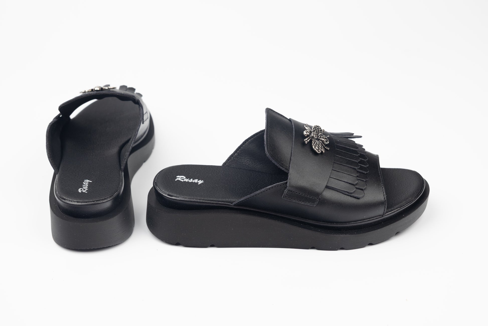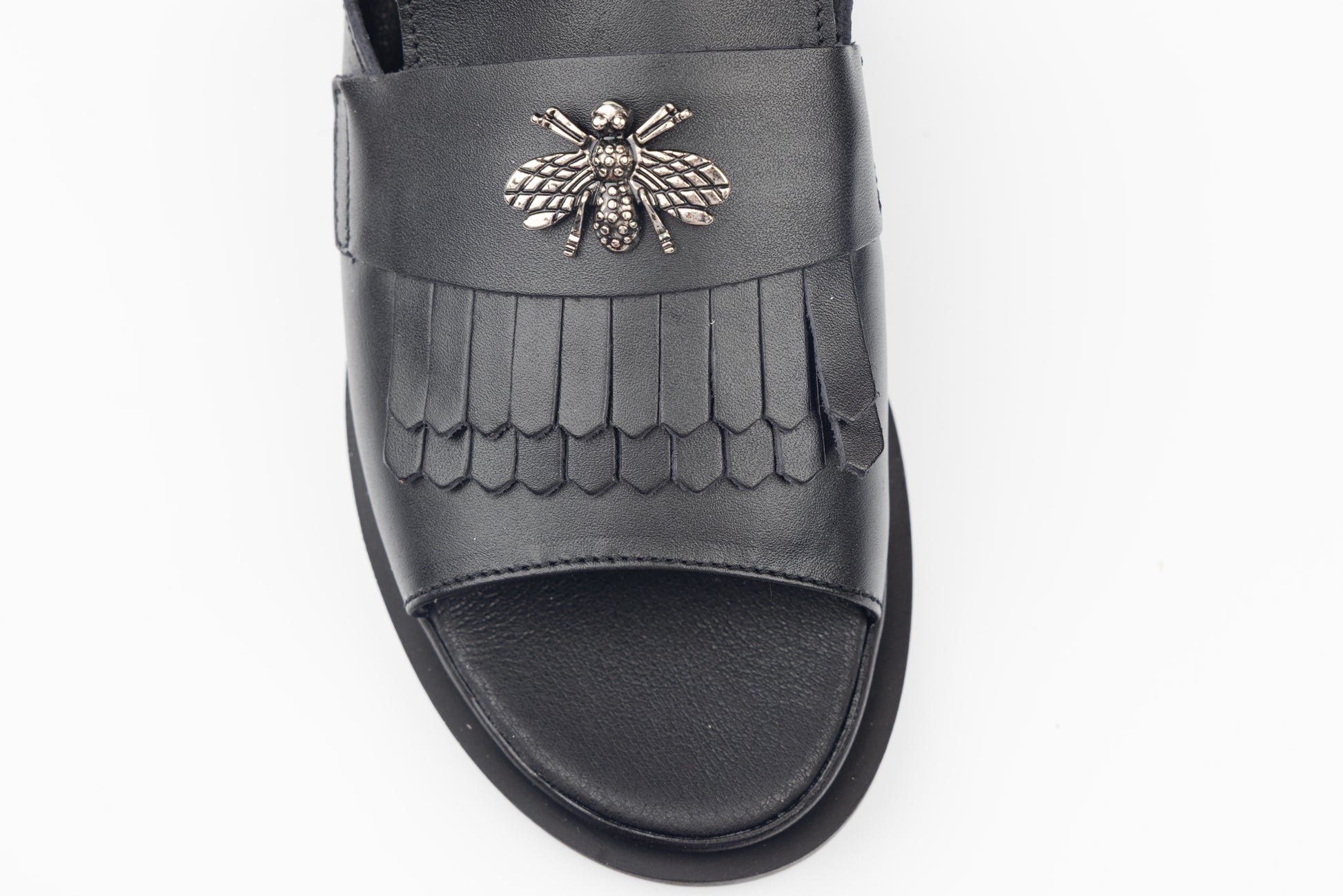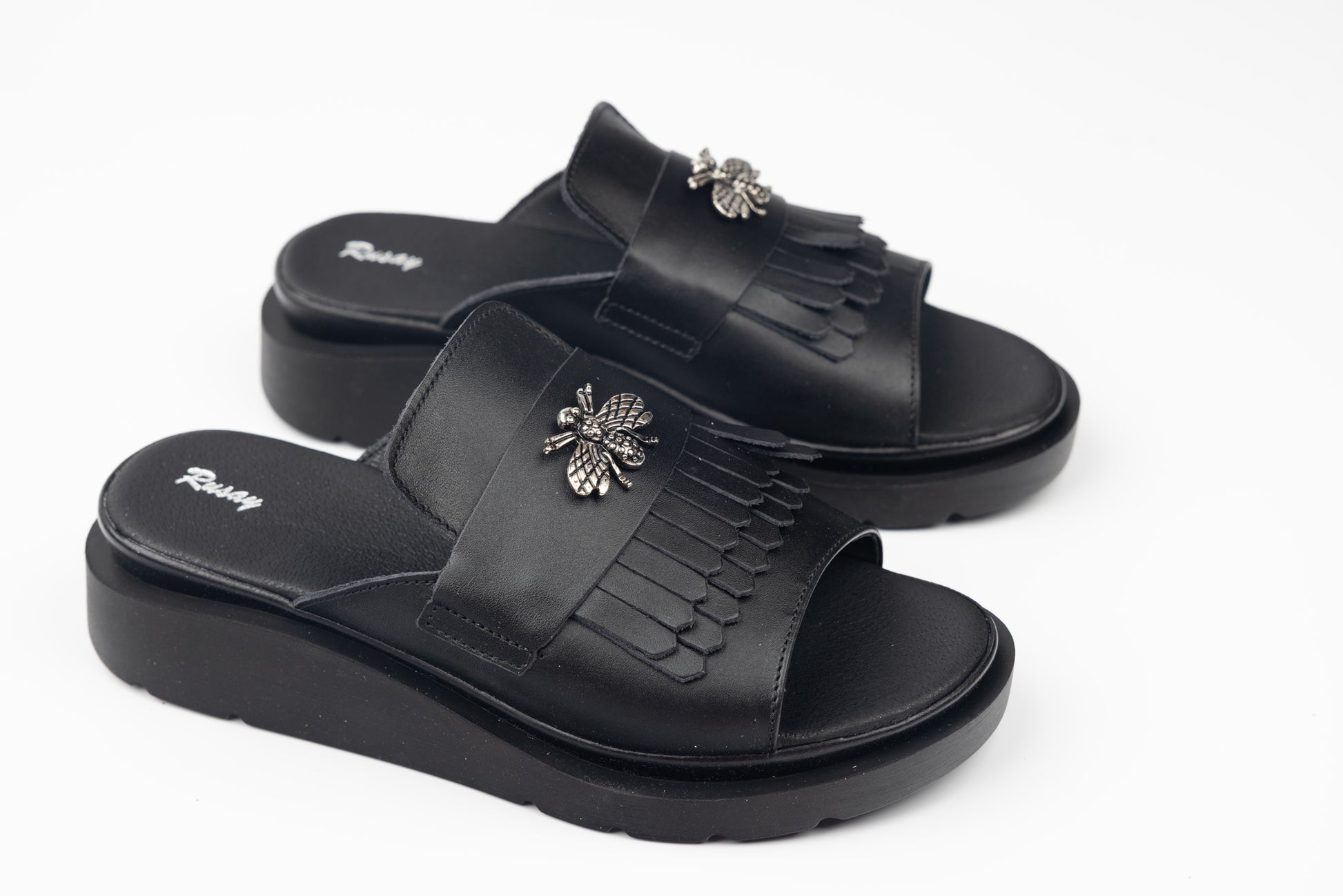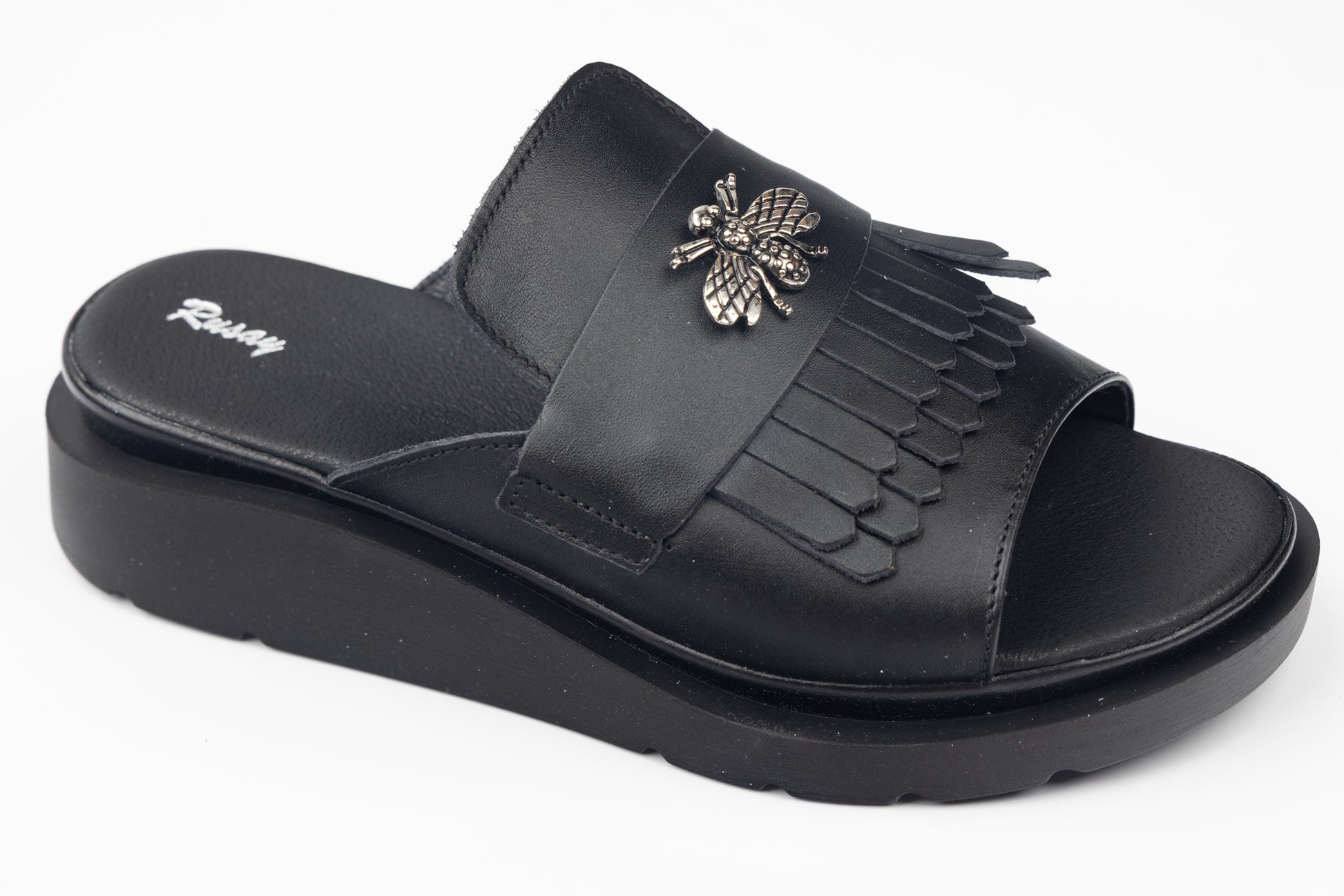 Saboti dama RUSAY din piele naturala cu accesoriu albinuță metalica si cu o talpa ortopedica cu inaltimea de 3 cm cusuti pe margini ofera maximum de confort la purtarea lor atat in interior cat si exterior. Greutatea unui singur sabot este 190 grame.