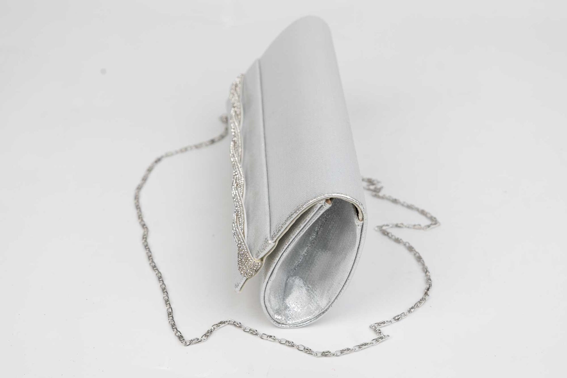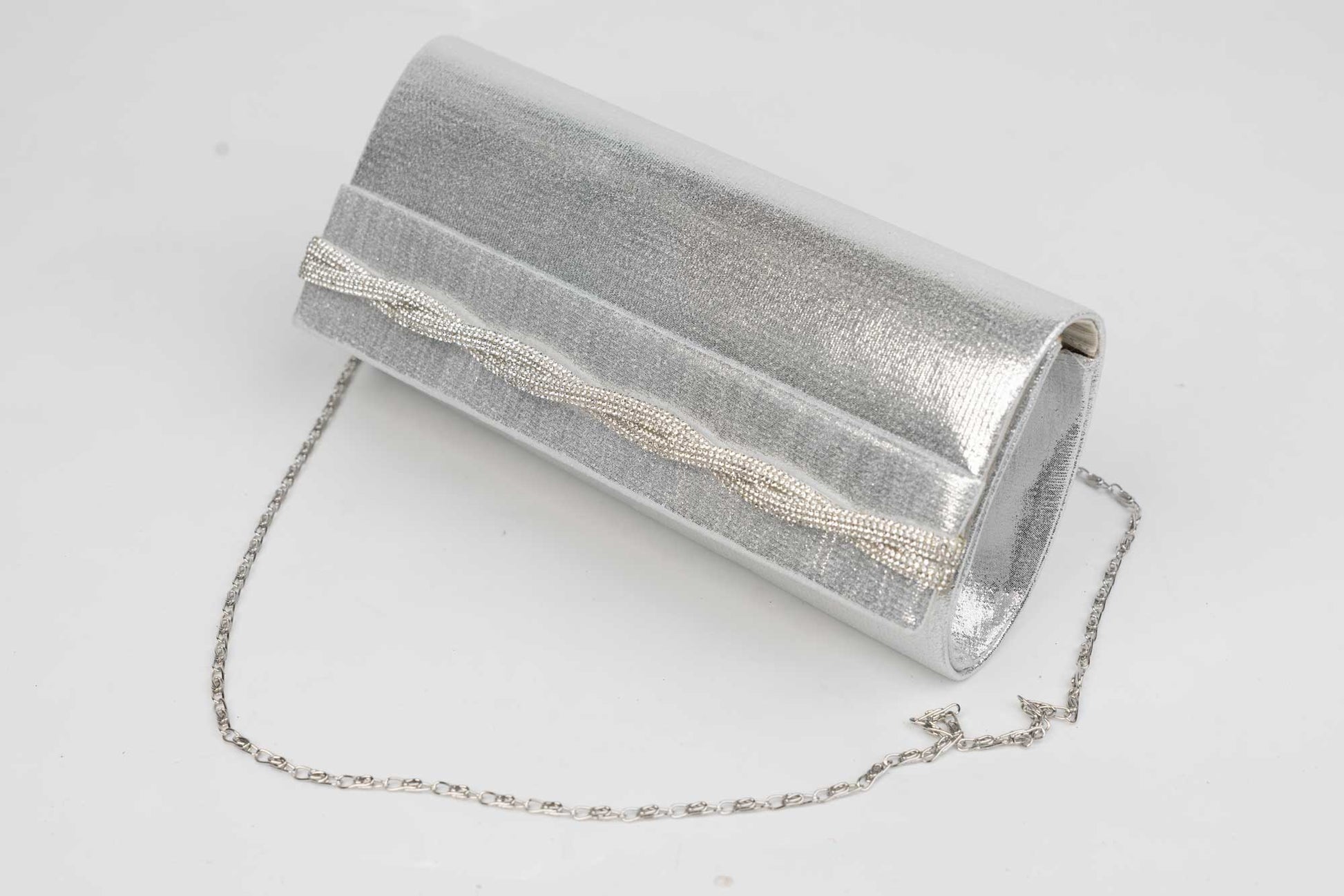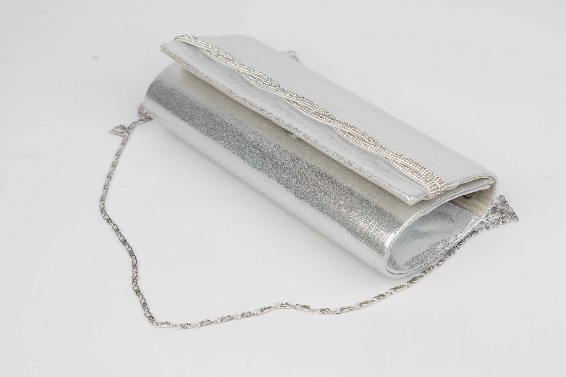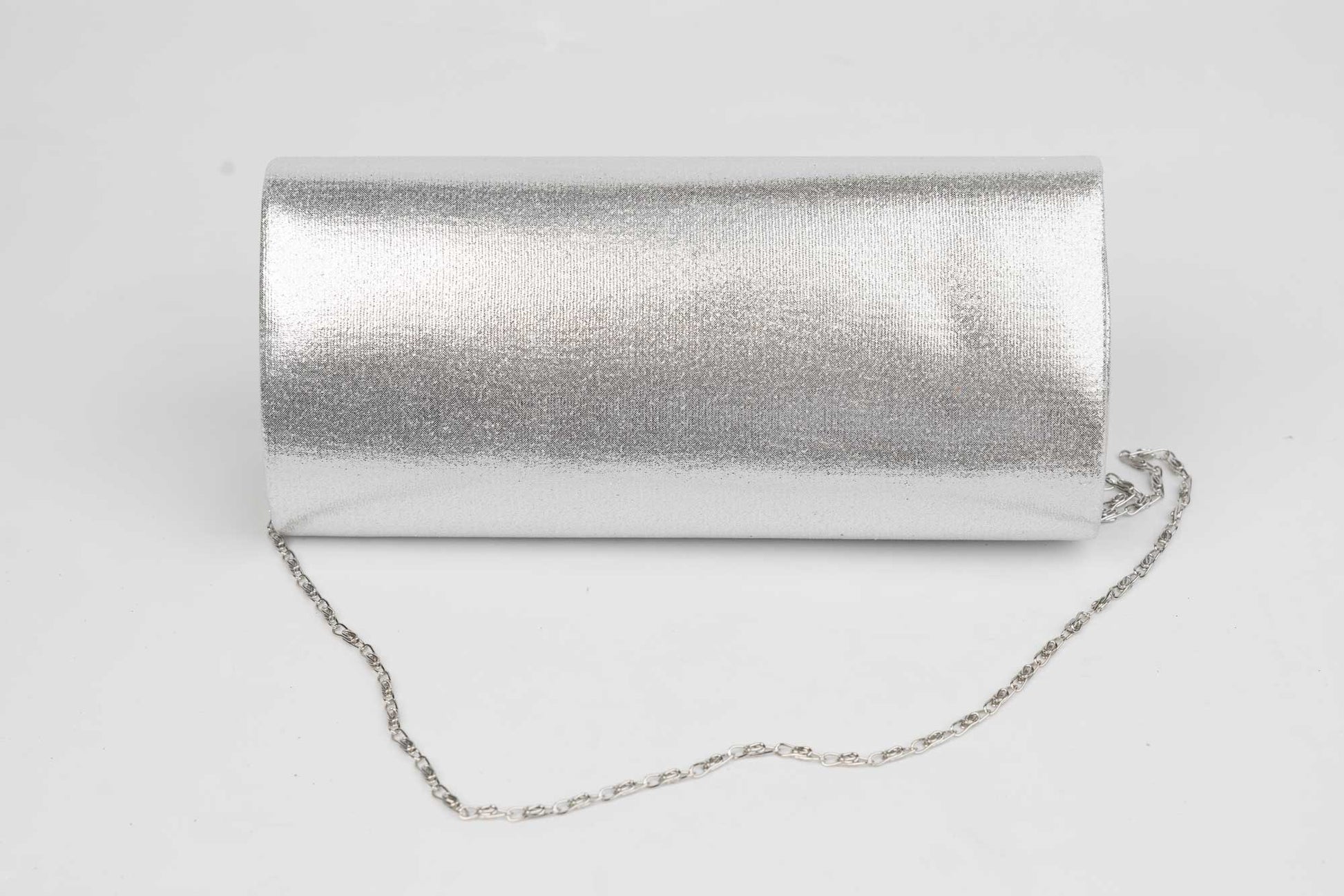 Un plic de dama de marime 23-11 cm cu efecte sclipitoare argintii avand in dotare o curelusa lant metalice detasabile. Interiorul este unicameral (1 compartiment) si este potrivit si incapator pentru un telefon sau cosmetice. Inchiderea se face cu o clapeta metalica cu magnet in partea laterala a plicului.