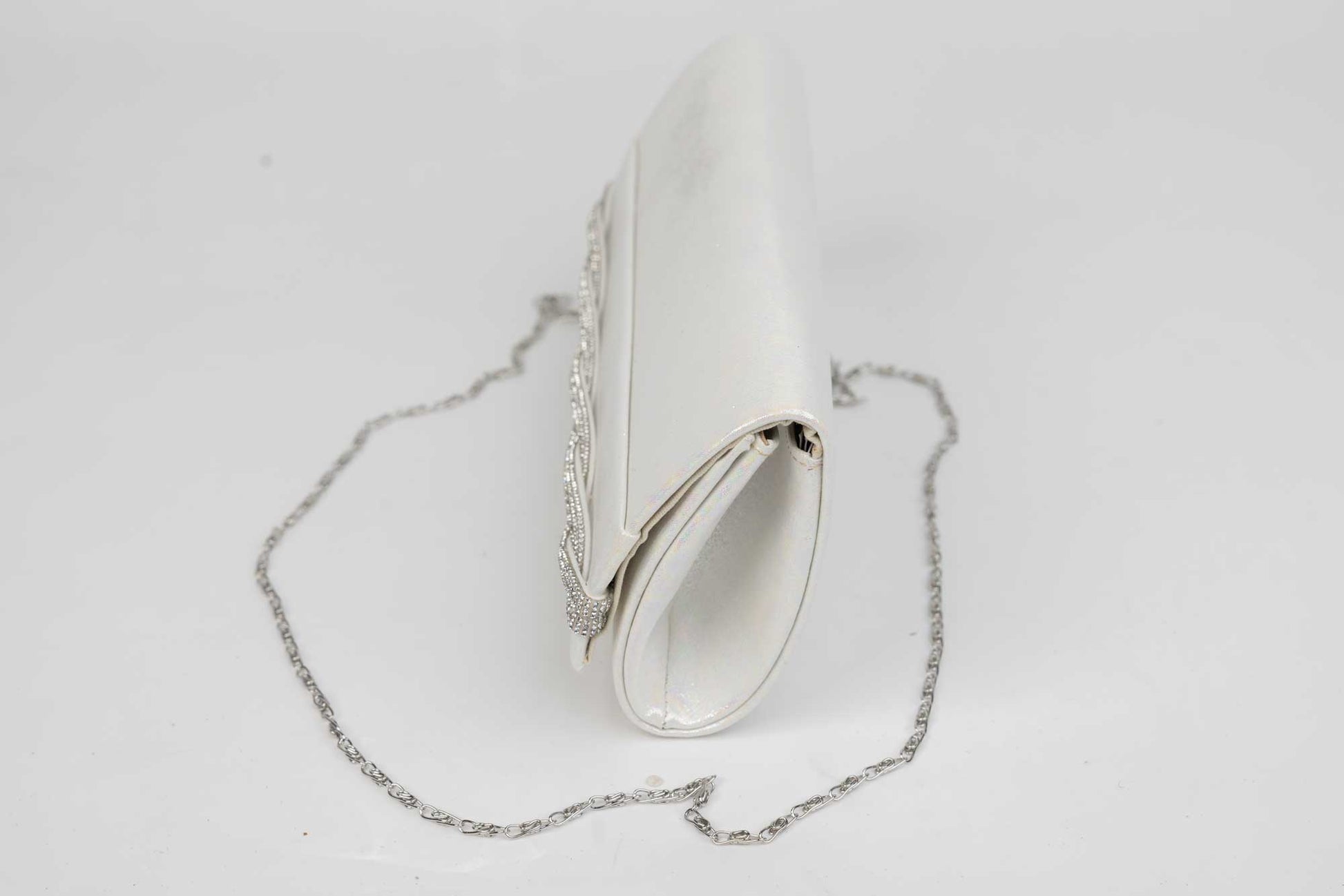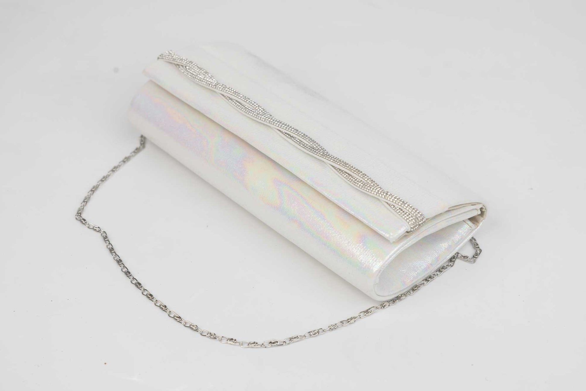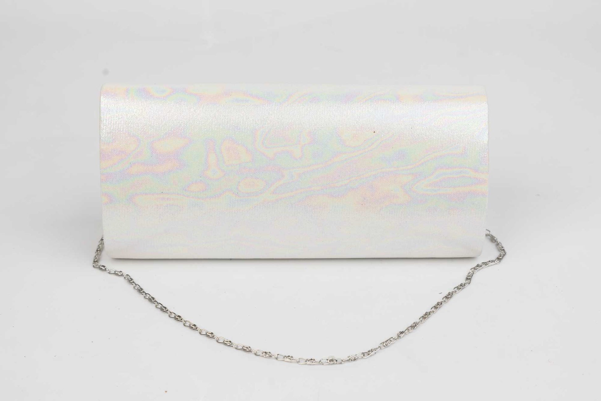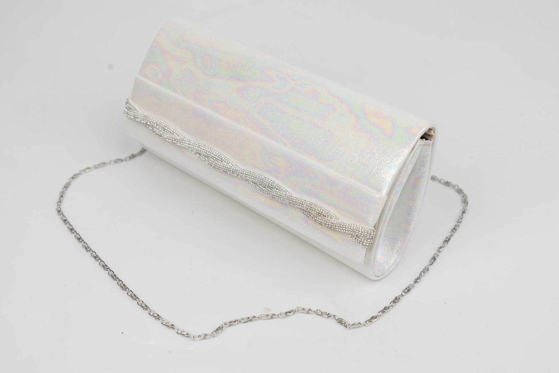 Un plic de dama crem sidef de marime 23-11 cm cu elemente sclipitoare argintii avand in dotare o curelusa lant metalice detasabile. Interiorul este unicameral (1 compartiment) si este potrivit si incapator pentru un telefon sau cosmetice. Inchiderea se face cu o clapeta metalica cu magnet in partea laterala a plicului.