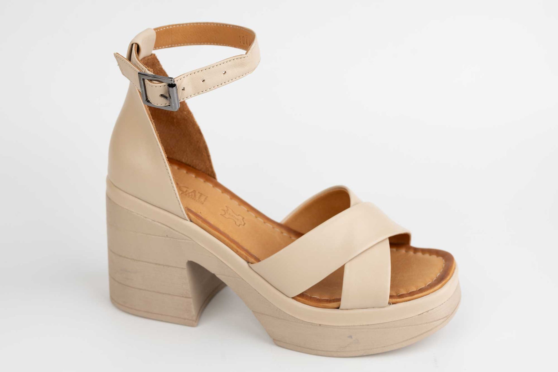 Sandale dama DOGATI din piele naturala cu talpa groasa si toc patrat captusite la interior cu piele naturala avand prinderea cu o catarama pe o bareta in spatele piciorului. Inclinatia lina a piciorului in aceste sandale face mult mai comoda purtarea lor un timp indelungat fiind recomandate chiar si pentru picioare cu mont pentru ca le acopera in intregime. Greutatea unui singur picior este de 250 grame.