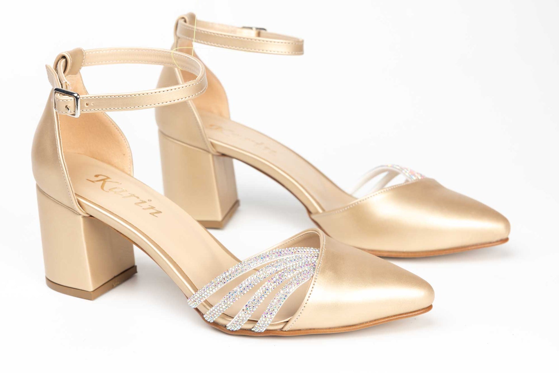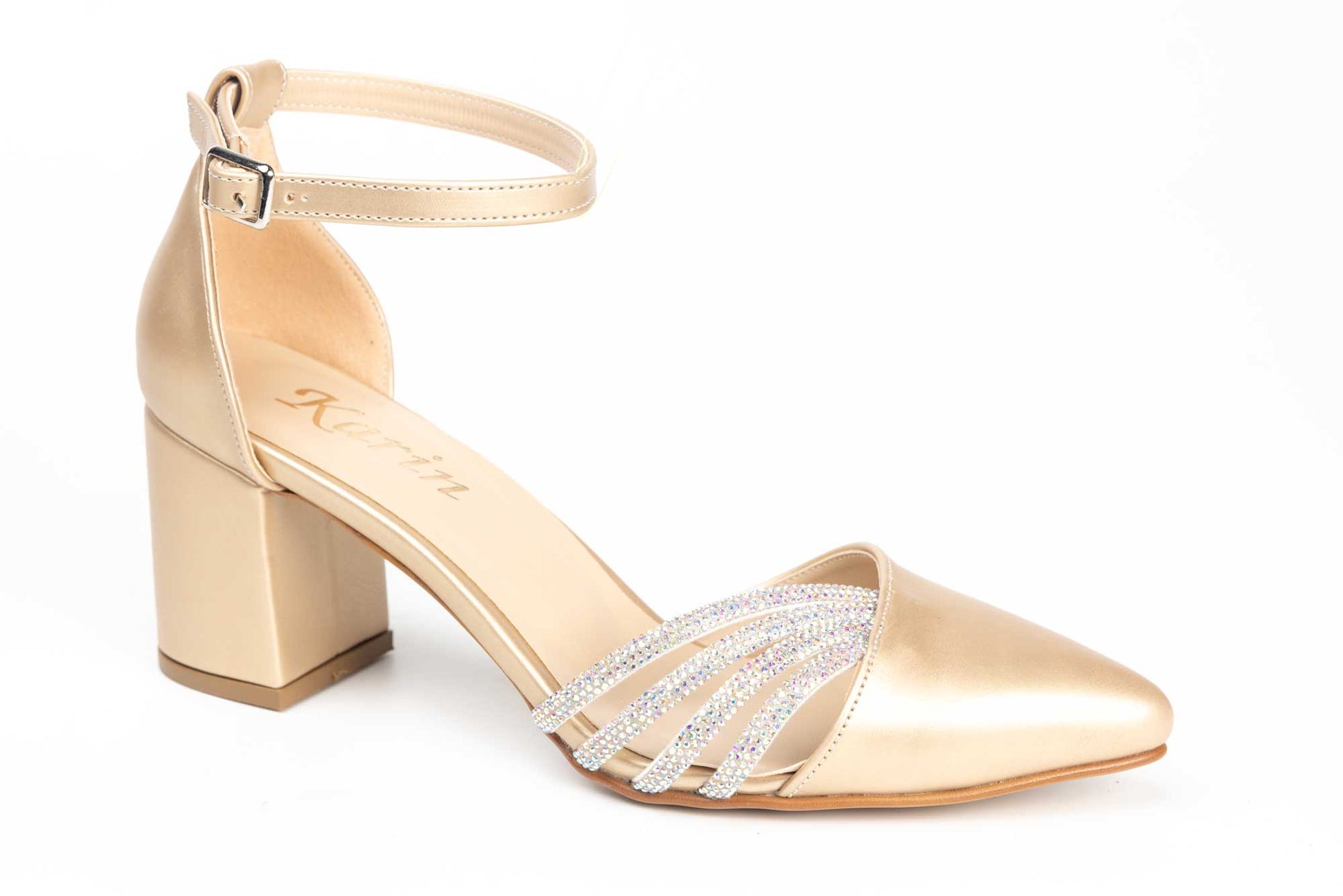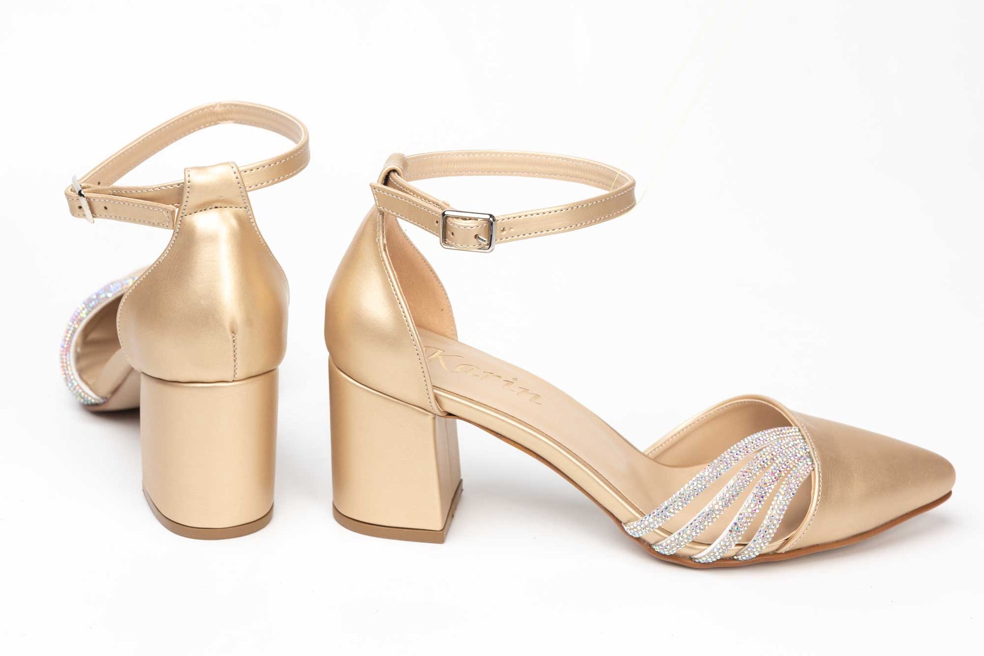 Pantofi KARIN de dama decupati din piele ecologica de calitate cu prindere intr-o bareta peste glezna avand la partea din fata 4 barete de cristal care se imbina perfect la acest model. tocul este unul patrat cu inaltimea de 5 cm care confera piciorului o inclinatie perfecta si comoda. Greutatea unui singur pantof este de 220 grame.