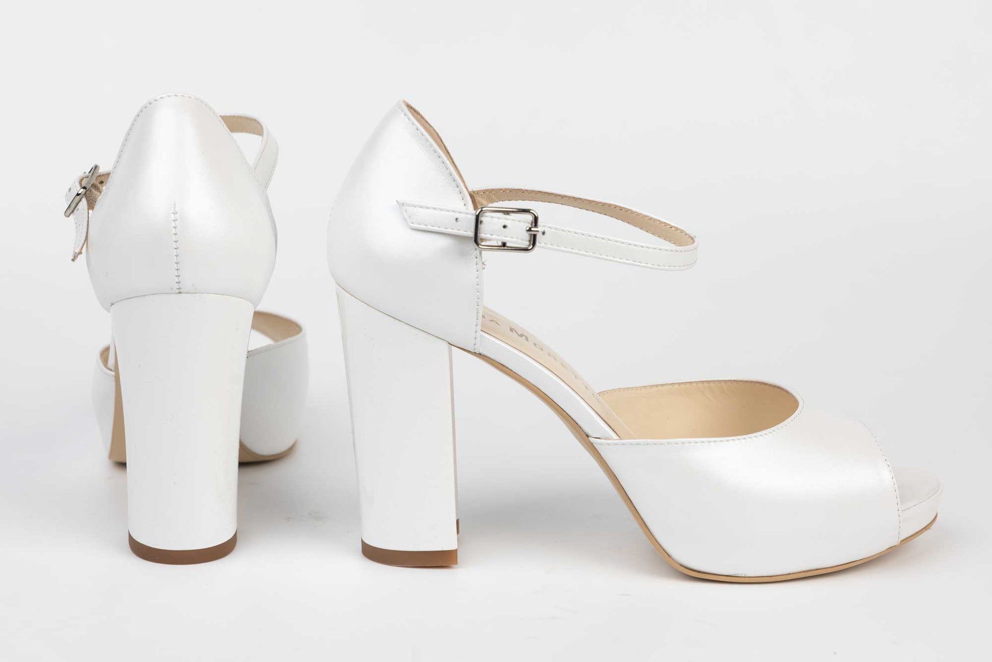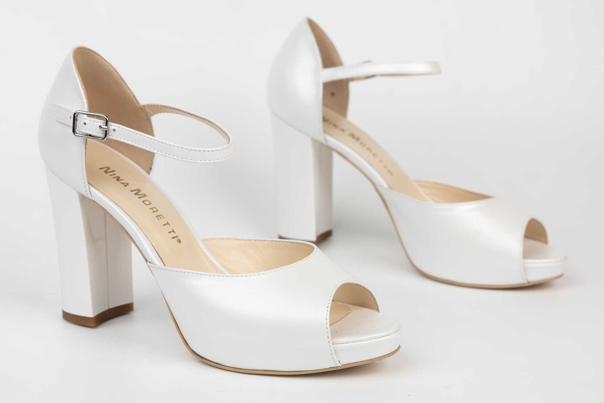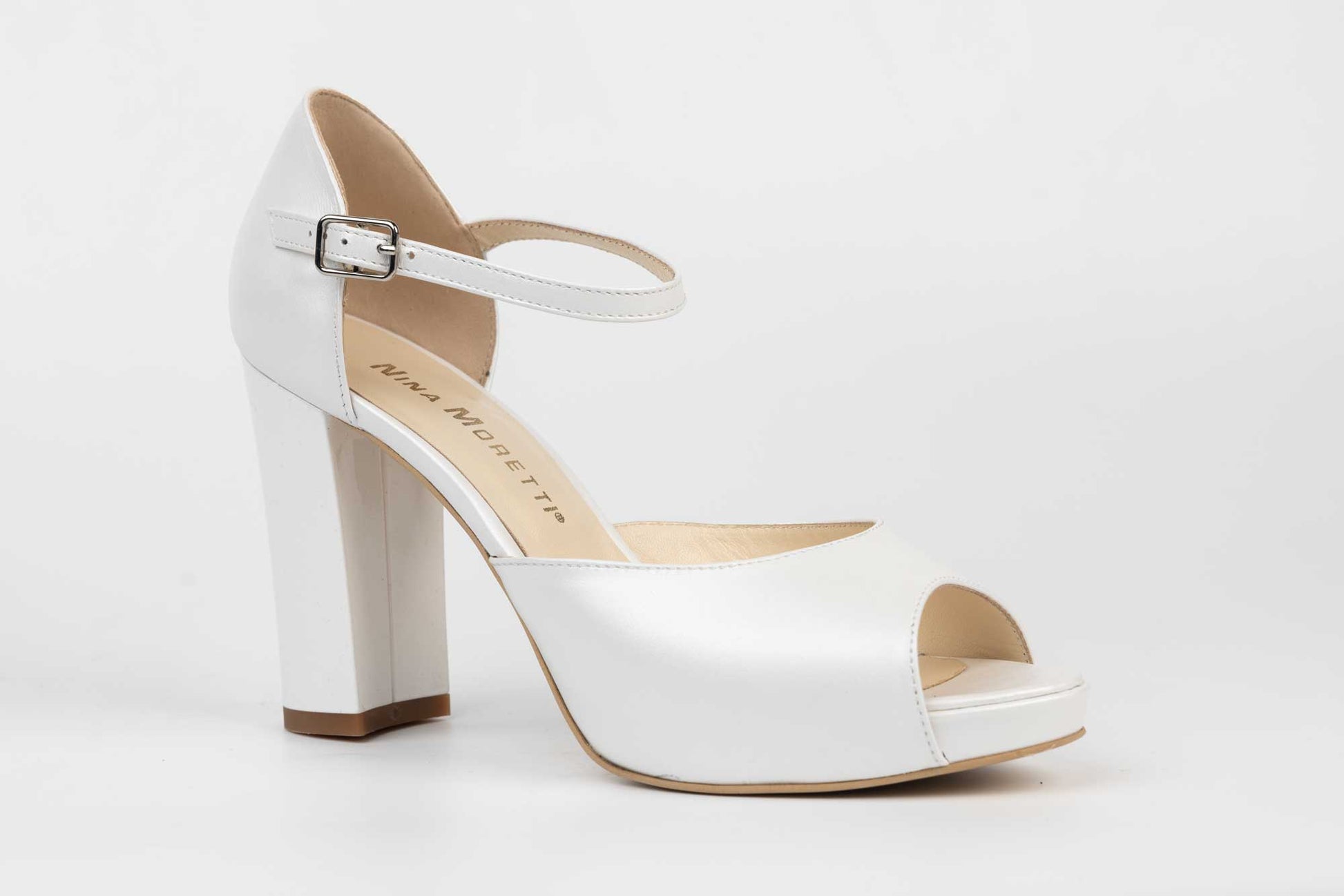 Sandale mireasa NINA OCHINNI din piele naturală cu toc gros de 10 cm înălțime foarte stabil la mers având la partea din fata o platforma de 1 cm înălțime care conferă o înclinație lina și confortabila piciorului. Prinderea baretei se face cu o catarama fina.