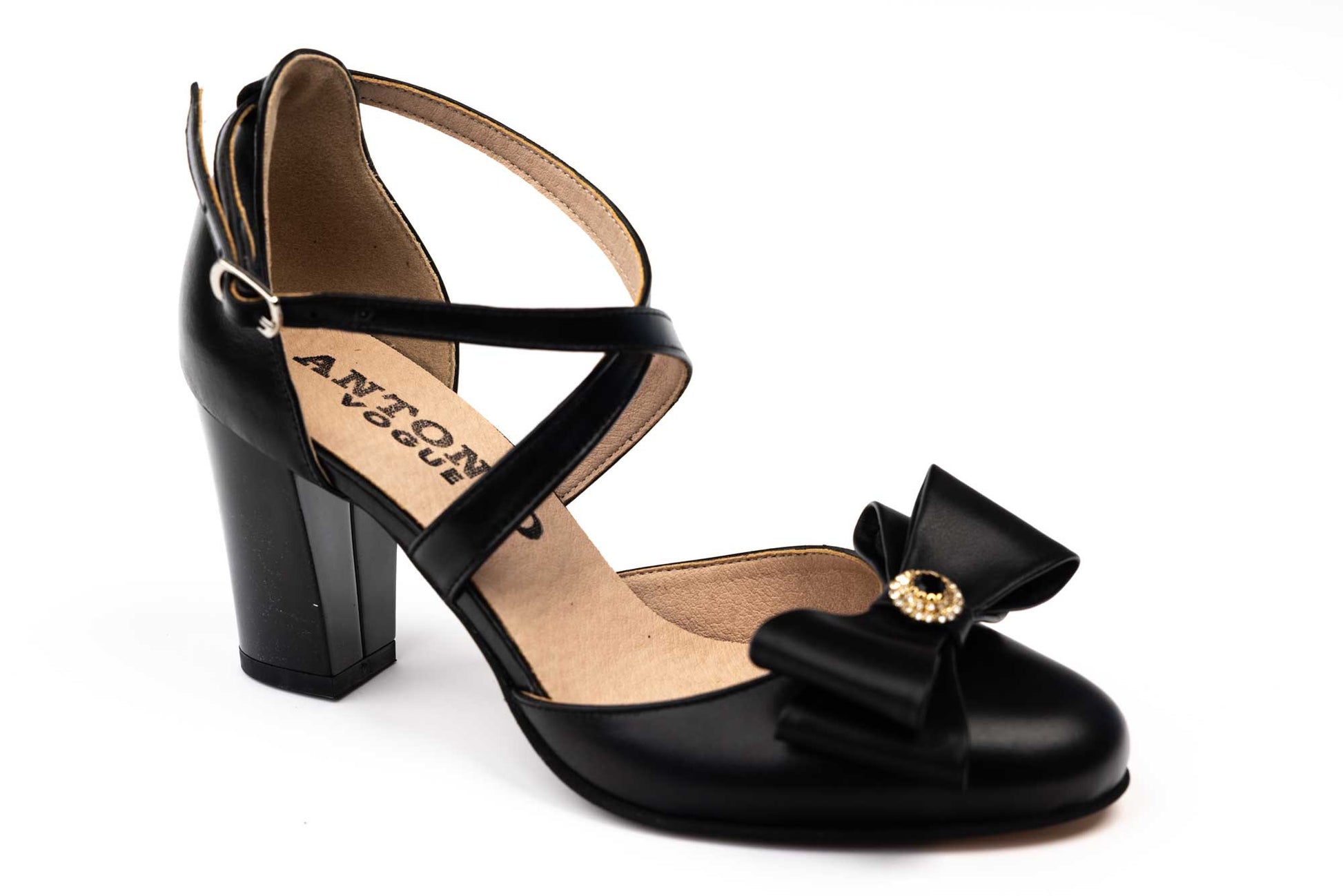 Pantofi ANTONIO de dama din piele naturala cu toc gros de 7 cm inaltime si cu prindere pe picior cu 2 barete in forma de X cu o catarama avand varful rotund pe care este aplicat o fundita din piele cu o floricica cu cristale. Greutatea unui singur pantof este de 295 grame.
