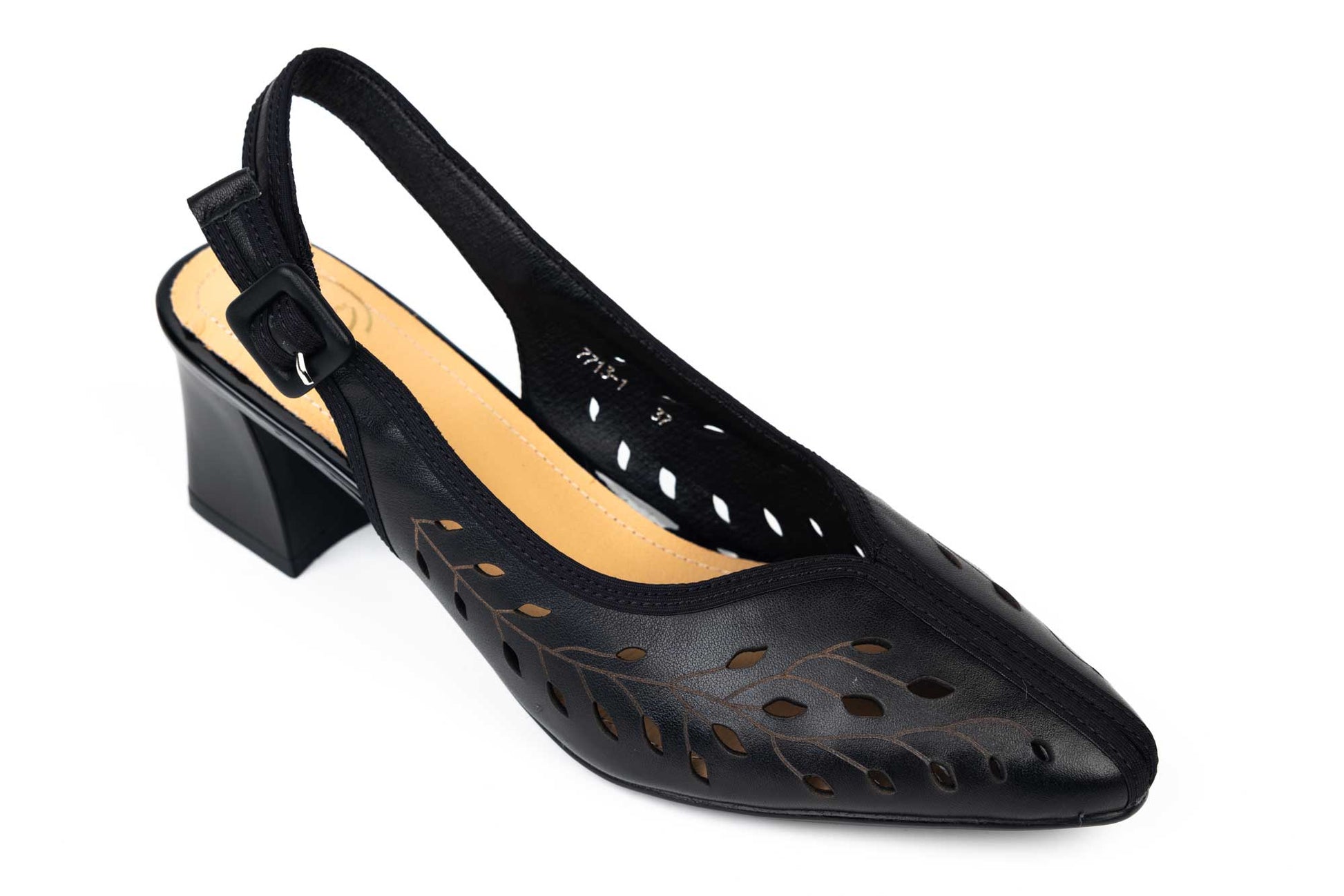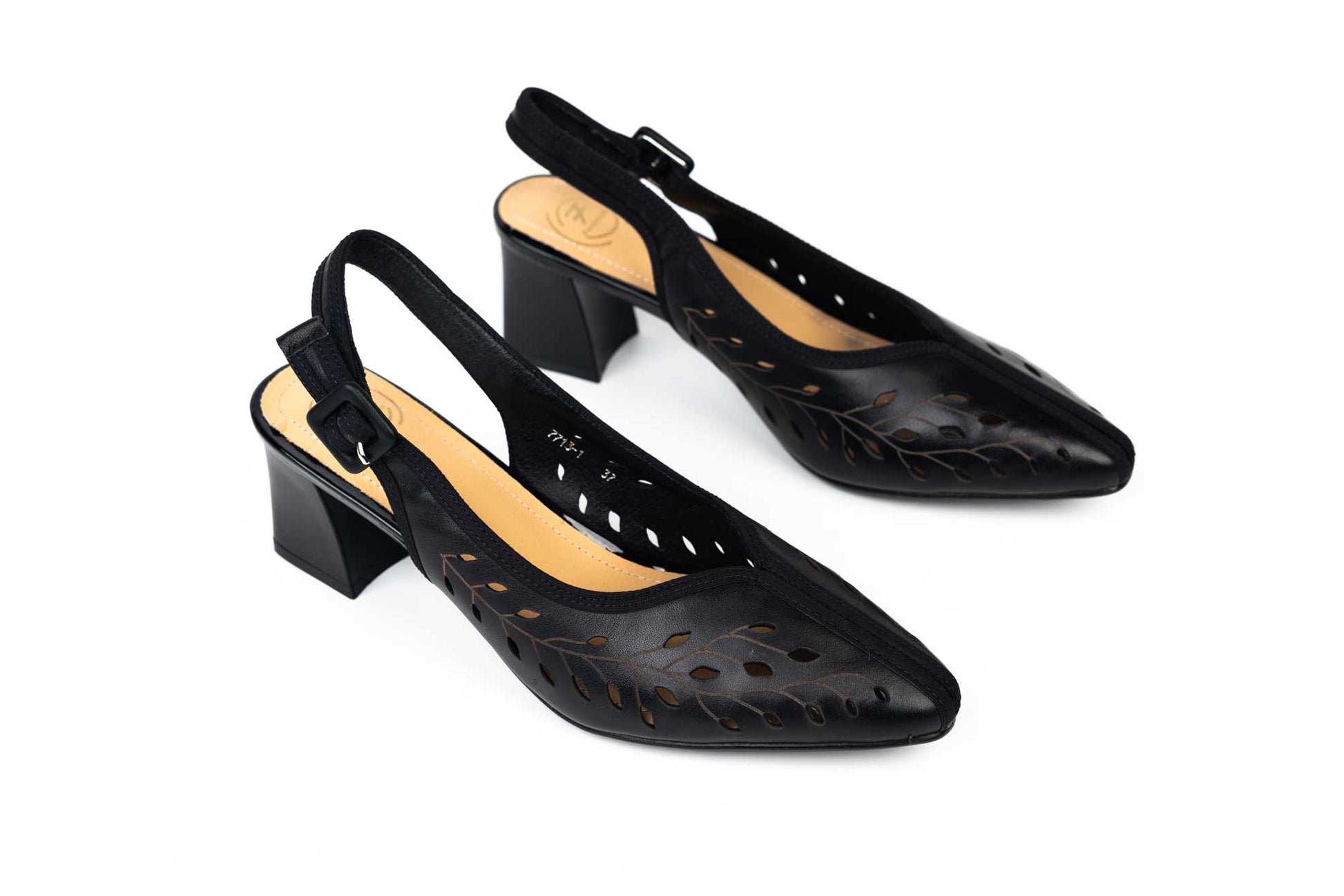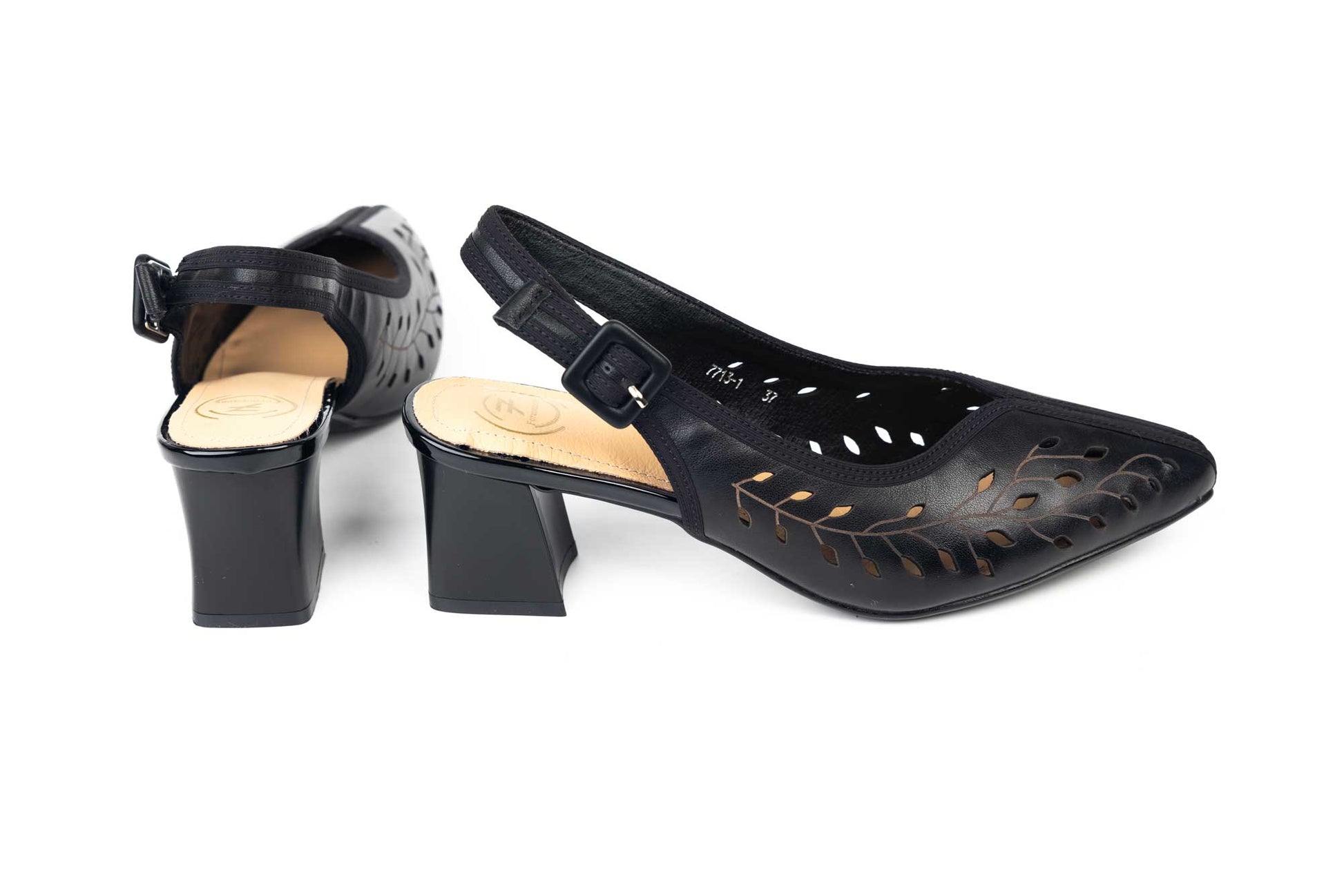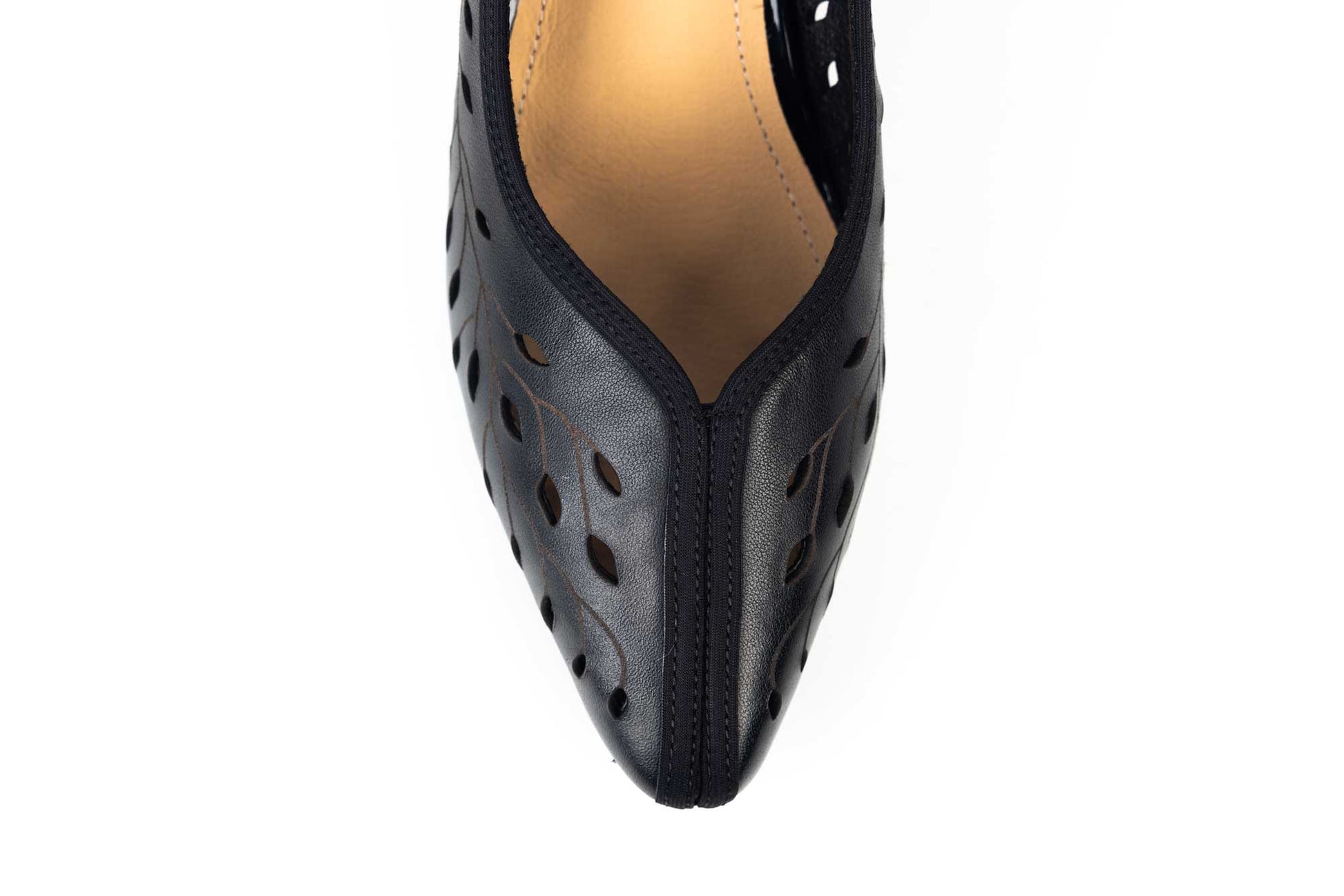 Pantofi FORMAZIONE de dama din piele naturala decupati la spate si perforati cu laserul avand un toc patrat de 5 cm ceea ce confera un confort sporit si stabilitate mai buna la mers. Prinderea se face cu o catarama iar pe interior are montat un brant cu memory moale facand ca acest model sa se potriveasca usor la picioarele mai late si acopera cu usurinta un eventual mont.