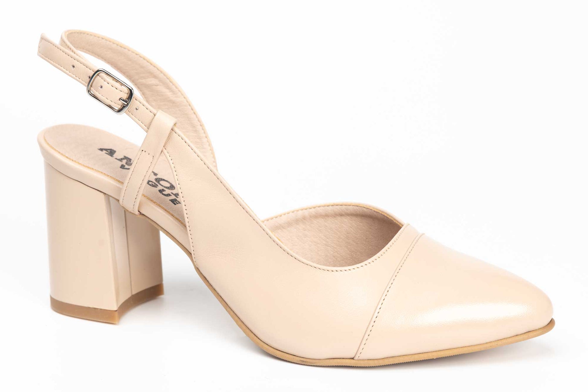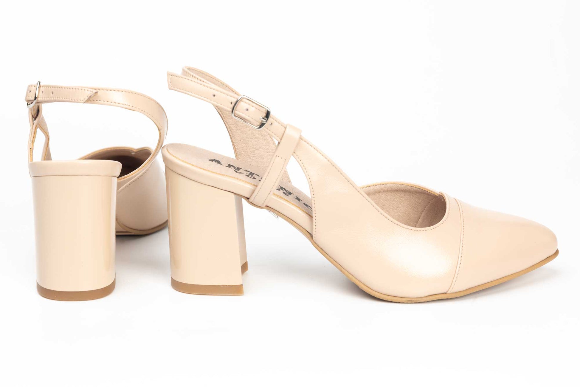 Pantofi ANTONIO de dama decupati la spate din piele naturala cu prindere deasupra calcaiului cu o bareta din piele avand tocul patrat de 7 cm. Greutatea unui singur picior este de 240 grame. Recomandat pentru doamne cu picior mai lat sau cu mont.
