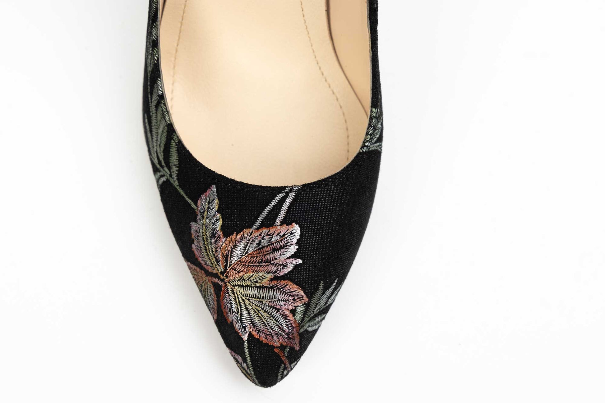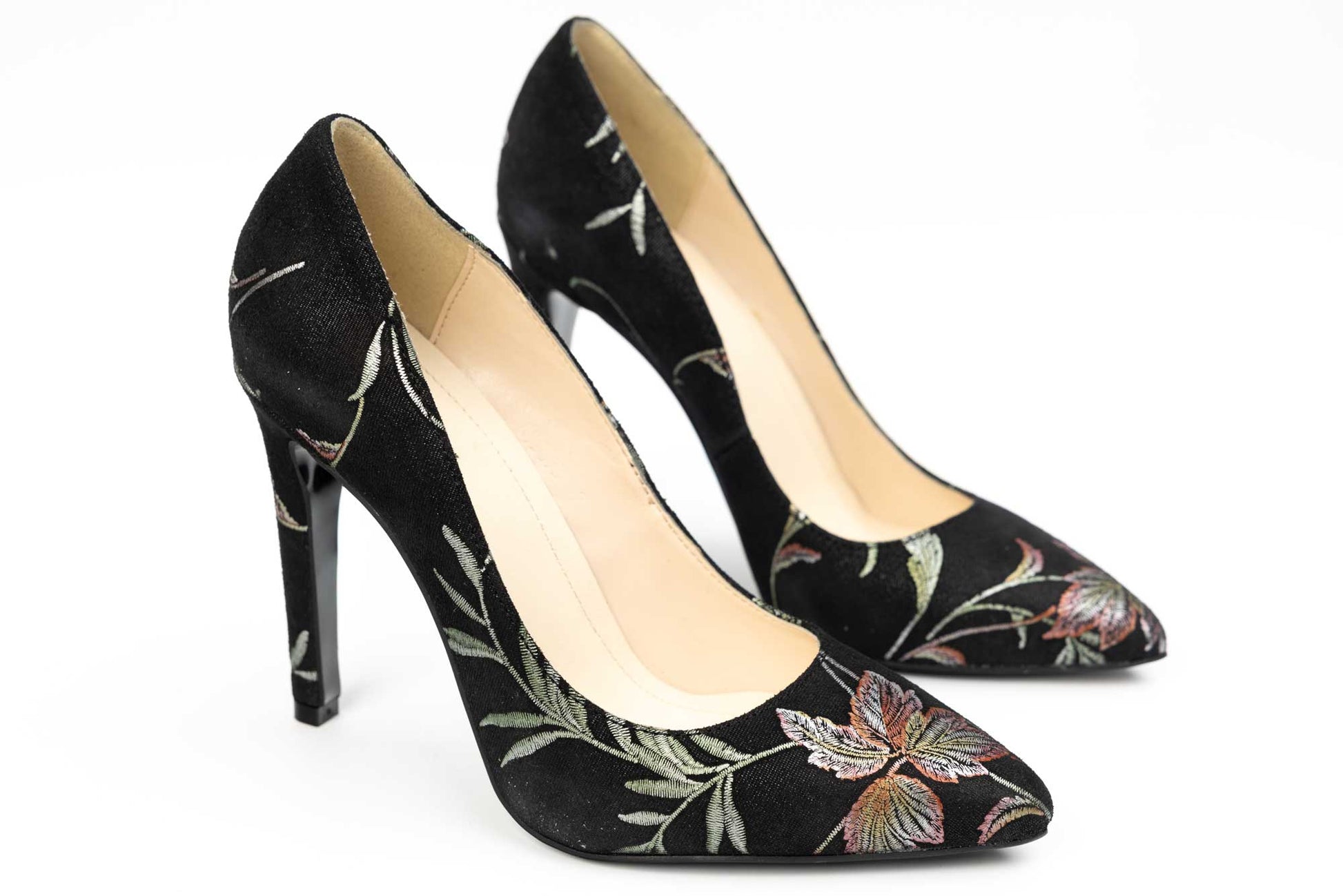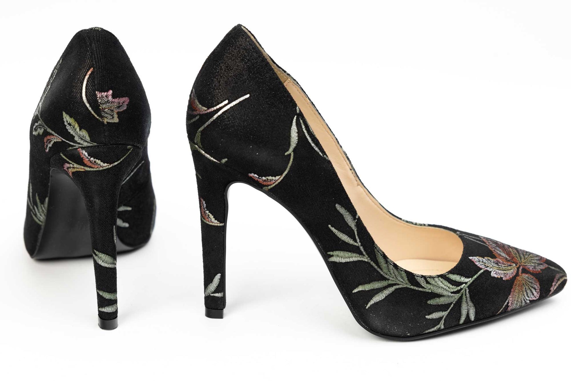 Pantofi PERLA de dama din piele naturală cu imprimeu floral, având un toc subtire cu înălțimea de 9 cm oferind piciorului înclinația potrivită pentru mers și stabilitate. Greutatea unui singur picior este de 230 grame.